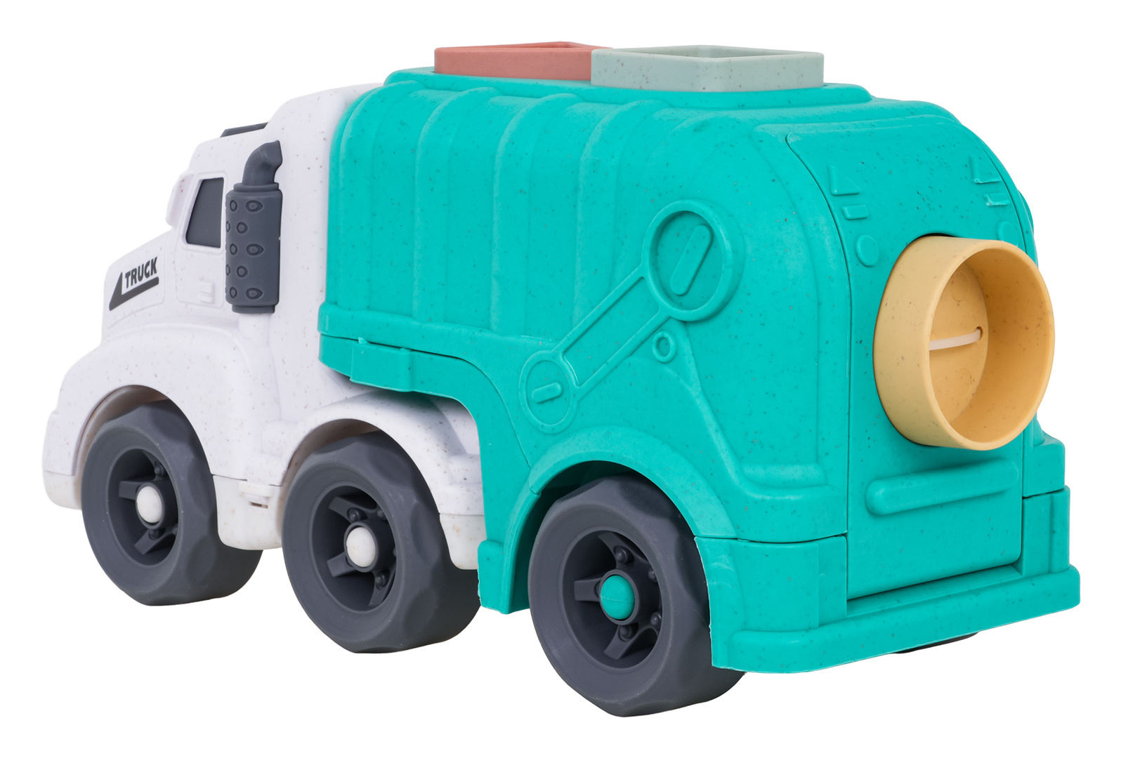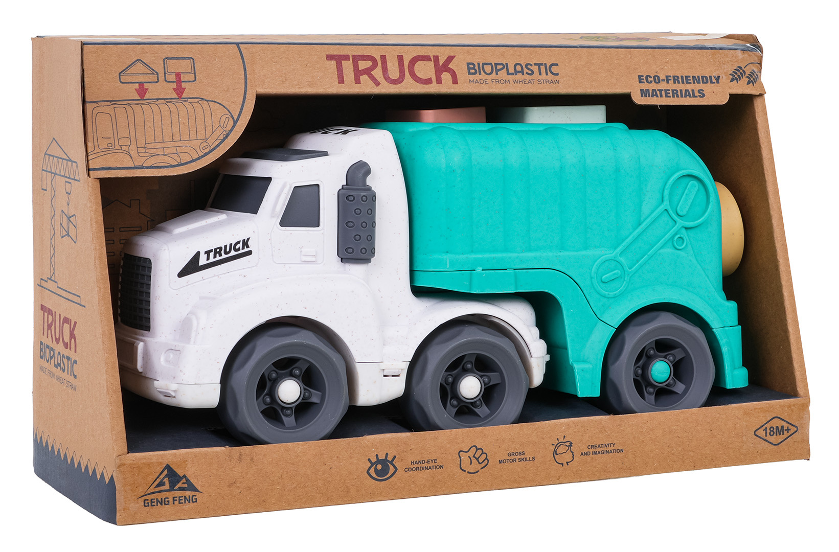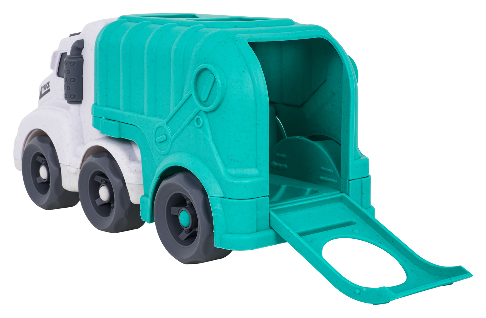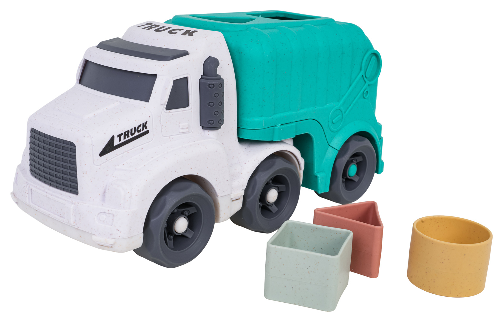 Vozidlo popelářský vůz s třídičem a kostkami, vyrobené z BIOplastiku pro děti od osmnácti měsíců, z ekologické série, šetrné k životnímu prostředí. Vozidlo bylo vyrobeno s důrazem na detaily, v krásných živých barvách a nemá ostré hrany. Na střeše popelářského vozu a na zadních dveřích se nachází tvarový třídič, kostky jsou součástí sady.