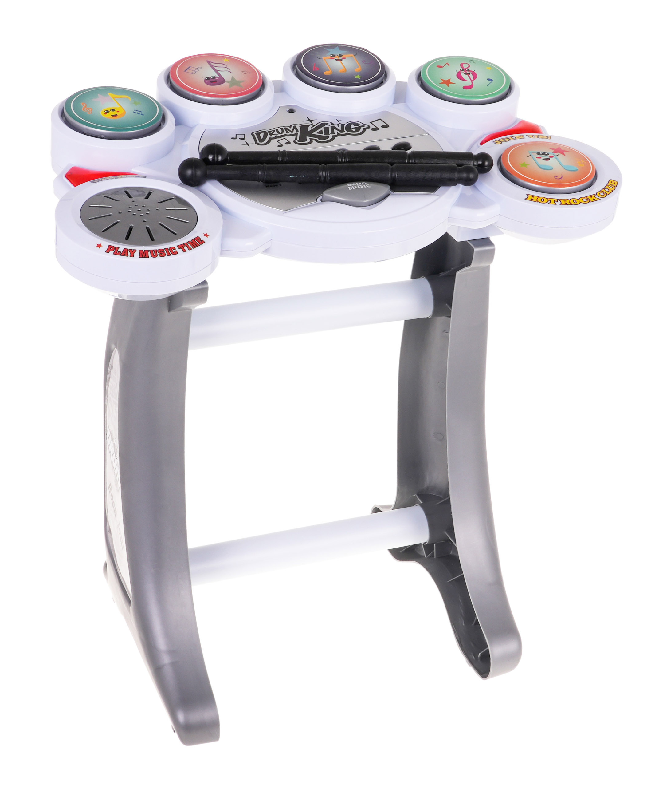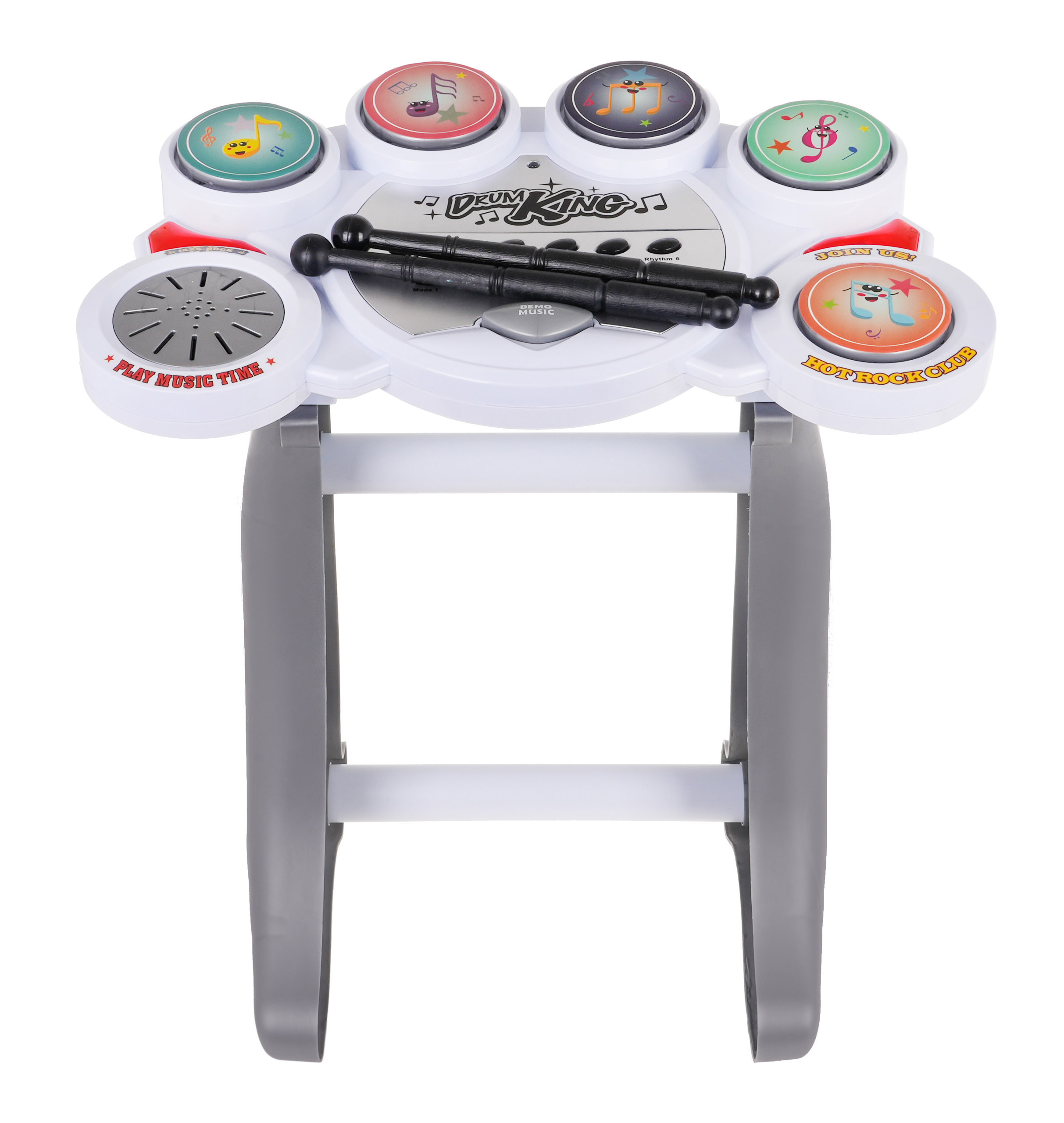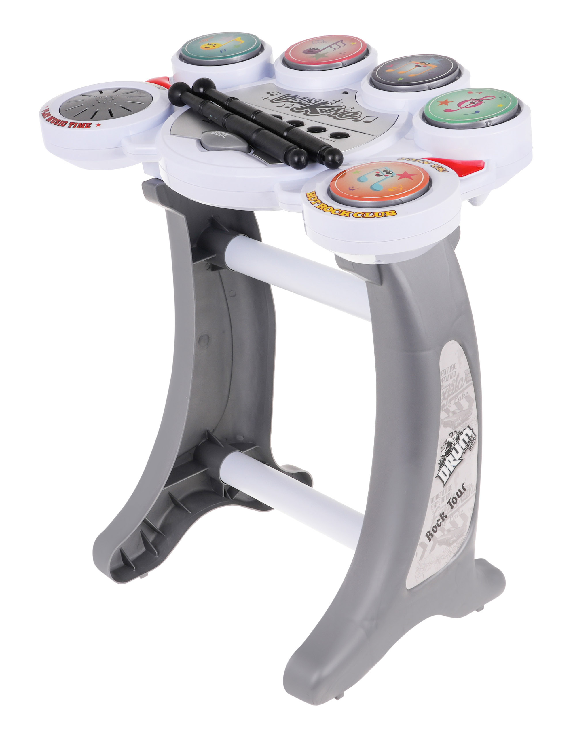 Elektronické bicí na stojanu s 5 pady a židličkou jsou určeny pro děti od 6 let. Sada je ideální pro začínající bubeníky. Bicí mají pět padů, na kterých můžeme vyloudit šest bubenických rytmů. Je také vybaven 5 ukázkovými melodiemi, ovládáním hlasitosti a tlačítkem pro reset. Bubny jsou napájeny 3 x 1,5V bateriemi AA, baterie nejsou součástí balení.