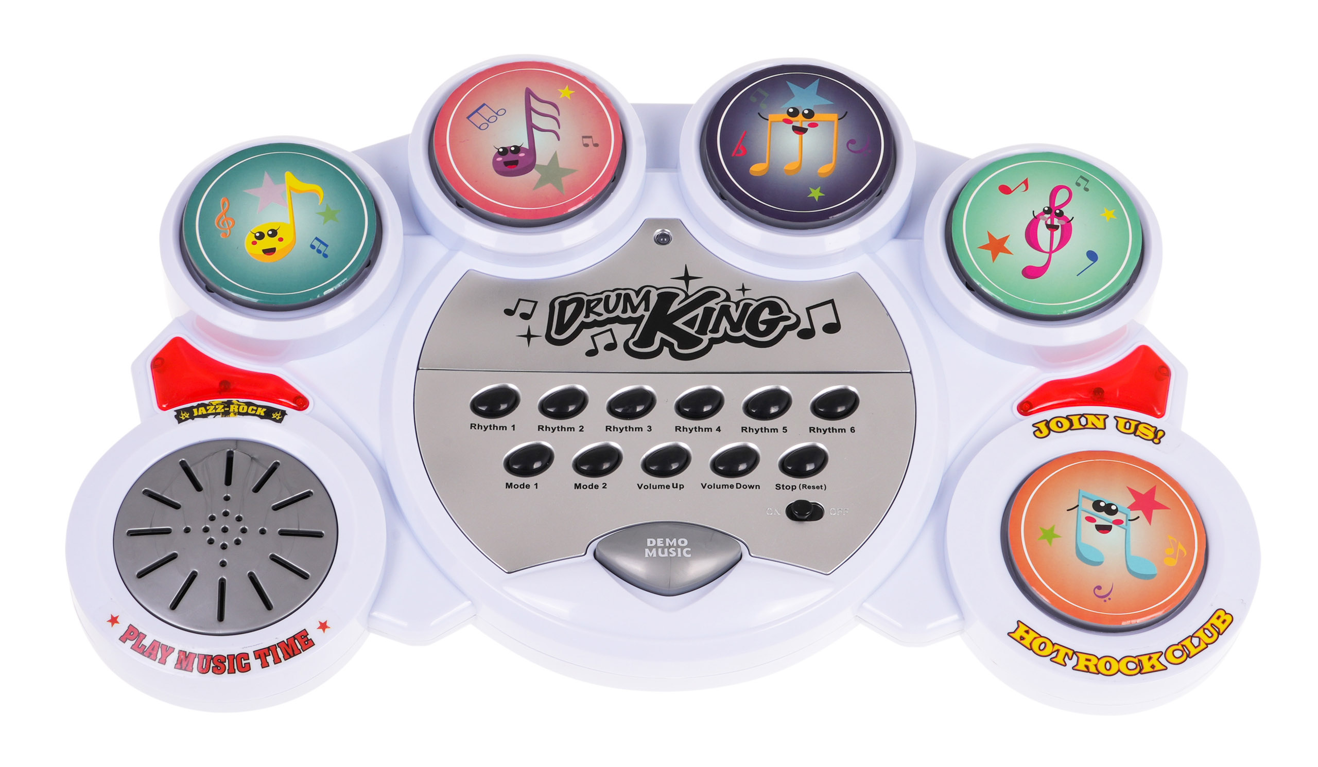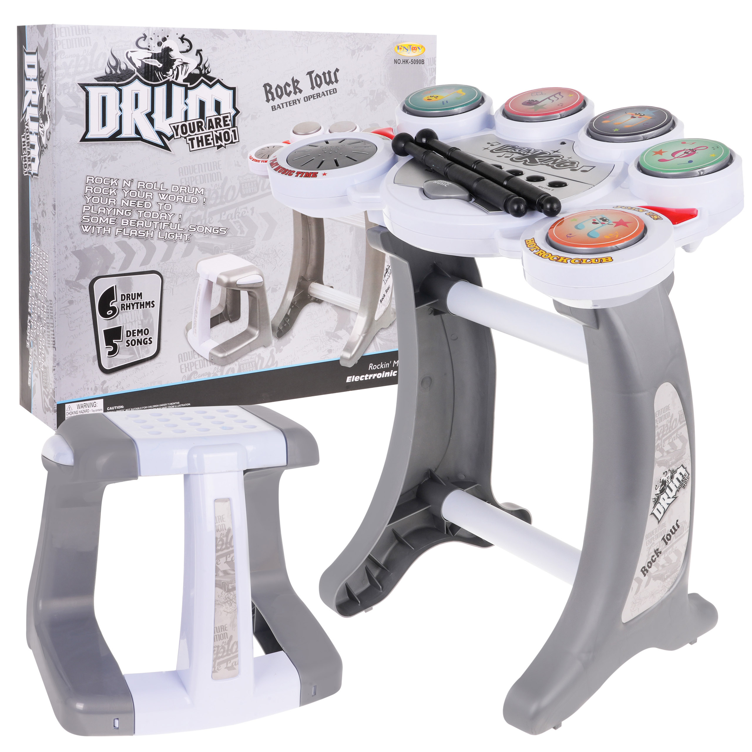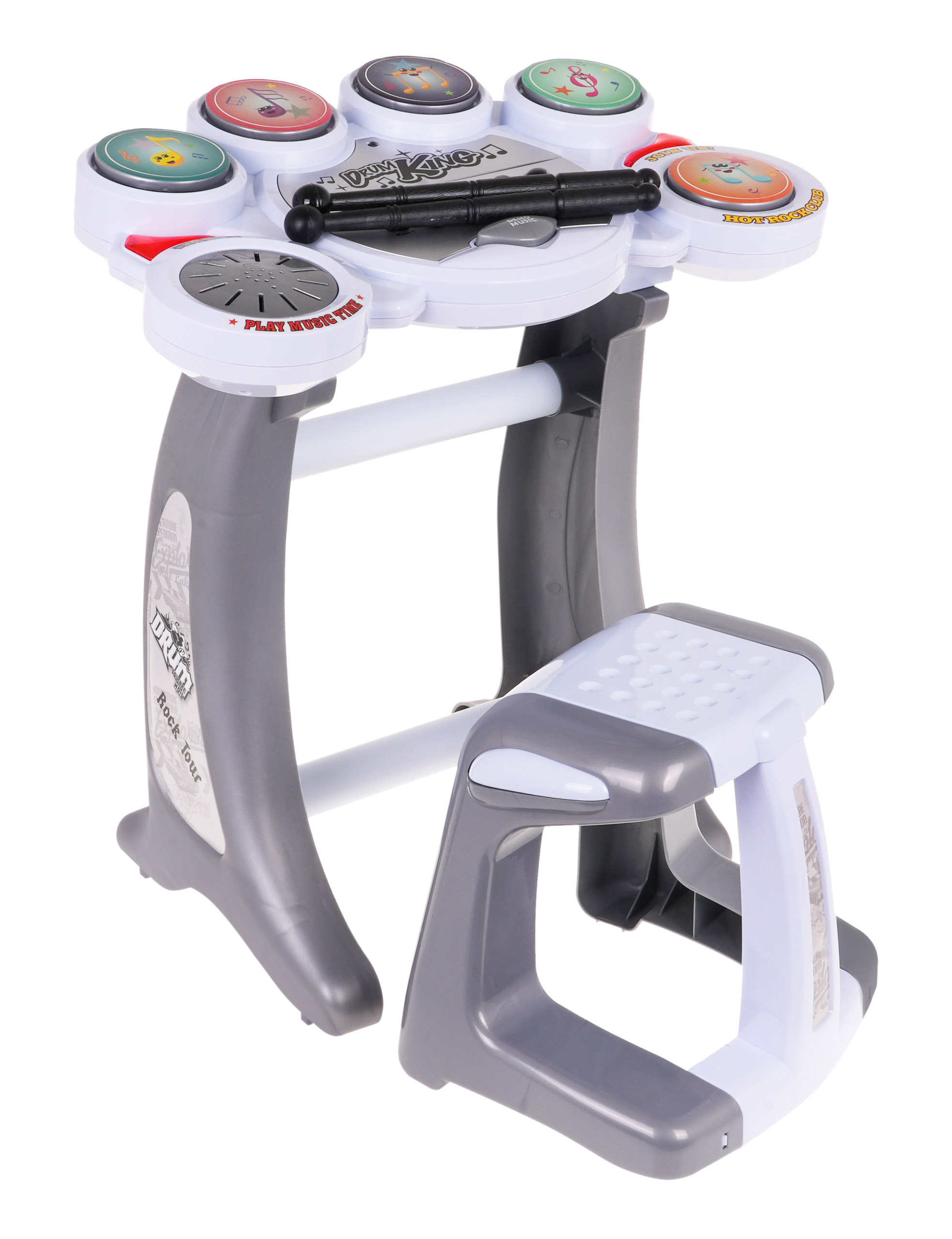 Elektronické bicí na stojanu s 5 pady a židličkou jsou určeny pro děti od 6 let. Sada je ideální pro začínající bubeníky. Bicí mají pět padů, na kterých můžeme vyloudit šest bubenických rytmů. Je také vybaven 5 ukázkovými melodiemi, ovládáním hlasitosti a tlačítkem pro reset. Bubny jsou napájeny 3 x 1,5V bateriemi AA, baterie nejsou součástí balení.