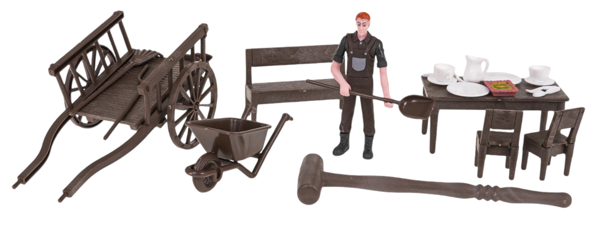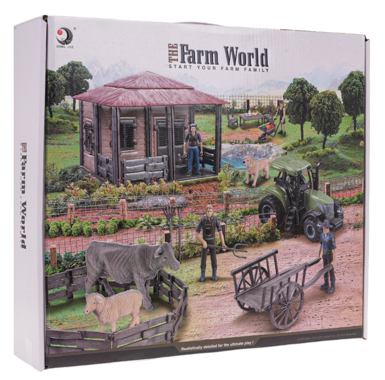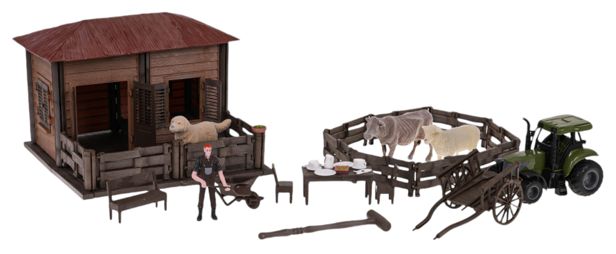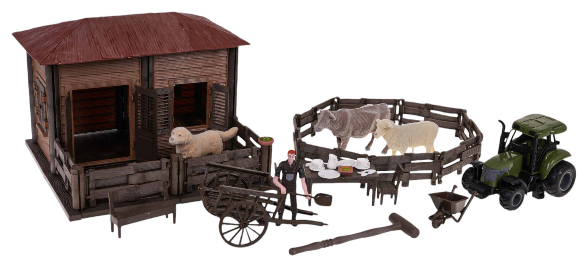 Sada farma, domek farmáře s traktorem a doplňky pro děti od 3 let. Sada byla vyrobena z nejkvalitnějších materiálů a obsahuje vše potřebné na farmě. Velký domek farmáře uvnitř obsahuje postel. Před domkem se nachází lavička a ohrada pro dobytek. Ve výběhu je kravička a ovečka. Nesměl chybět ani pejsek, který hlídá farmu, a nejdůležitější osoba na farmě, tedy farmář. Sada obsahuje také traktor, ruční vozík, zemědělské nástroje: lopatu, vidle, hrábě a kolečko. Sada je napájena bateriemi typu 3 x AG13 (včetně). Kráva, ovečka a pejsek vydávají zvuky charakteristické pro tato zvířátka.