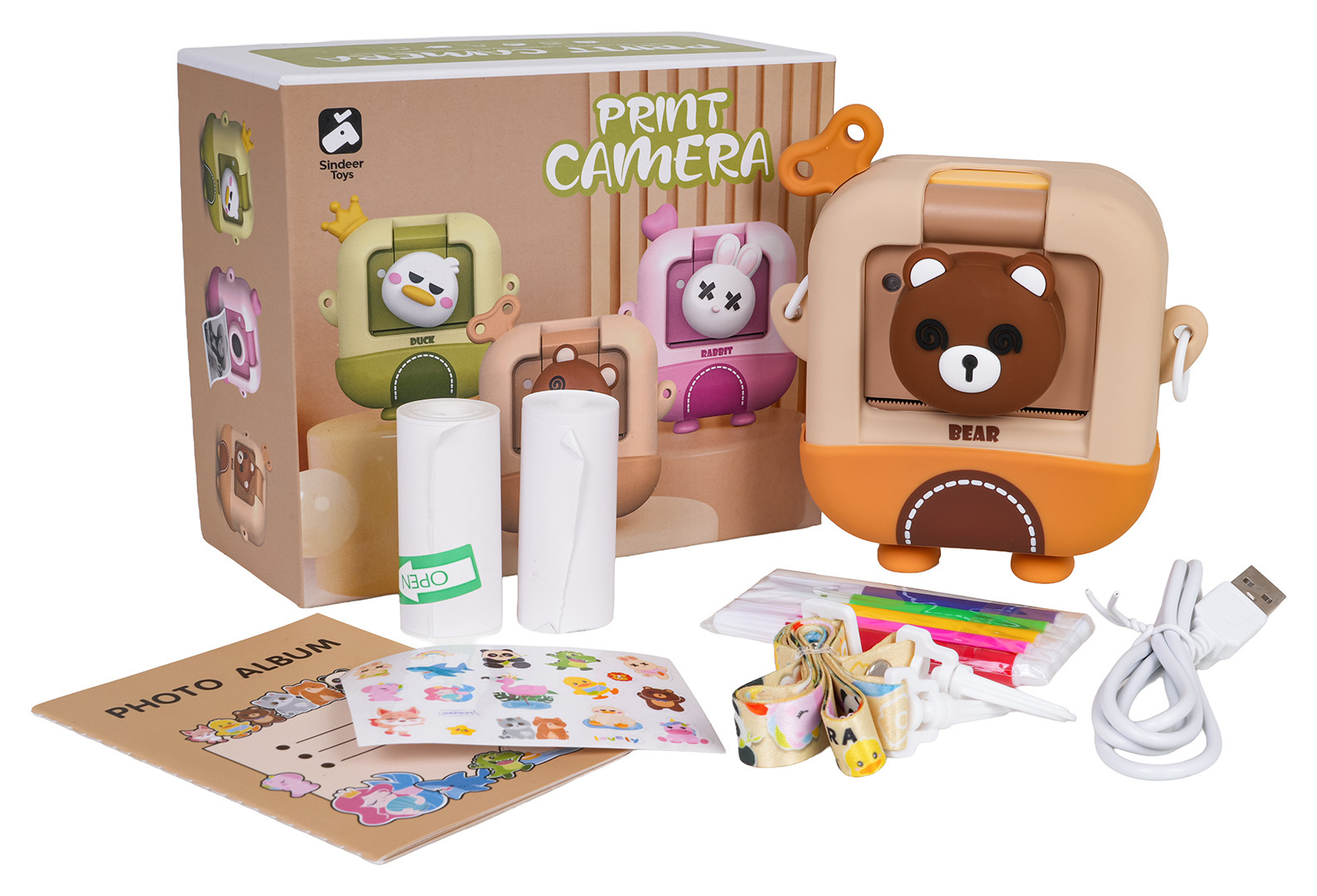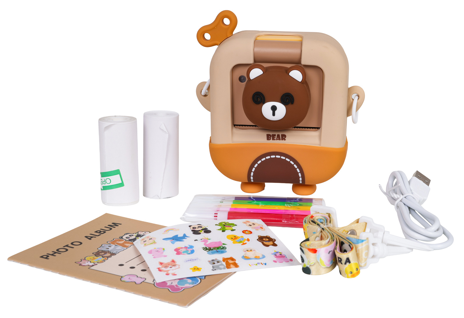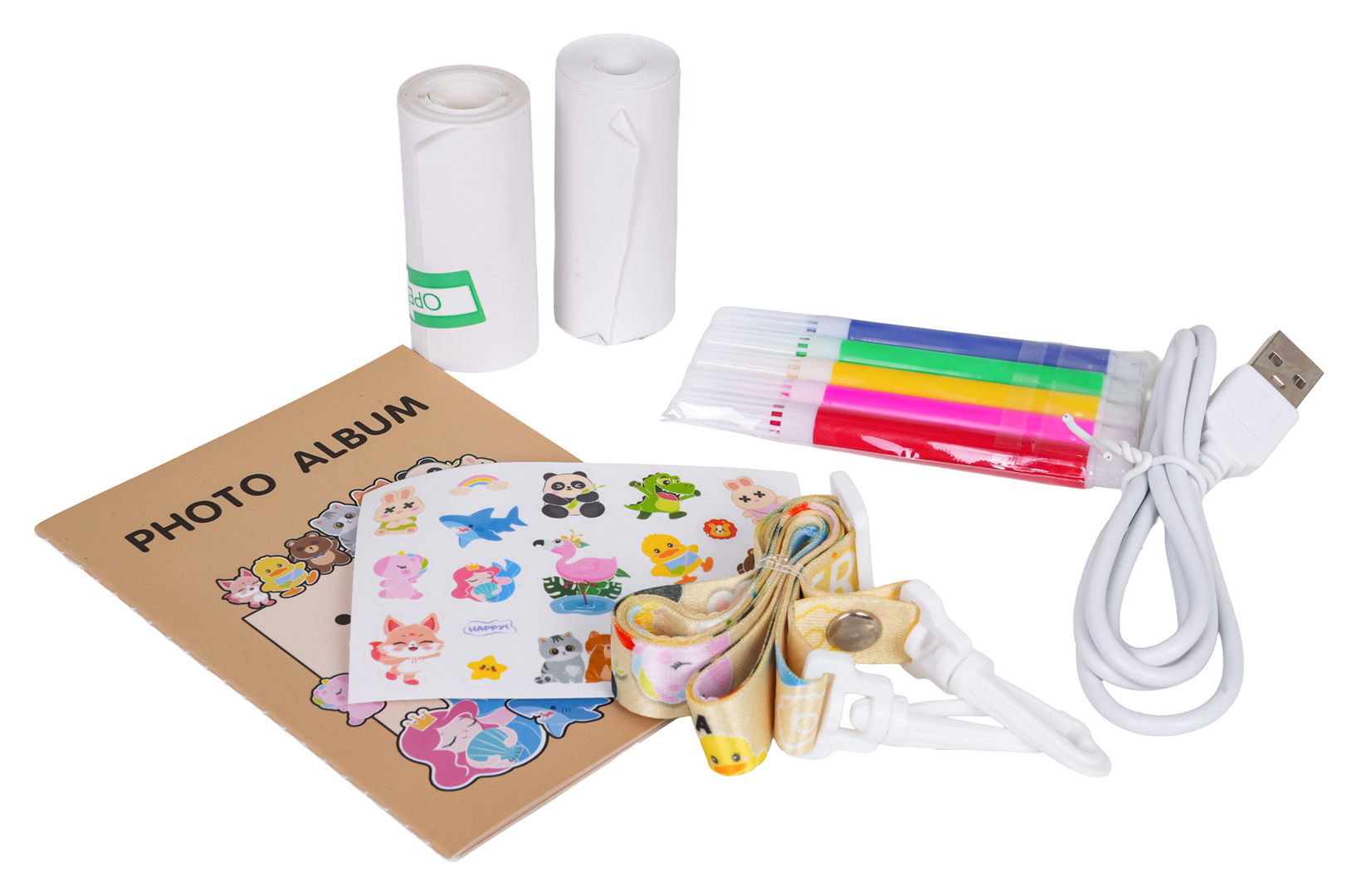 Sada fotoaparátu s funkcí okamžitého termálního tisku a příslušenstvím pro děti od tří let. Fotoaparát po pořízení snímku okamžitě vytiskne černobílou fotografii. K sadě byly přiloženy barevné fixy, aby si vaše dítě mohlo vybarvit výtisk. Přístroj má slot na TV kartu, aby si vaše dítě mohlo uchovávat všechny fotografie a videa, protože tento model má také funkci nahrávání. Do sady, kromě dříve zmíněných popisovačů, byly přidány také 2 termální role, nabíjecí kabel, šňůrka, samolepky, album na fotografie. Přístroj je napájen akumulátorem typu 3,7 V (v balení).