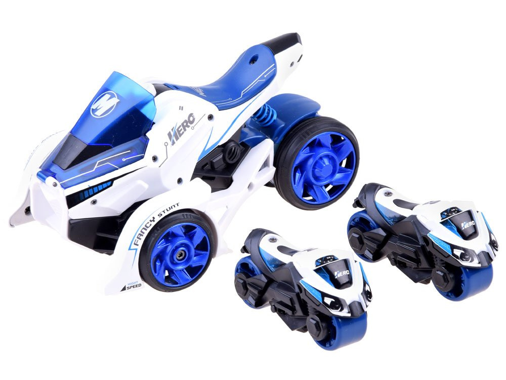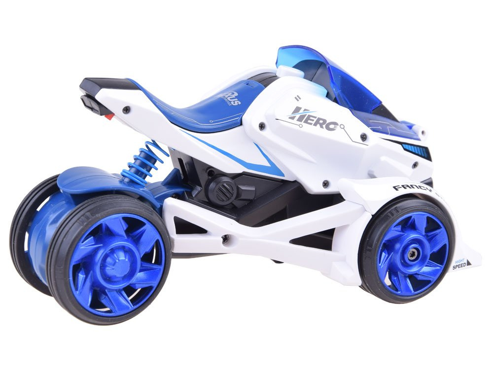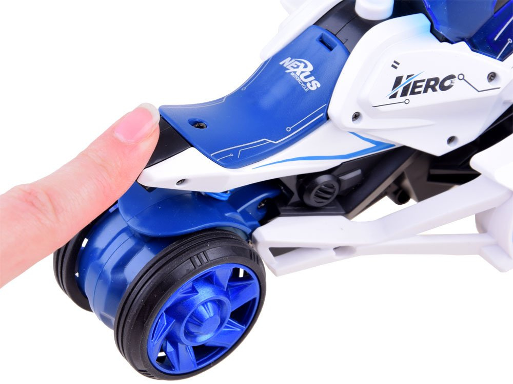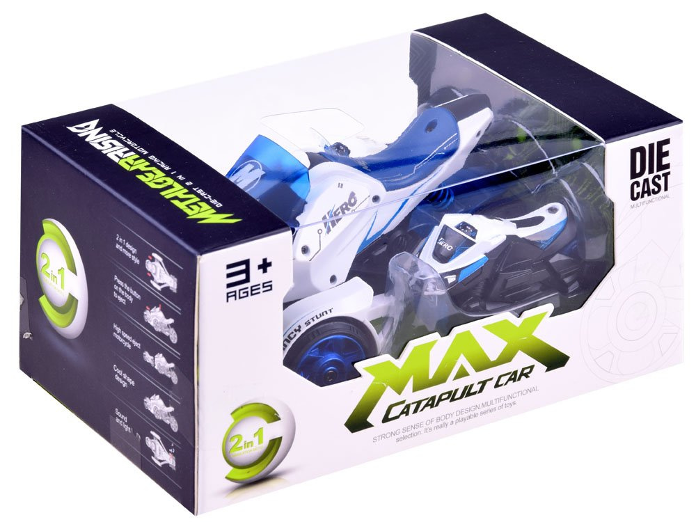 Nová futuristická kovová motorka 2 v 1 je skvělou volbou pro fanoušky motorismu. Tříkolka ve vesmírném věku je velmi pečlivě vyrobena z kovu s plastovými prvky. Motorka má zvukové a světelné efekty. Když se tříkolka přitiskne k zemi a když se stiskne tlačítko na nádrži motorky, ozvou se různé zvuky související s motorem a jízdou. To ale není vše, tlačítko také aktivuje spouštěč. Zvedněte přední kryt motorky, do kterého umístíte jednoho ze dvou závodníků, které jsou součástí sady, stiskněte tlačítko a váš závodník se rozjede závratnou rychlostí. Díky těmto přednostem se při hře s těmito vozidly zabaví mnoho milovníků.