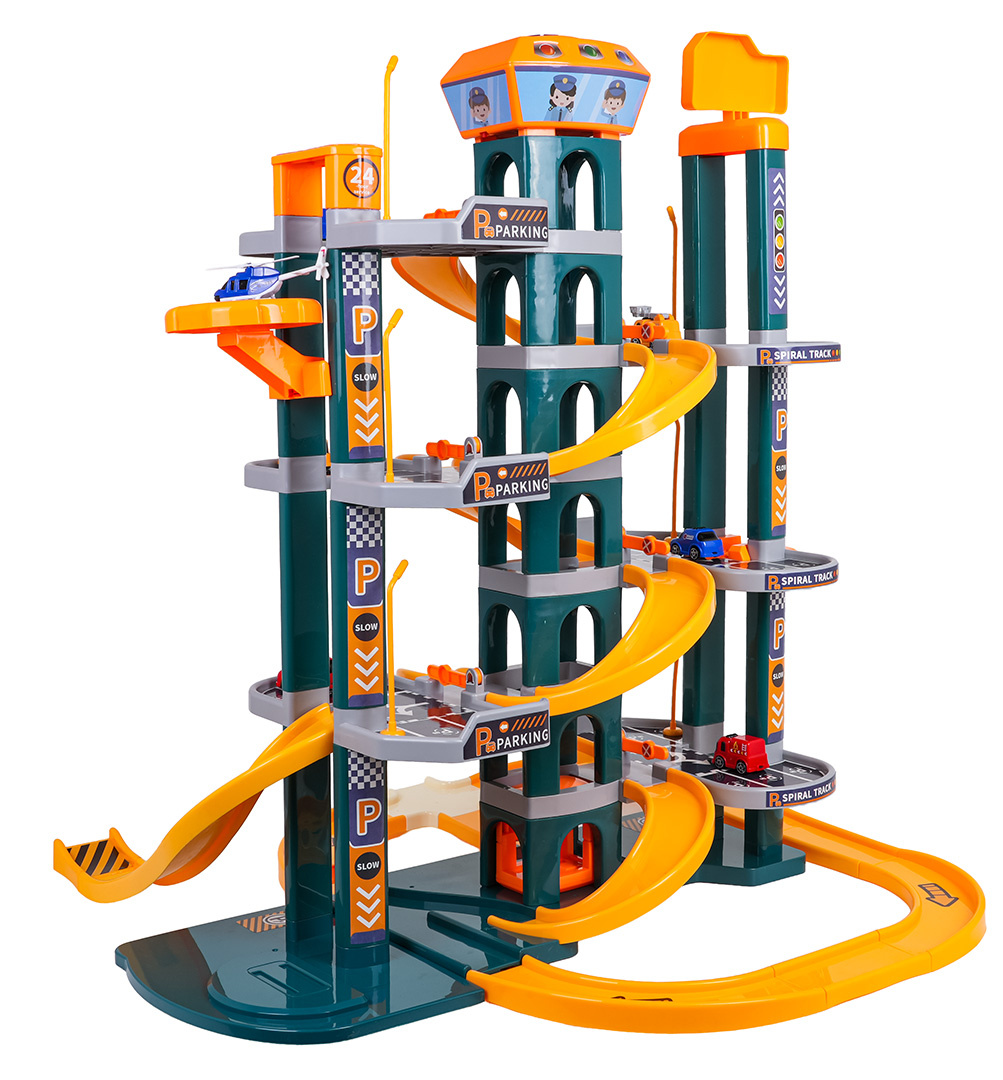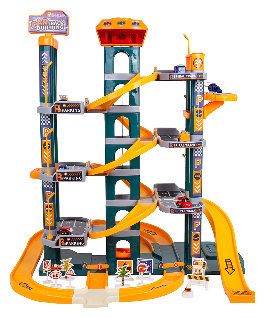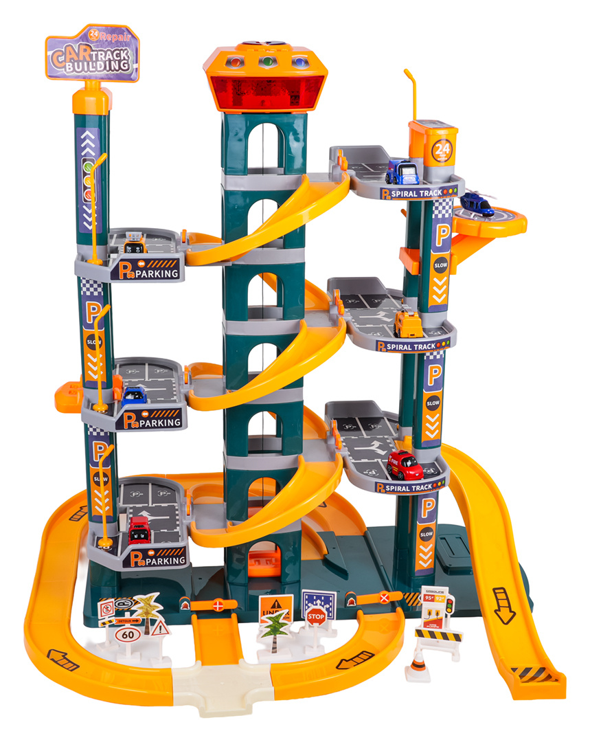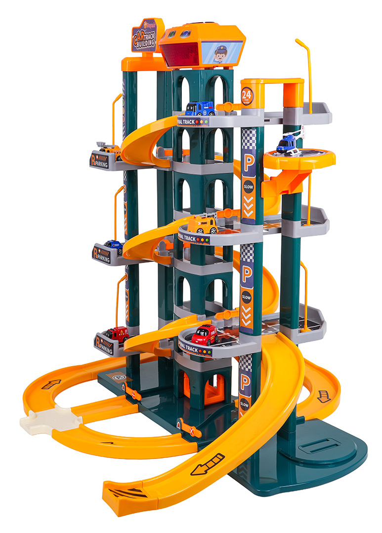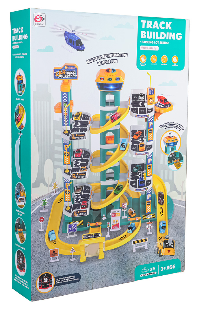 Skvěle provedené parkoviště s efektem zvuku a světla pro děti od tří let. Sada byla vyrobena z nejkvalitnějších materiálů bezpečných pro děti v živých barvách. Parkoviště má 4 úrovně, na kterých se nacházejí parkovací místa. Dostat se k nim můžeme pomocí elektrického výtahu napájeného bateriemi typu 3 x AA 1,5V (nejsou součástí balení). Na vrcholu výtahu se nachází panel zodpovědný za sjezd a výjezd a zvukové efekty ve formě veselých melodií, zvuků vozidel, sirény a světelné efekty jako blikající tlačítka vjezdu a sjezdu. Autíčka mohou sjíždět z kopce výtahem nebo skluzavkami. V sadě se nachází šest autíček a helikoptéra. Máme také četné lampy, dopravní značky, stromy a závory.