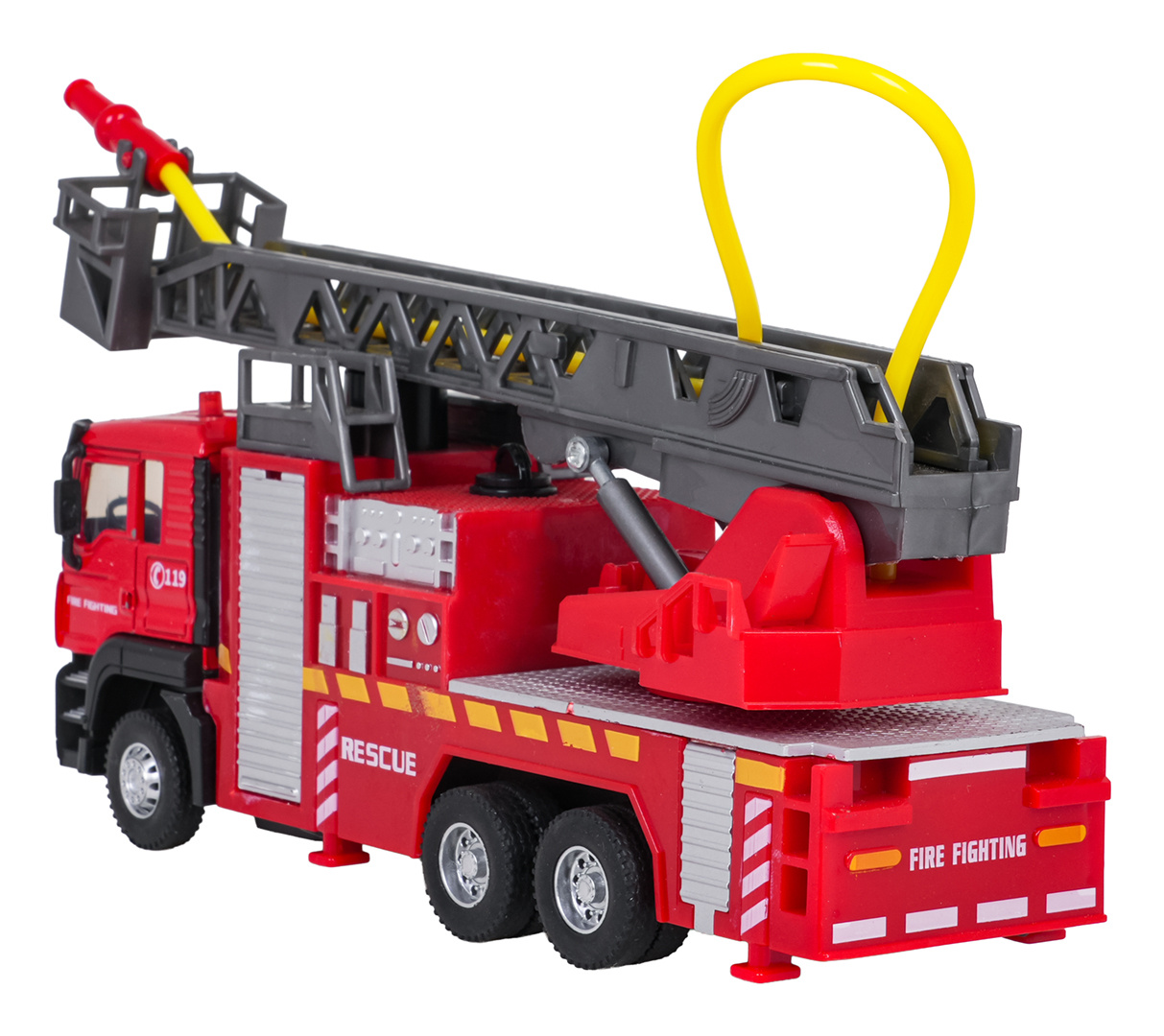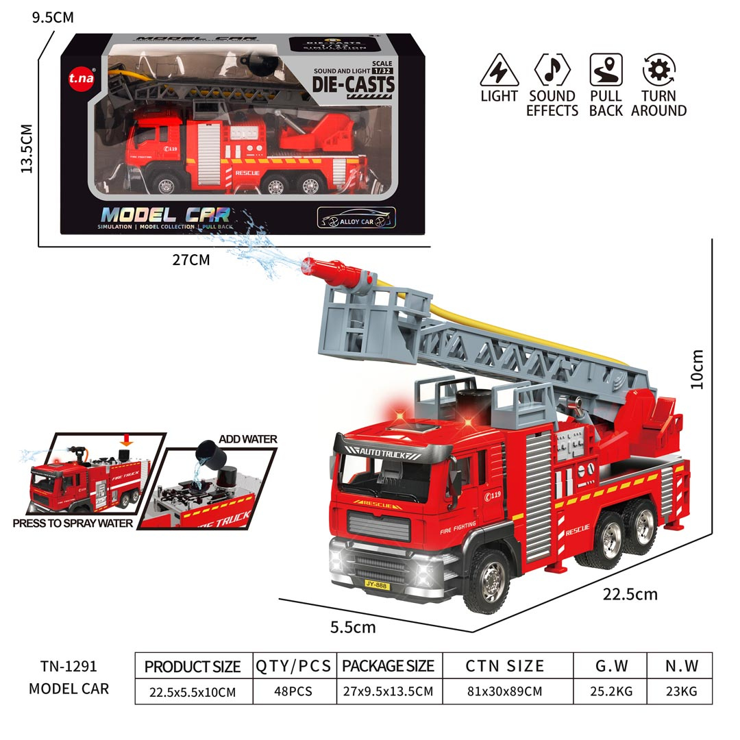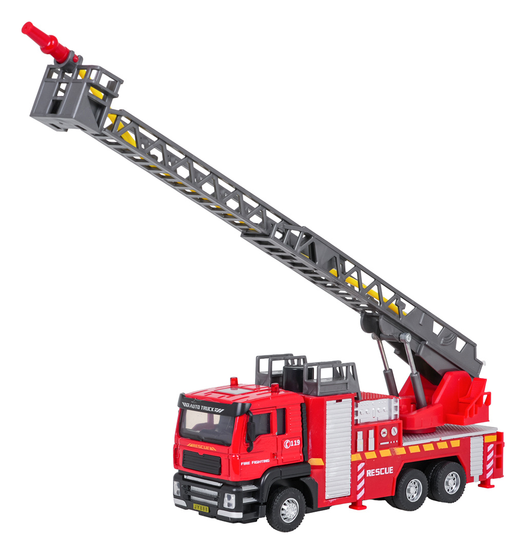 Interaktivní hasičský vůz, vyrobený v měřítku 1:32 s funkcí vody, světla a zvuku pro děti od tří let. Chránič byl vyroben z plastu nejvyšší kvality v živých barvách. Má gumové pneumatiky, které dobře drží na povrchu, a pohon Pull Back. Po stisknutí horní části kabiny vozidla uslyšíme zvuky charakteristické pro hasičský vůz a na střeše budou blikat světla. Žebřík hasičského vozu můžeme zvedat a spouštět a vysouvat dopředu (manuálně). Po naplnění nádržky umístěné u kabiny vozidla vodou a stisknutí pumpičky bude z hadice vytékat voda. Hračka je napájena bateriemi typu 3 x AG13 (v balení).