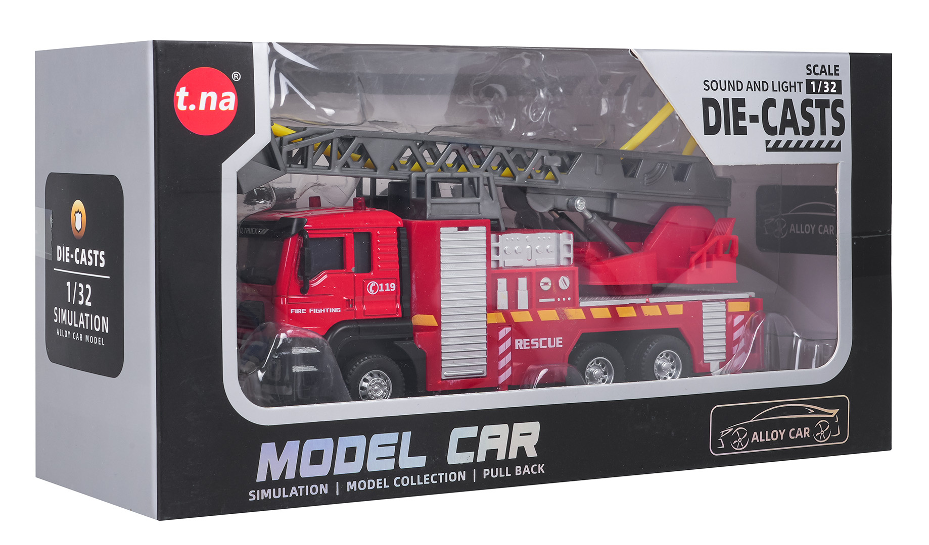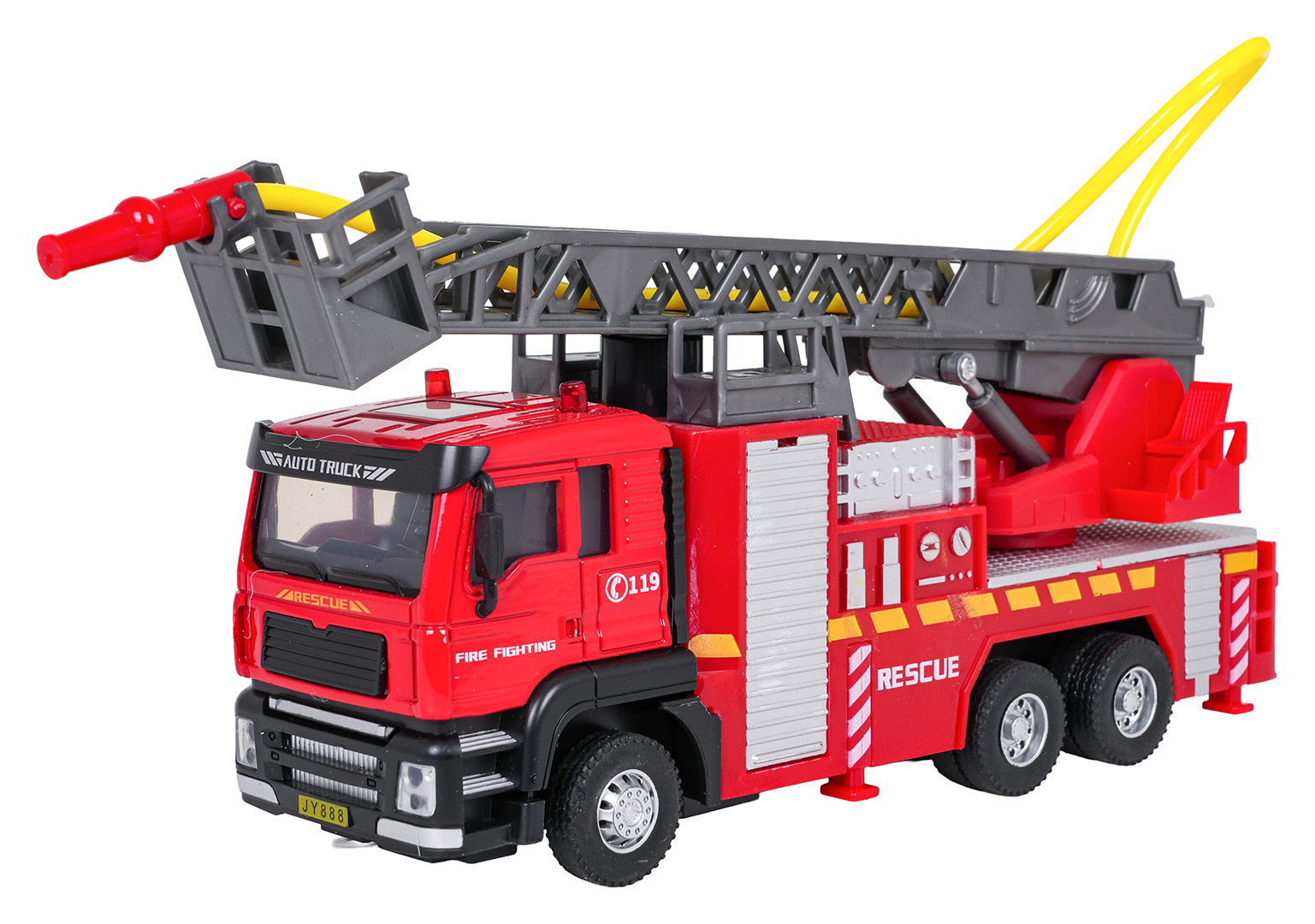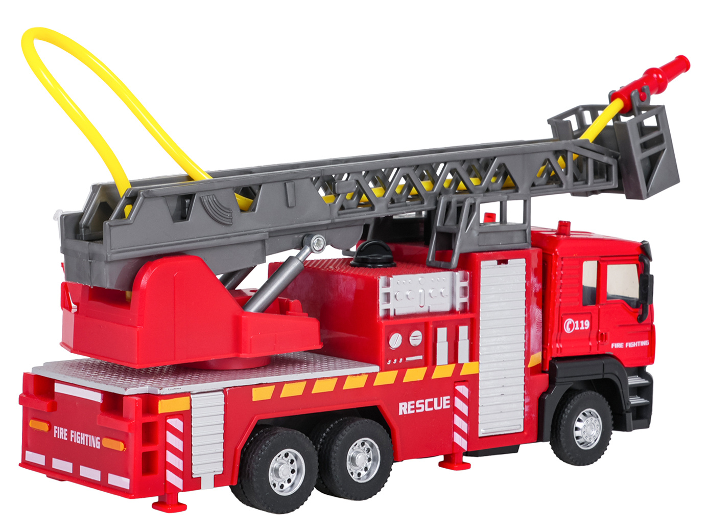 Interaktivní hasičský vůz, vyrobený v měřítku 1:32 s funkcí vody, světla a zvuku pro děti od tří let. Chránič byl vyroben z plastu nejvyšší kvality v živých barvách. Má gumové pneumatiky, které dobře drží na povrchu, a pohon Pull Back. Po stisknutí horní části kabiny vozidla uslyšíme zvuky charakteristické pro hasičský vůz a na střeše budou blikat světla. Žebřík hasičského vozu můžeme zvedat a spouštět a vysouvat dopředu (manuálně). Po naplnění nádržky umístěné u kabiny vozidla vodou a stisknutí pumpičky bude z hadice vytékat voda. Hračka je napájena bateriemi typu 3 x AG13 (v balení).