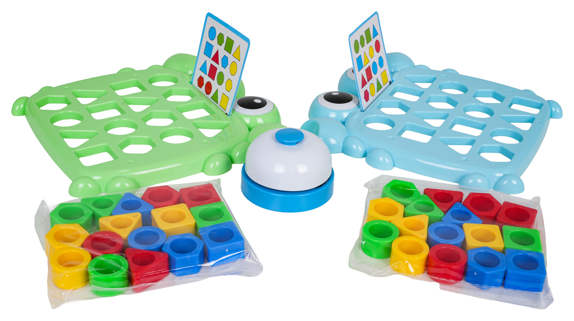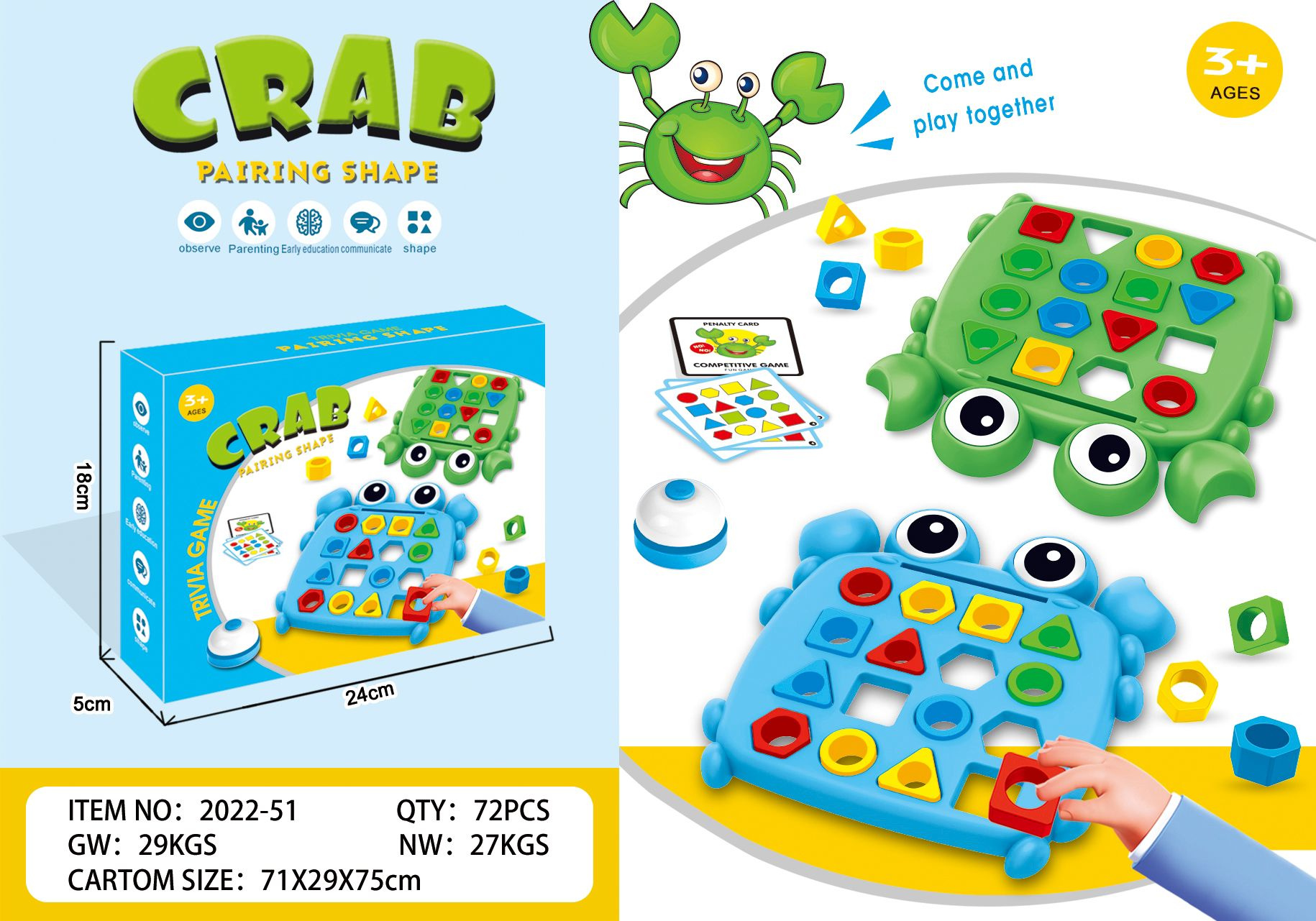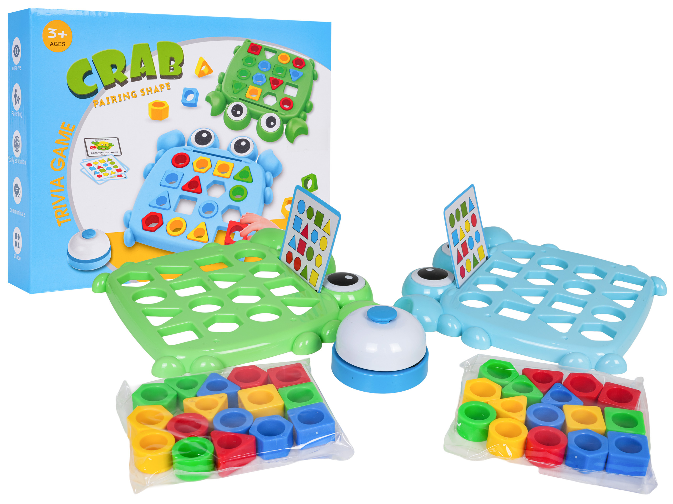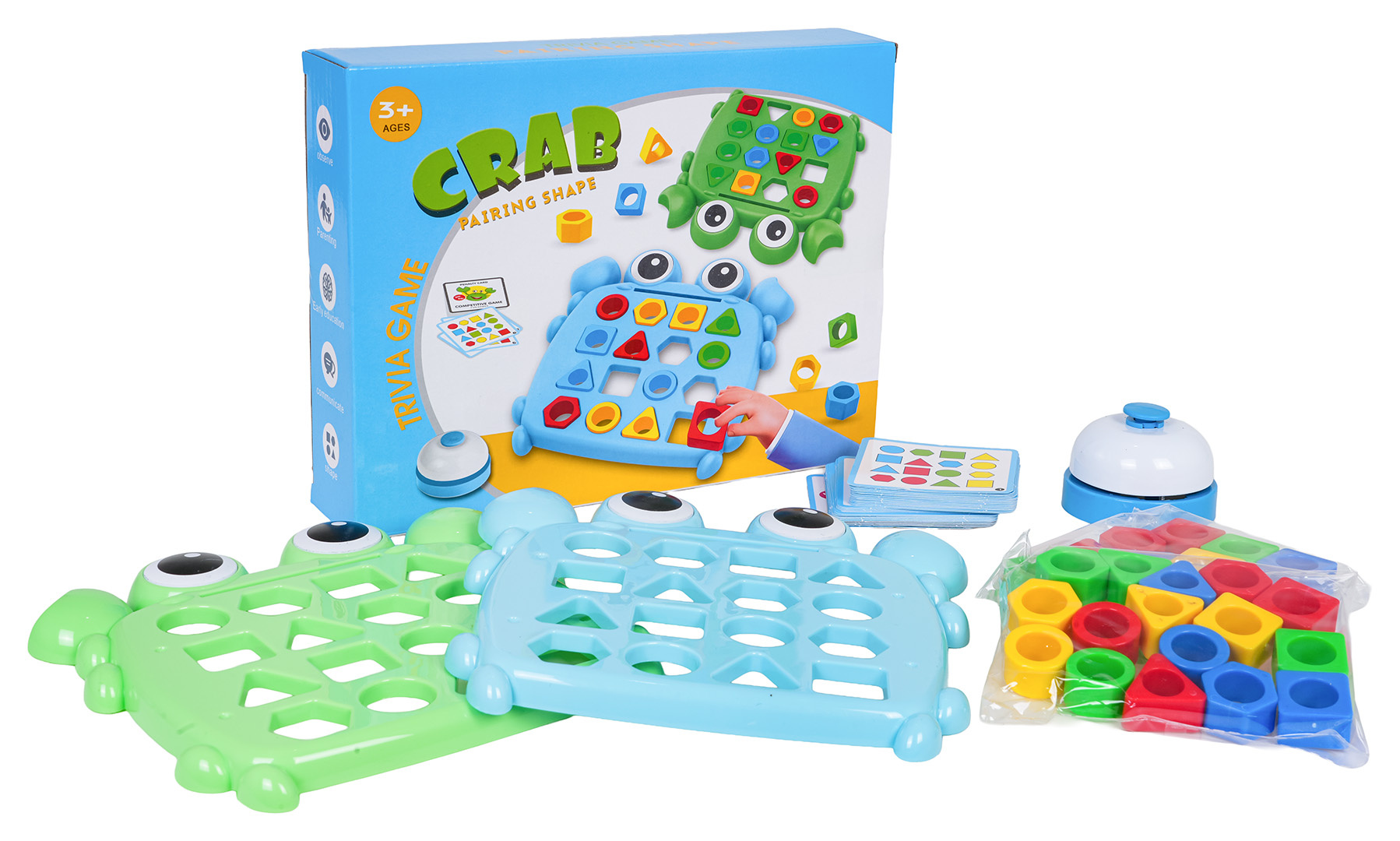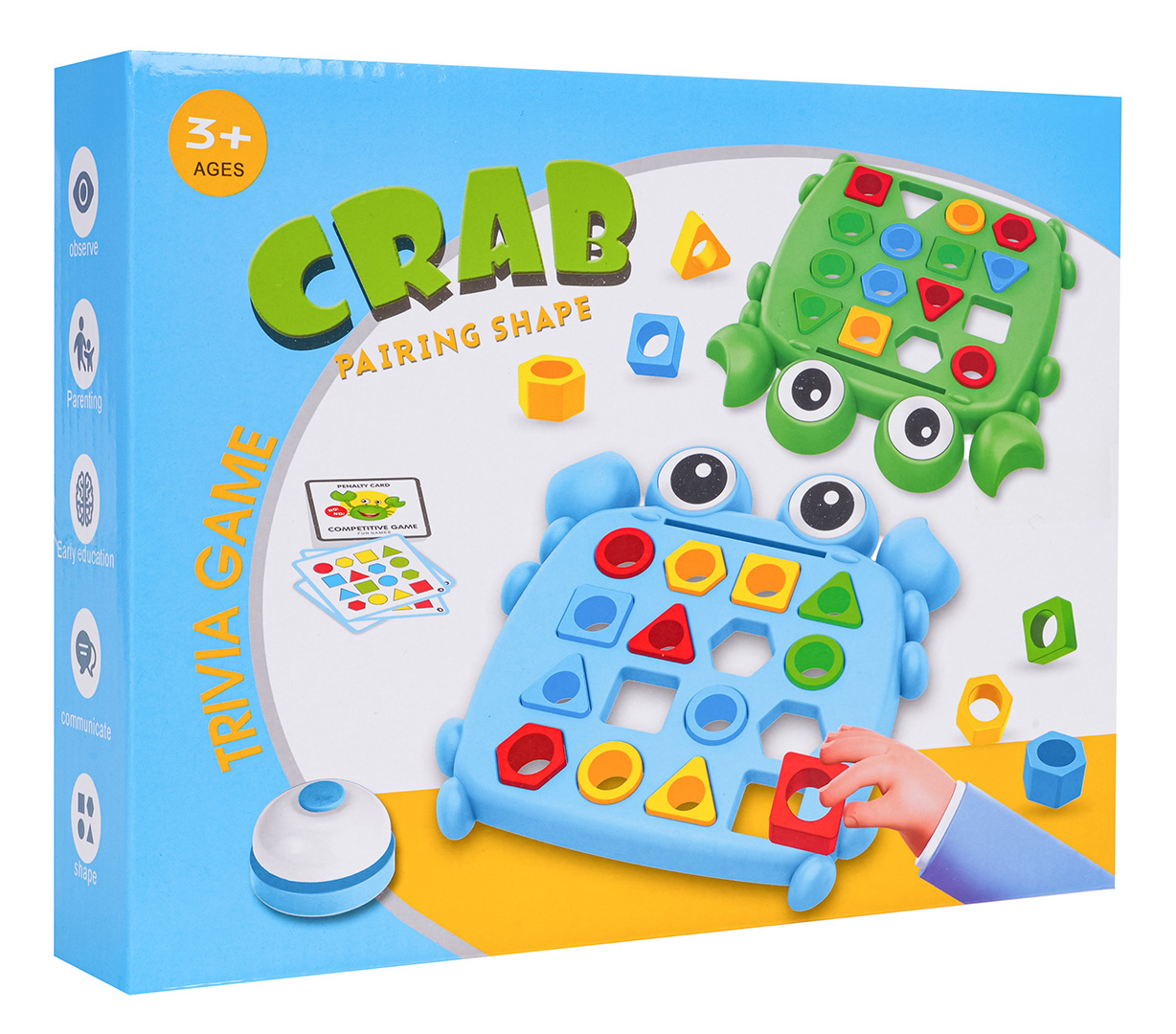 Obratnostní hra s krabem, přiřaď barvy, přiřaď tvary, procvičuj reflexy pro děti od tří let. Hra se skládá ze dvou desek ve tvaru kraba, karet s úkoly a výzvami, trestných karet, figurek různých tvarů a barev a zvonečku. Hru lze hrát samostatně nebo ve dvou. Hrajeme-li sami, vytáhneme kartu a umístíme ji do prohlubně na vrchu desky. Následně se snažíme umístit figurky na desku tak, jak to ukazuje karta. Dítě se učí rozpoznávat tvary a barvy. Pokud hrajeme ve dvou, vyhrává ten, kdo jako první dokončí skládání vzoru z karty a zazvoní na zvoneček. Pokud byl vzor sestaven správně, hráč si vezme kartu, pokud však špatně, hráč si losuje kartu s otázkami, a pokud na otázku špatně odpoví, musí přijmout výzvu. Pokud nepřijme výzvu, čeká na něj trestná karta. Hra učí prostřednictvím zábavy pozorovacím schopnostem, tvarům, barvám a rychlosti rozhodování.
