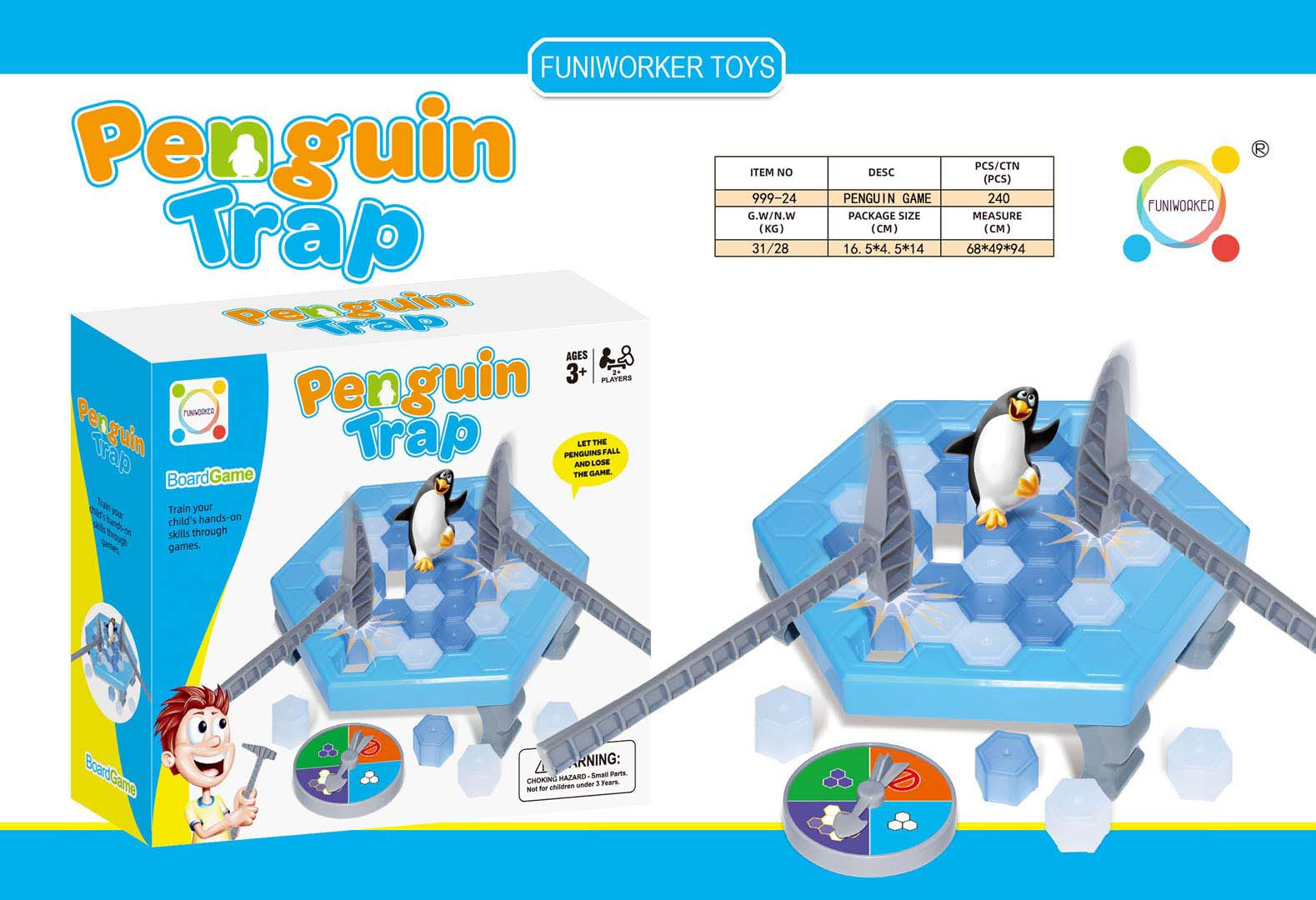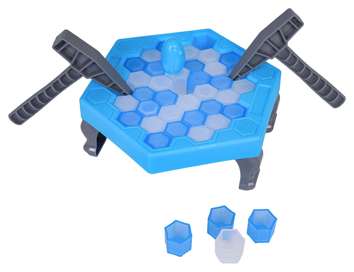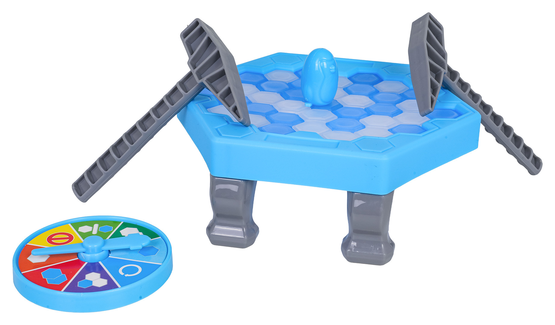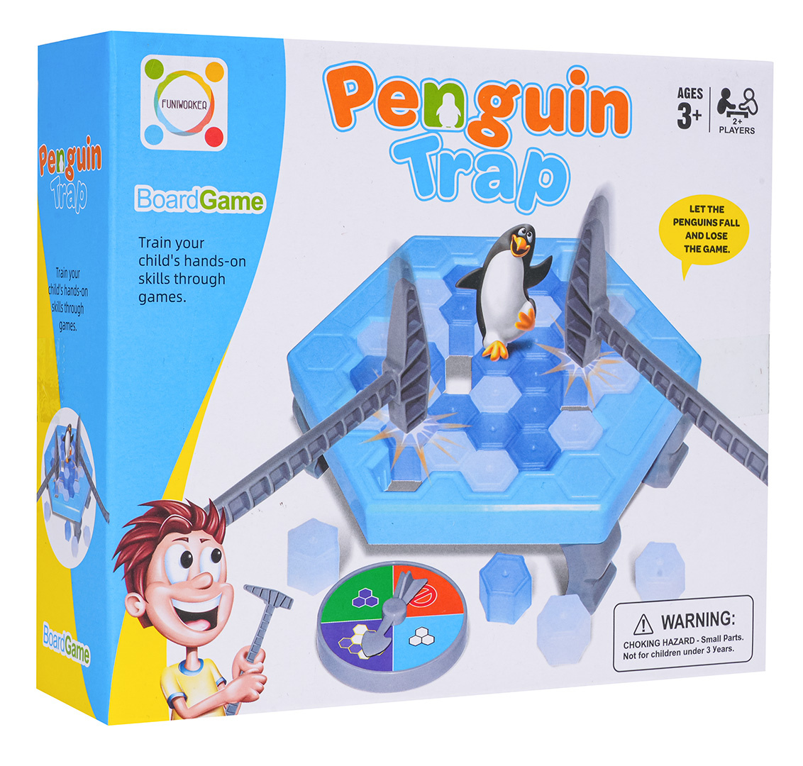 Obratnostní, rodinná hra Tučňák na ledu pro děti od tří let. Hra byla vyrobena z nejkvalitnějších materiálů odolných proti nárazům, v živých barvách. Pravidla hry jsou velmi jednoduchá. Točíme kolem, které nám ukazuje, které kostky ledu máme vyrazit kladívkem. Pokud si vytáhneme značku stop, propadá nám pořadí. Pokud vylosujeme pole s kolečkem, hráč losuje ještě jednou. Prohrává osoba, která v důsledku rozbíjení ledu převrhne tučňáka.