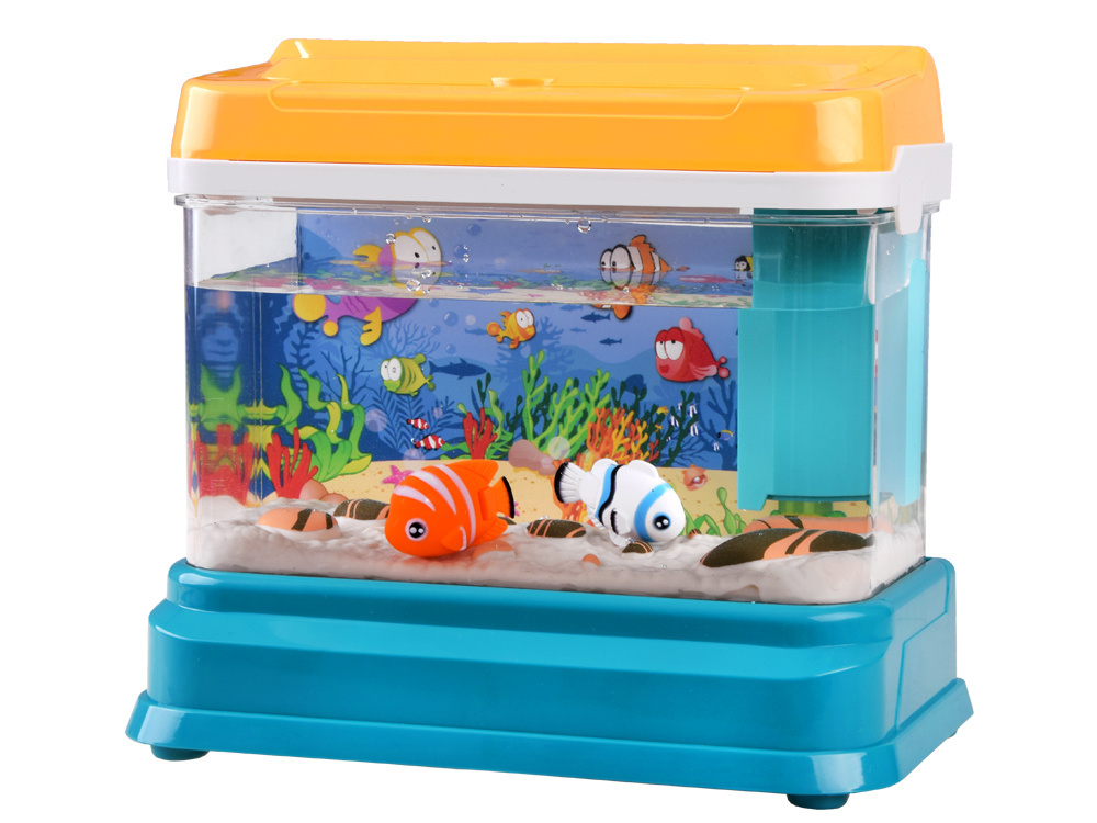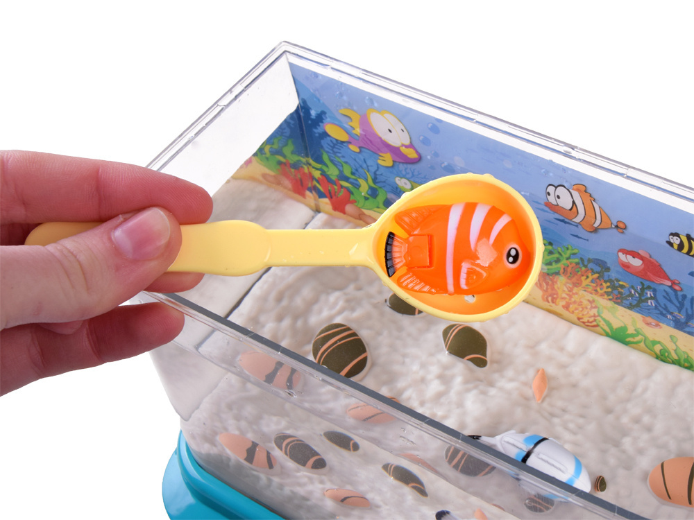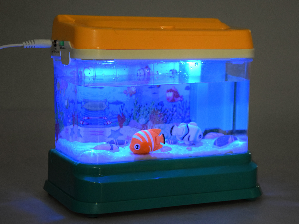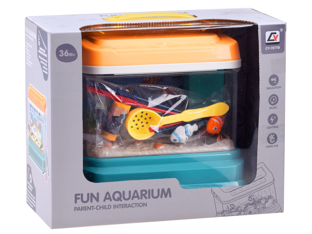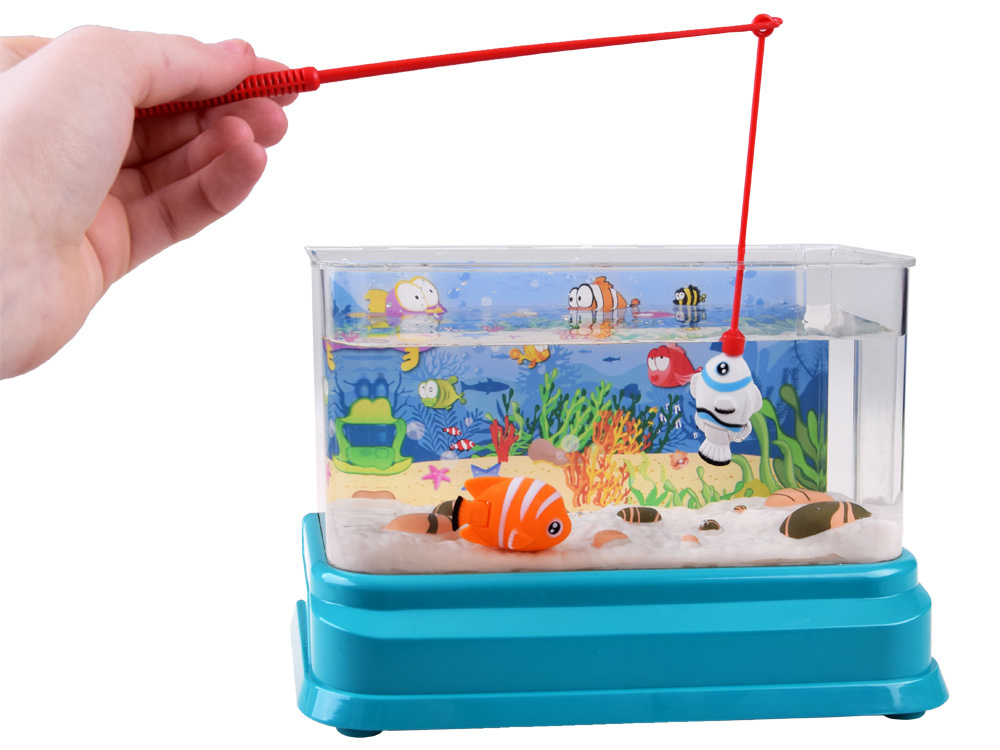 Akvárium je napájeno přes USB, po zapojení hračky se akvárium rozsvítí. Z horního krytu hračky vylétávají čtyři proudy vody a vytvářejí v akváriu bubliny. Vypínač na krytu akvária má také možnost aktivovat příjemnou melodii. V akváriu je neustále světlo, které vytváří velmi příjemnou atmosféru. Pruty, které jsou součástí balení, umožní dítěti i mamince nebo tatínkovi užít si zábavu při rybaření. Samozřejmě vyhrává ten, kdo chytí rybu jako první! Můžete přijít na nespočet nápadů, jak si hrát s akvárii.