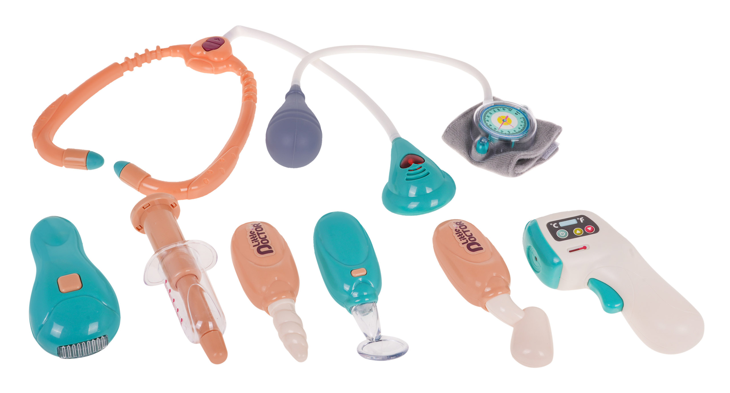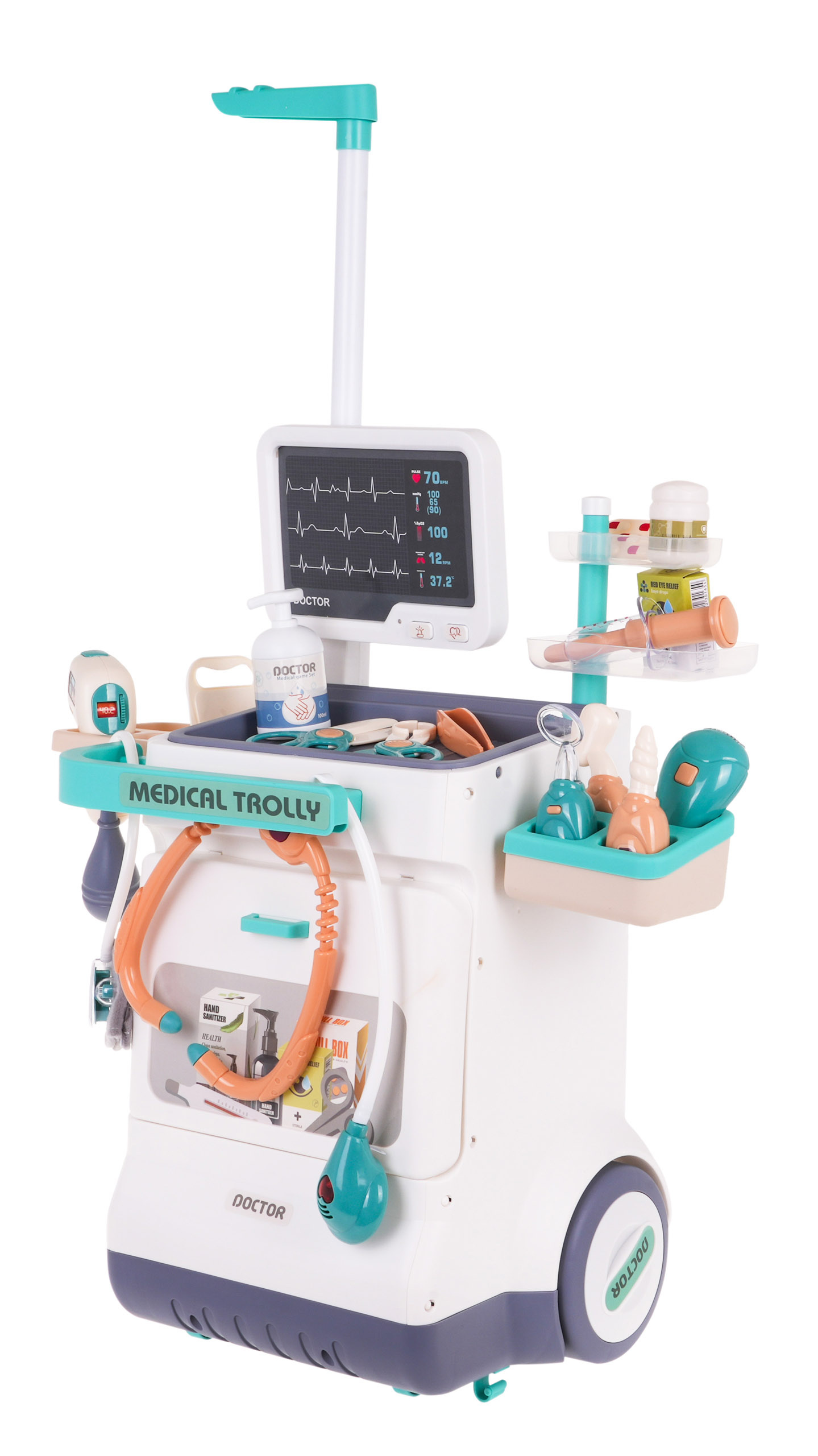 Interaktivní, dobře vybavená doktorská sada s lékařským vozíkem a příslušenstvím je určena pro děti od 3 let. S touto sadou se dítě může vžít do role očního lékaře, internisty, kardiologa nebo zubaře. Velký zdravotnický vozík, na který můžeme umístit veškeré zdravotnické příslušenství, je lehký a snadno se přemisťuje díky dvěma hladkým a velkým kolečkům a praktickému madlu. Velké množství zdravotnických pomůcek má interaktivní zvukové a světelné efekty, které zvyšují atraktivitu výrobku. Panel monitorovací obrazovky je napájen 2 bateriemi AAA 1,5 V, které nejsou součástí dodávky. Teploměr s bateriemi 2 x LR44 (součást dodávky), zubní zrcátko s bateriemi 2 x L1130 (součást dodávky), stetoskop s bateriemi 2 x LT44 (součást dodávky).