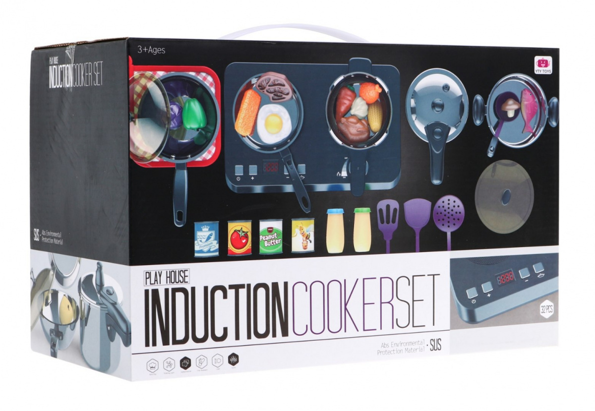 Úžasná, dobře vybavená kuchyňská sada sestávající z indukční varné desky, hrnců a příslušenství na vaření je určena pro děti od tří let. Pánev, hrnec a tlakový hrnec se podobají skutečným, jen ve zmenšené podobě. Indukční varná deska je napájena 3 bateriemi AA 1,5 V (nejsou součástí balení) a má zvukové a světelné efekty. Vlevo je osvětlený hořák se zvuky vaření a panel pro změnu doby vaření od 2 do 20 minut. Vpravo je osvětlený hořák se zvuky smažení a knoflíkem ON/OFF. Zahrnuty jsou také fiktivní potraviny.