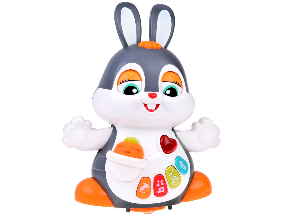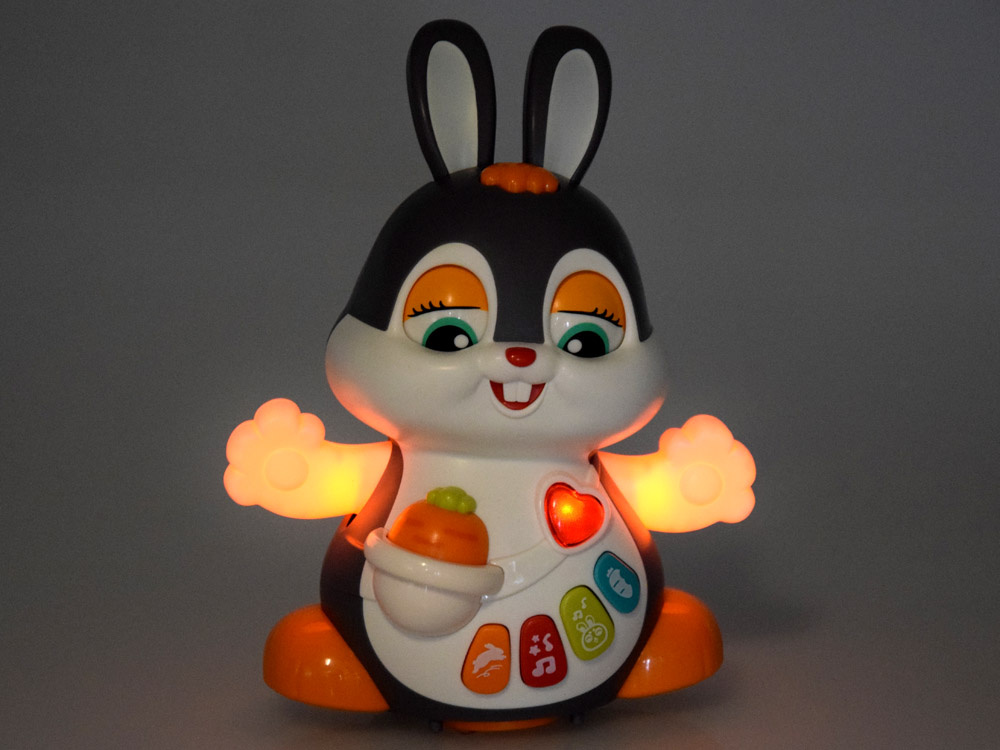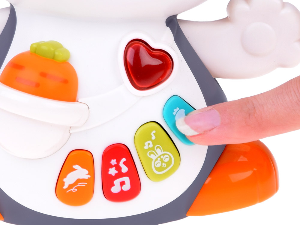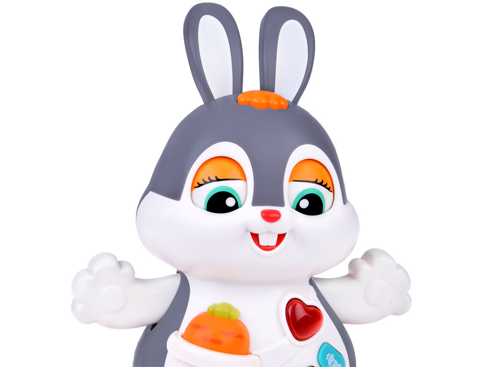 Hudba a světlo: králíček tančí do rytmu veselých písniček a bliká barevnými světly, což stimuluje smysly dítěte a podporuje hru.