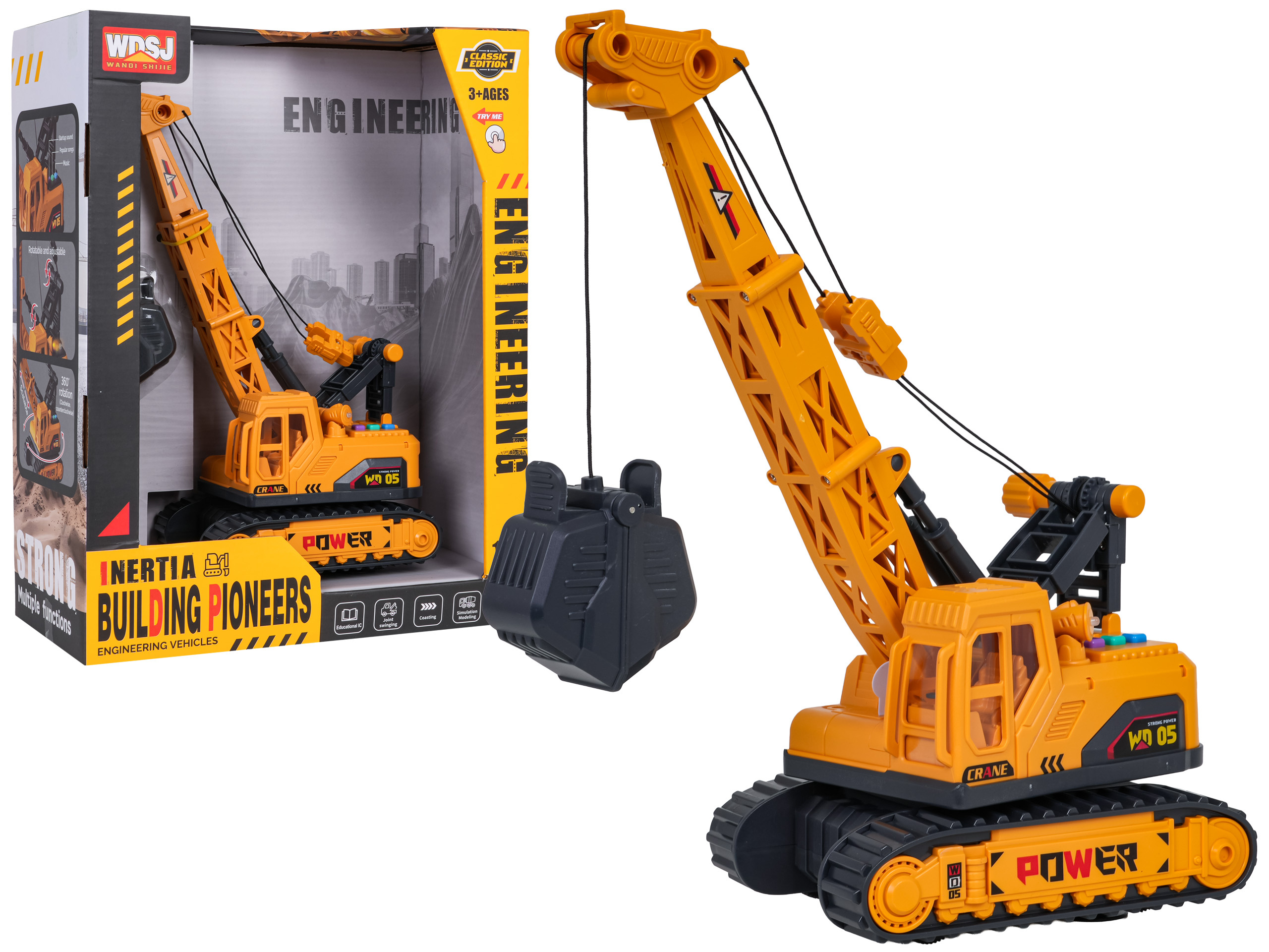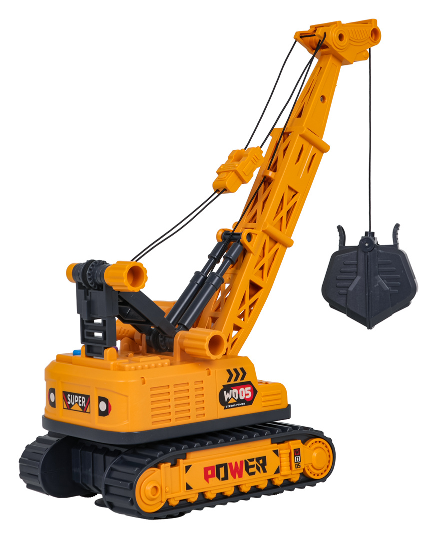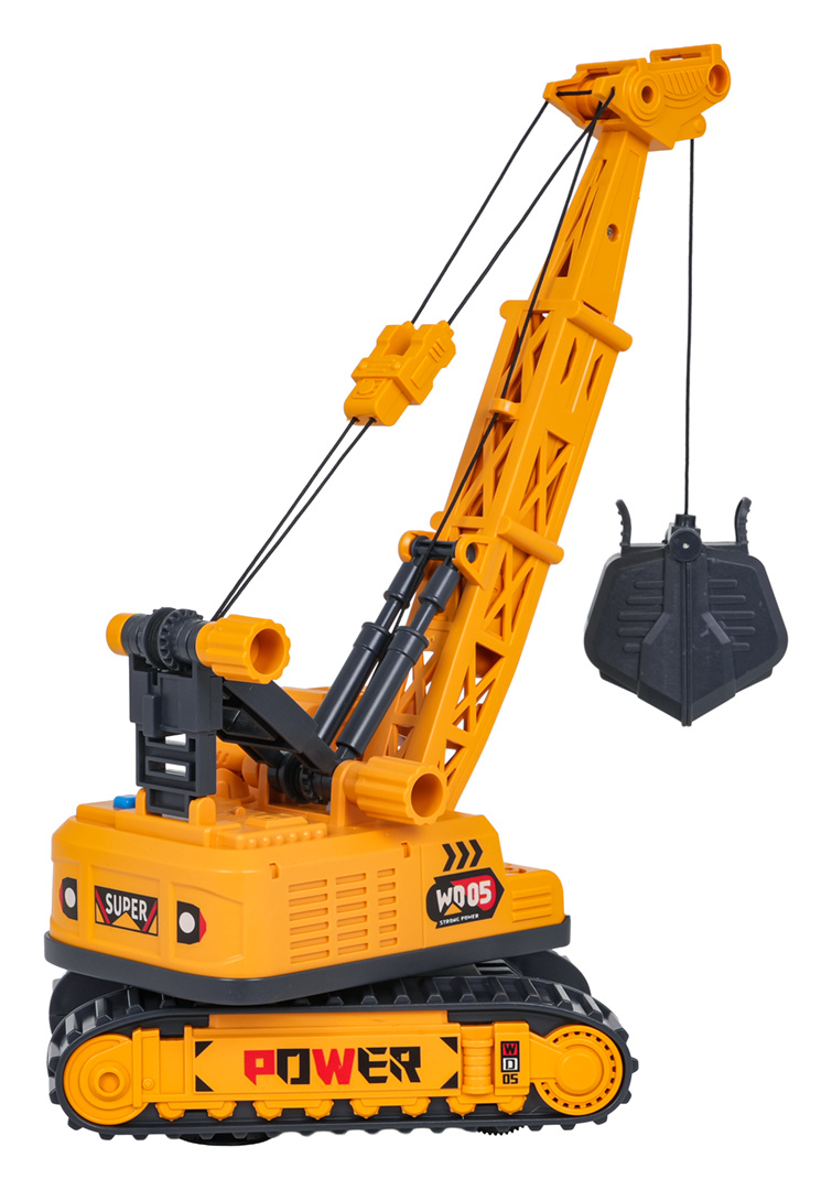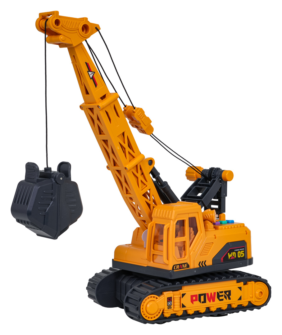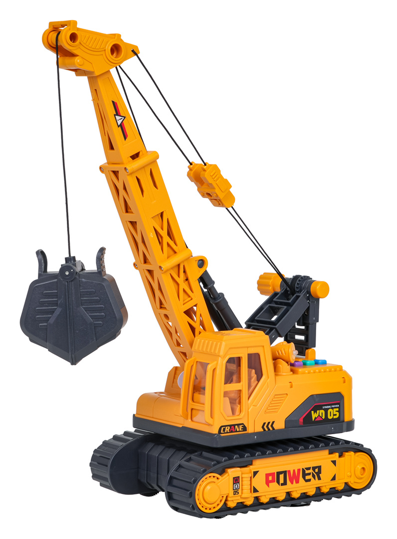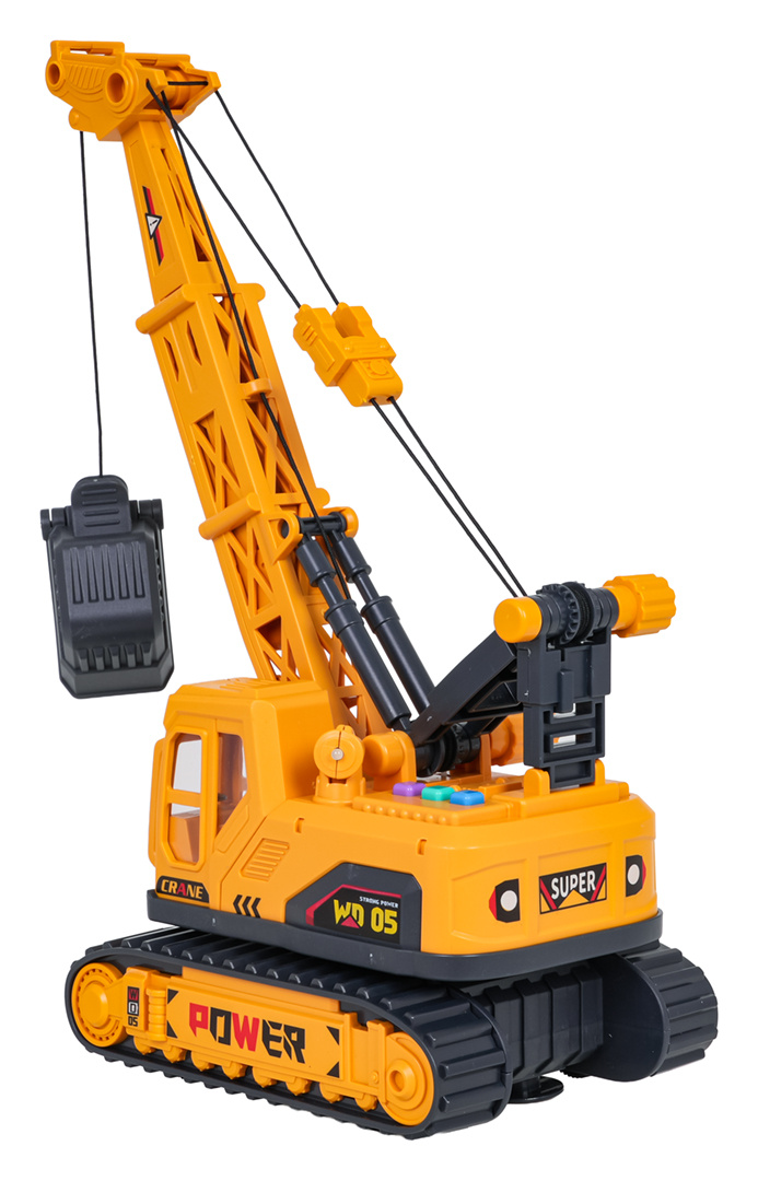 Interaktivní pásový jeřáb, vyrobený v měřítku 1:16, s pohyblivými prvky pro děti od tří let. Hračka byla vyrobena z nejkvalitnějších materiálů s důrazem na detaily. Ručním ovládáním můžeme řídit výložník a spouštět a zvedat uchopovač pro nakládání. Základna stroje se může otáčet o 360 stupňů. Na střeše hračky se nacházejí tlačítka, která spouštějí zvukové a světelné efekty. Na spodní části jeřábu byla umístěna malá kolečka, která mají pohon. Hračka je napájena bateriemi typu 3 x AG13 (v balení).