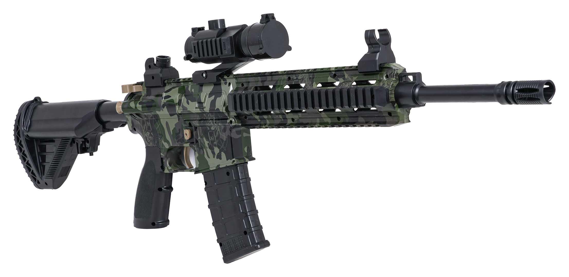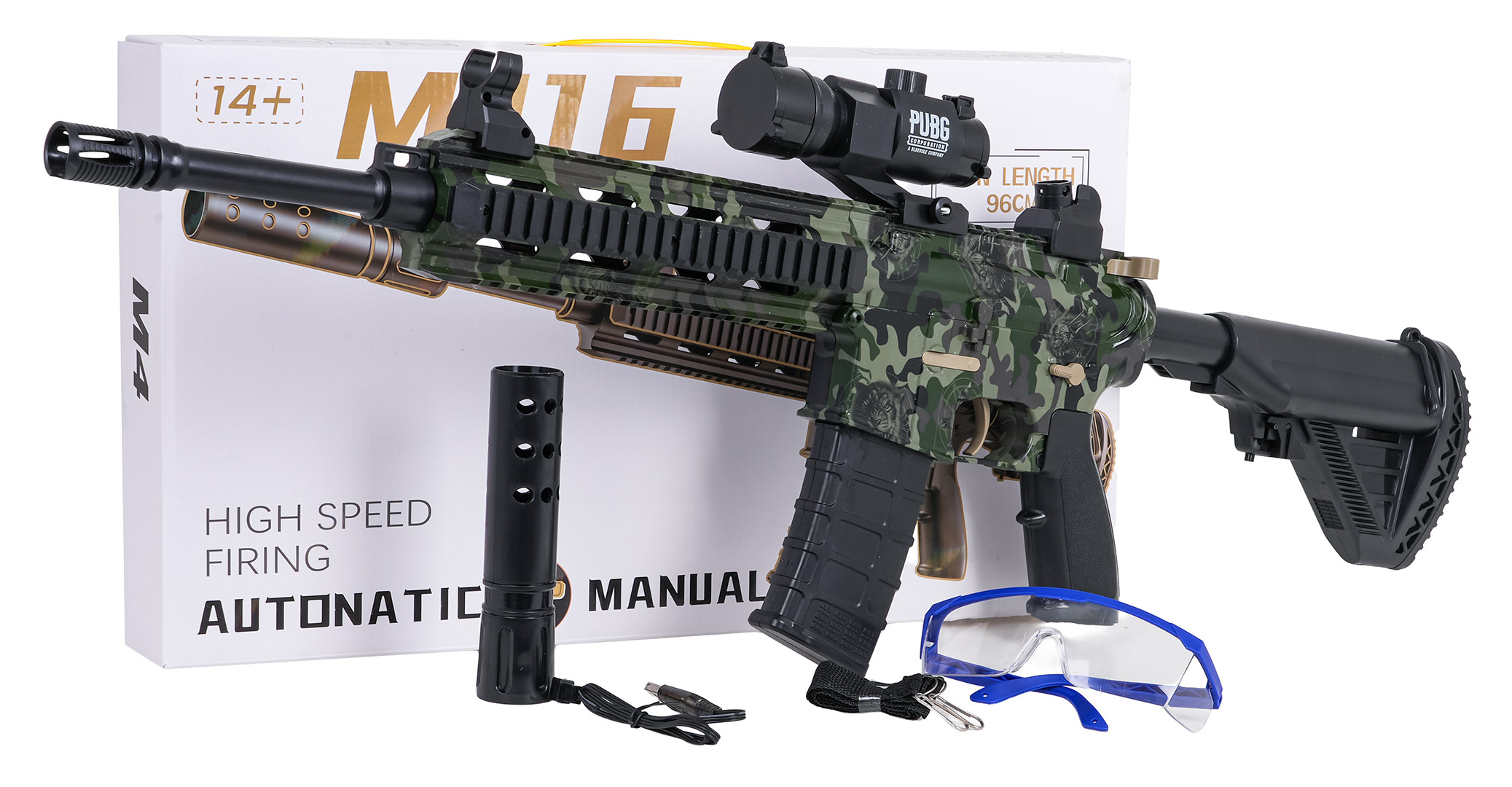 Velká puška M416 na gelové kuličky je určena pro děti od čtrnácti let. Je nutné ho používat se speciálním hydrogelem ve formě kuliček, které po zásahu cíle prasknou. V tomto modelu je třeba používat kuličky o průměru 7-8 mm. Sada obsahuje sáček s nepřipravenými kuličkami. Kuličky se připravují tak, že se zalijí vodou a nechají se odstát přibližně 4-6 hodin, poté se přebytečná voda slije a máme hotové náboje. Karabina má režim manuálního a automatického střelby. Hledí pistole je vybaveno zvětšovacím sklem, můžeme regulovat vzdálenost cíle pomocí knoflíku. Hračka je napájena akumulátorem 7,4V (v balení).