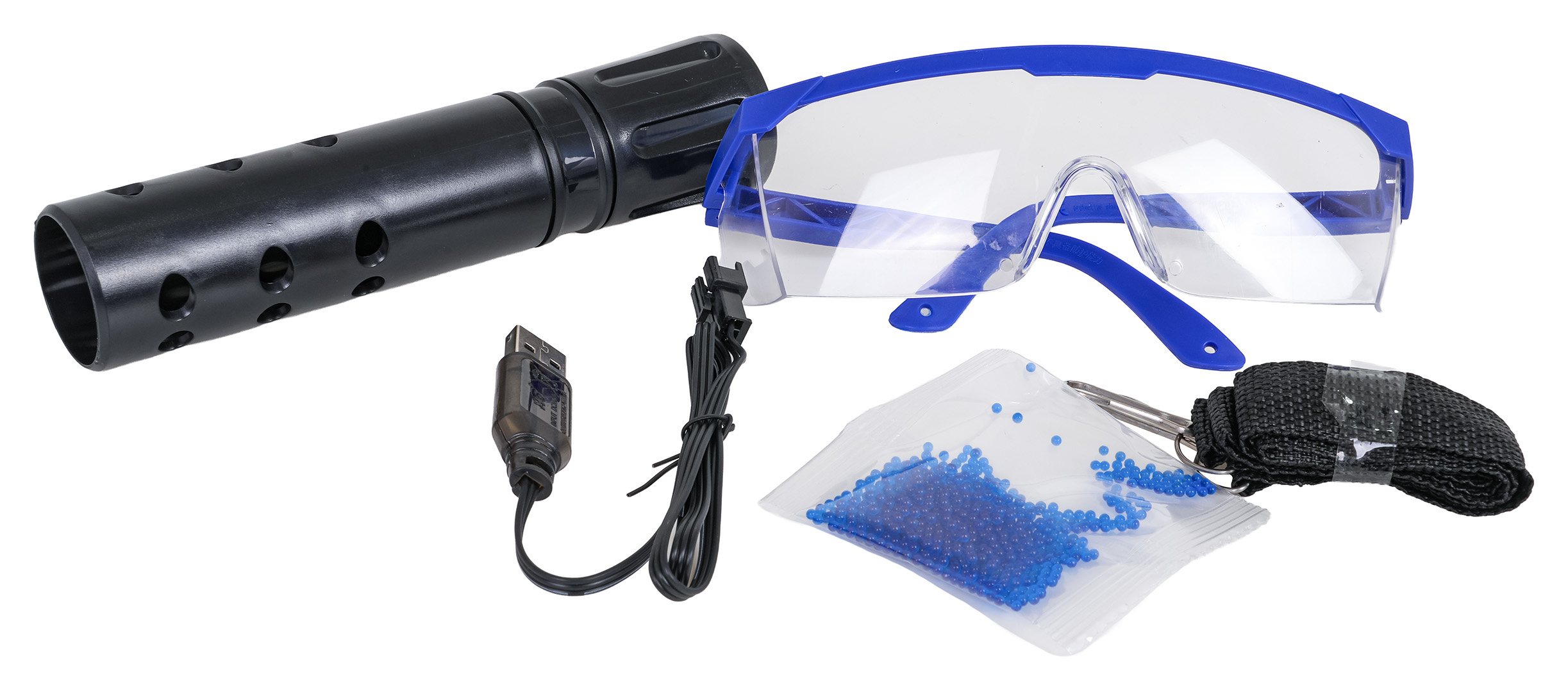 - ochranné brýle, tlumič, zásobník, pásek a sáček s 500 kusy vodních kuliček v sadě.
