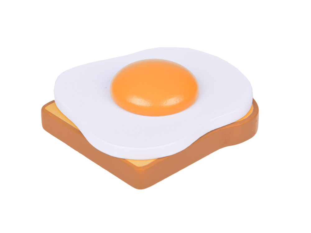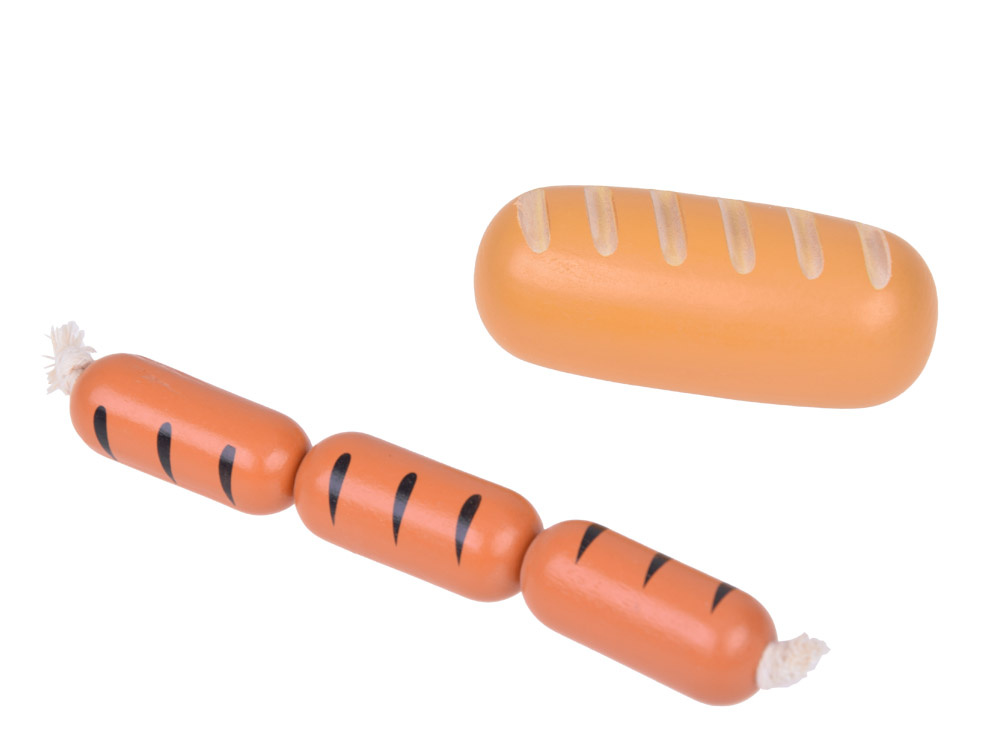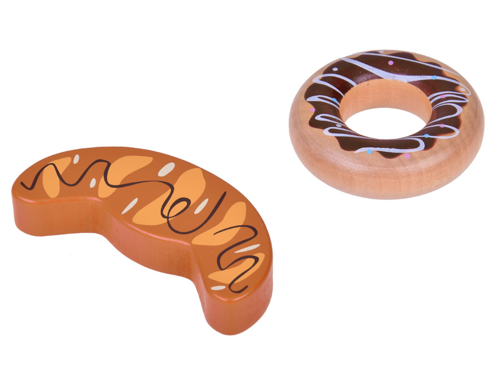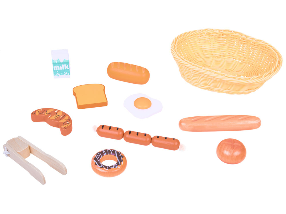10 dřevěných prvků: volské oko, houska, podlouhlá houska, bageta, toast, klobásky, mléko, croissant, donut (produkty nejsou vhodné ke konzumaci).