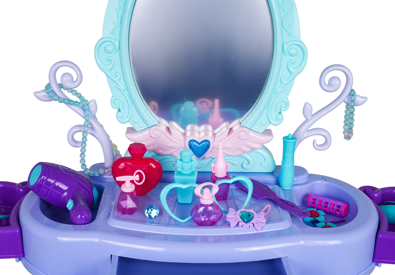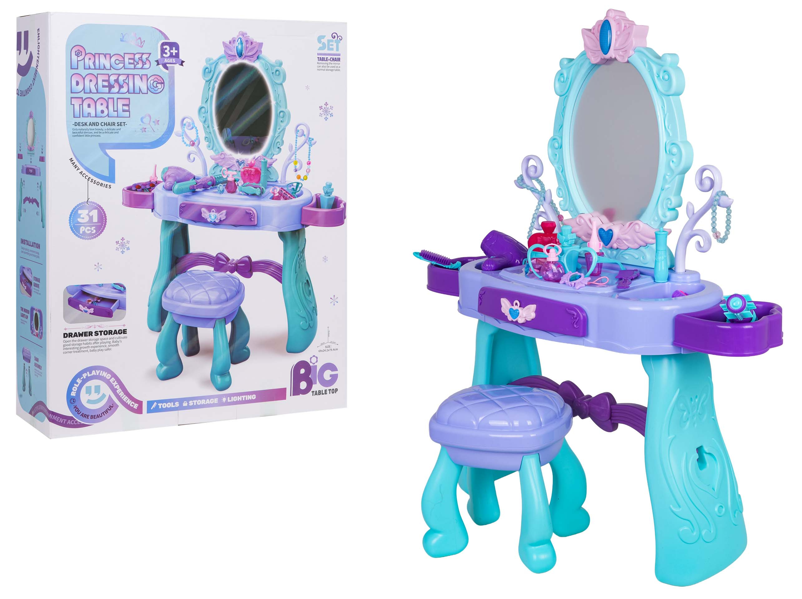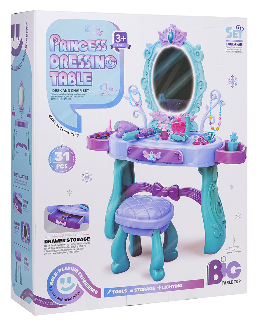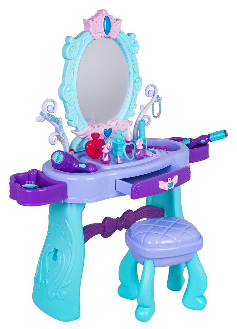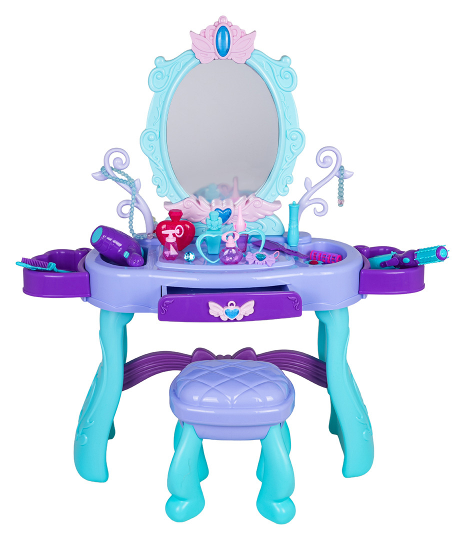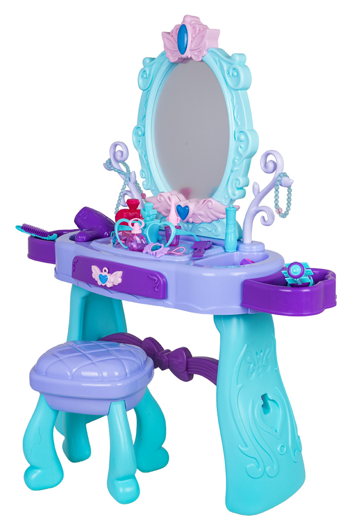 Kouzelný toaletní stolek s taburetem a doplňky pro děti od tří let. Sada byla vyrobena s důrazem na detaily v živých barvách. Toaletka má krásně zdobené zrcadlo, otevírací šuplík a boční poličky na doplňky. Ve vybavení sady se nachází m.in. fén, kulma s žehličkou, skládací kartáč, hřeben, brýle, otevírací nádoby na kosmetiku, atrapa rtěnky nebo laku na nehty, a také náramek, korále, sponky a prsten. Toaletka je napájena bateriemi typu 2 x AA 1,5 V (nejsou součástí balení), které jsou potřebné k osvětlení zrcadla.