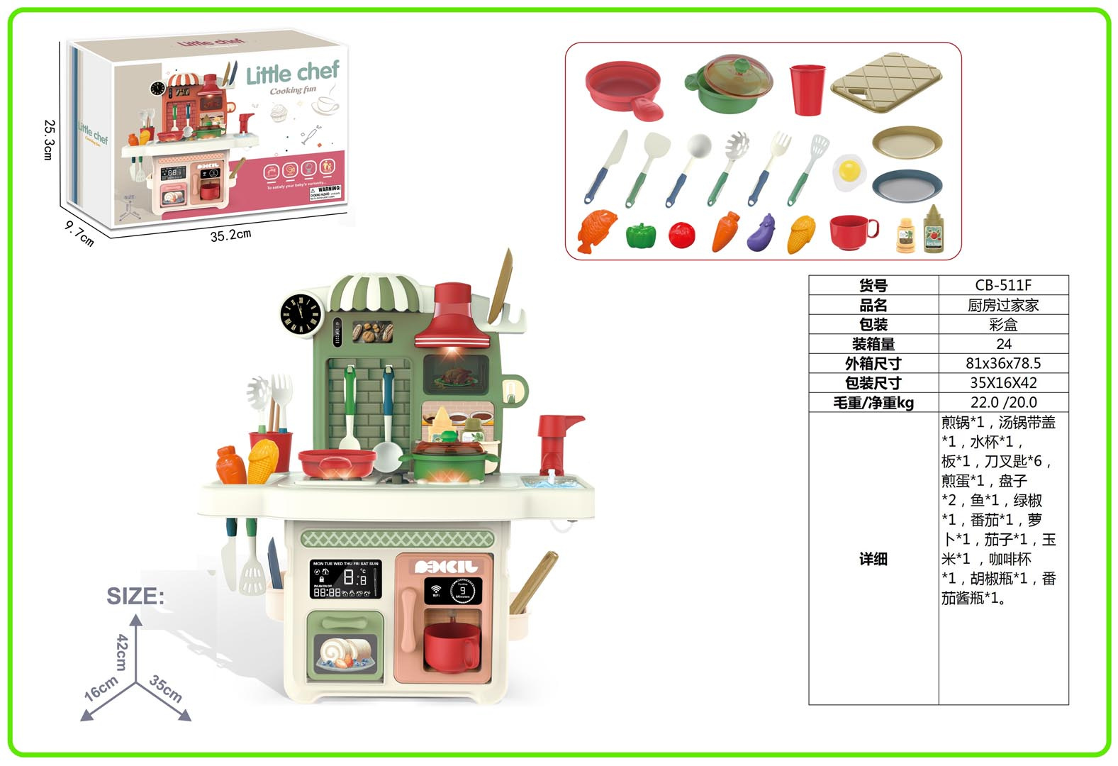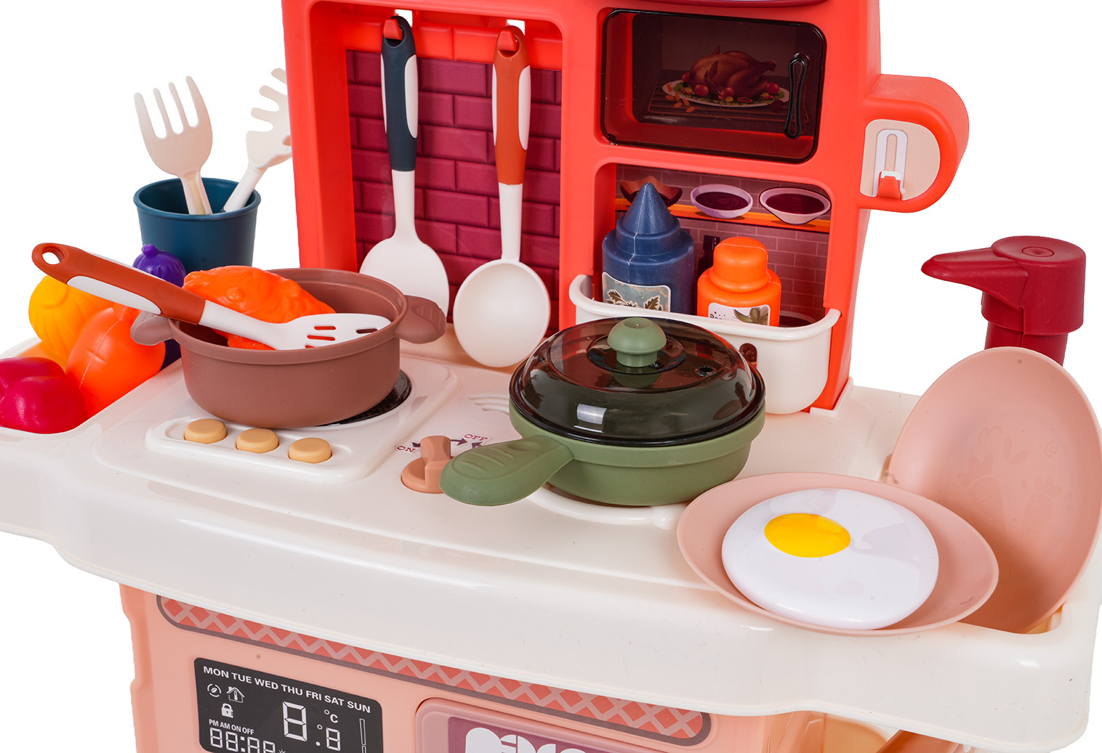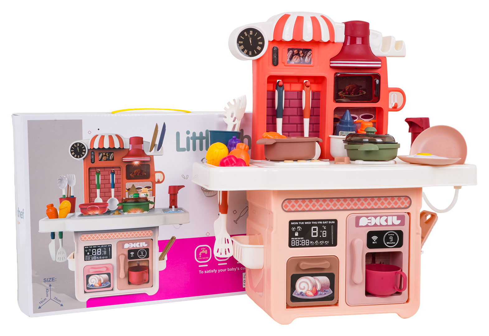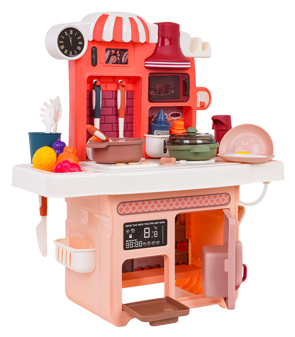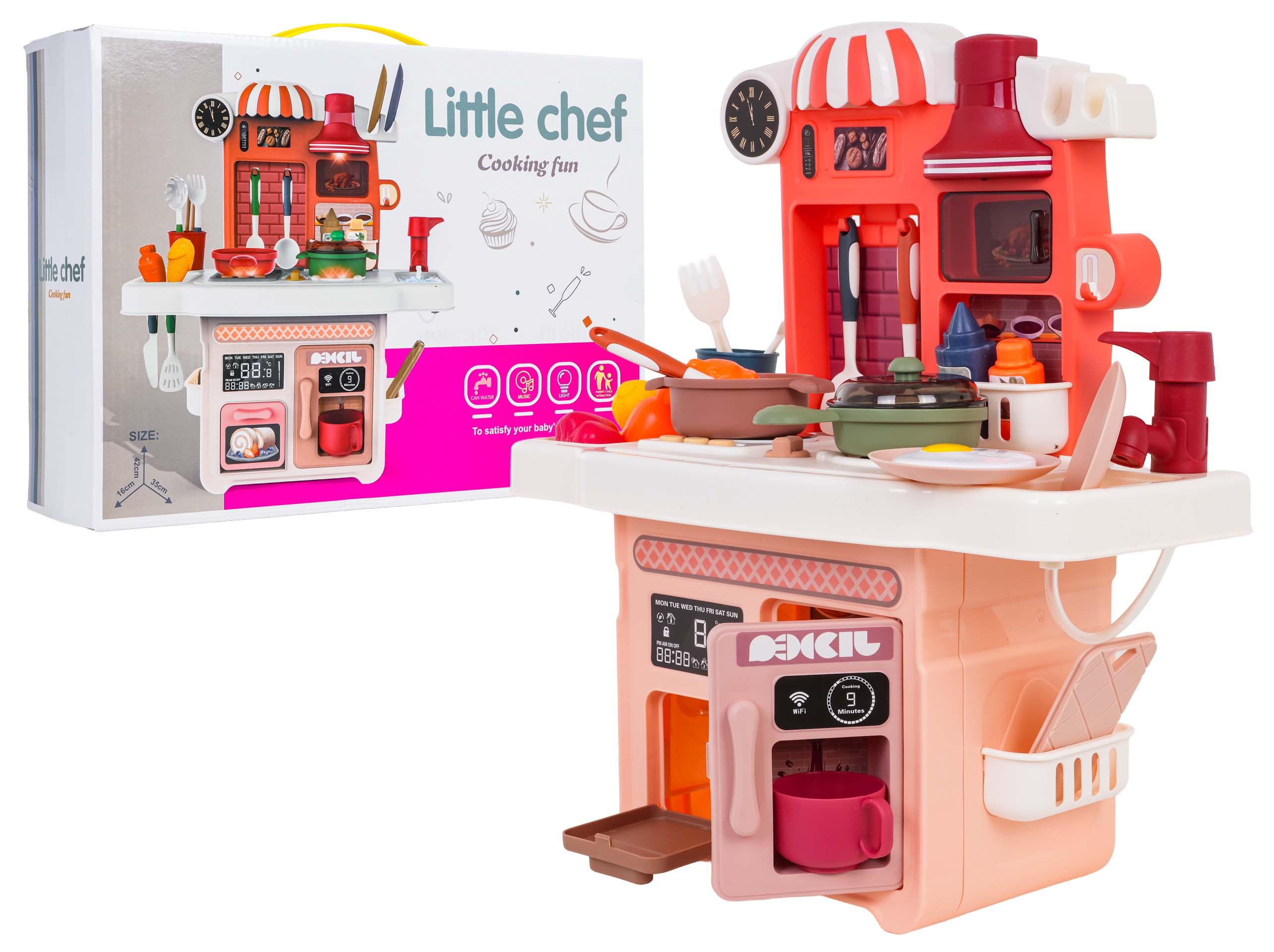 Interaktivní kuchyně s funkcí světla, zvuku a kohoutkem, ze kterého teče voda, a také s množstvím doplňků, pro děti od tří let. Kuchyně byla skvěle provedena, z nejlepší kvality plastu a je v živých barvách, které dítě povzbuzují ke hře. Na kuchyňské desce se nachází interaktivní deska s hořáky. Po otočení knoflíku jsou slyšet zvuky vaření a smažení. Zvukům vaření a smažení doprovází podsvícení hořáků. Po stisknutí jednoho ze 3 tlačítek uslyšíte různé písničky, říkanky a bezpečnostní pokyny. Z kohoutku skutečně teče voda (na pumpu), jako ve skutečném dřezu, dítě si bude moci umýt hračkové nádobí. V sadě máme také maketu kávovaru a trouby a digestoř s podsvícením. Celá sada vypadá skvěle. Hračka je napájena bateriemi typu 3 x AA 1,5 V – deska (baterie nejsou součástí balení), 3 x AG13 – digestoř (baterie jsou součástí balení).