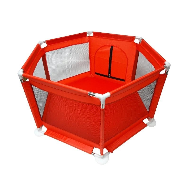 Velká ohrádka / dětské hřiště. Může být použit jako suchý bazén - ohrádka na míčky pro děti. Díky velkému průměru a vysokým stěnám umožní skvělou zábavu bez rizika rozsypání a ztráty míčků. Specifikace: Vnější průměr: cca. 130 cm vnitřní průměr: cca. 115 cm vzdálenost mezi protilehlými stěnami: cca. 110 cm Výška: 63 cm Šířka jednotlivé stěny šestiúhelníku: cca. 60 cm Materiál: tkanina oxford 150D Pevná kovová konstrukce s plastovými spojkami Vstup uzavíratelný na zipy Stěny vyrobené ze síťoviny, což zajišťuje odpovídající osvětlení uvnitř a usnadňuje dozor nad hrou opatrovníkem. rozměry balení: 60x16x16cm Počet kusů. na paletě: 80