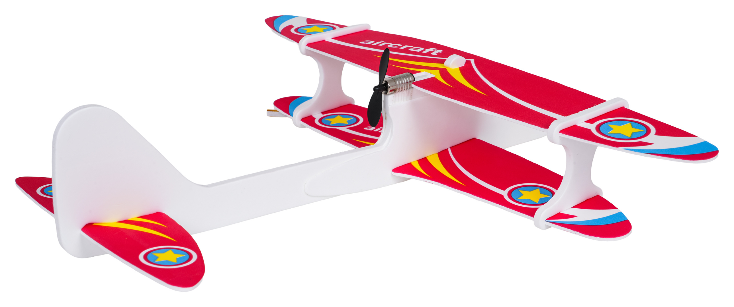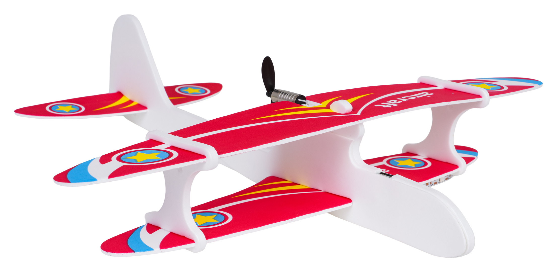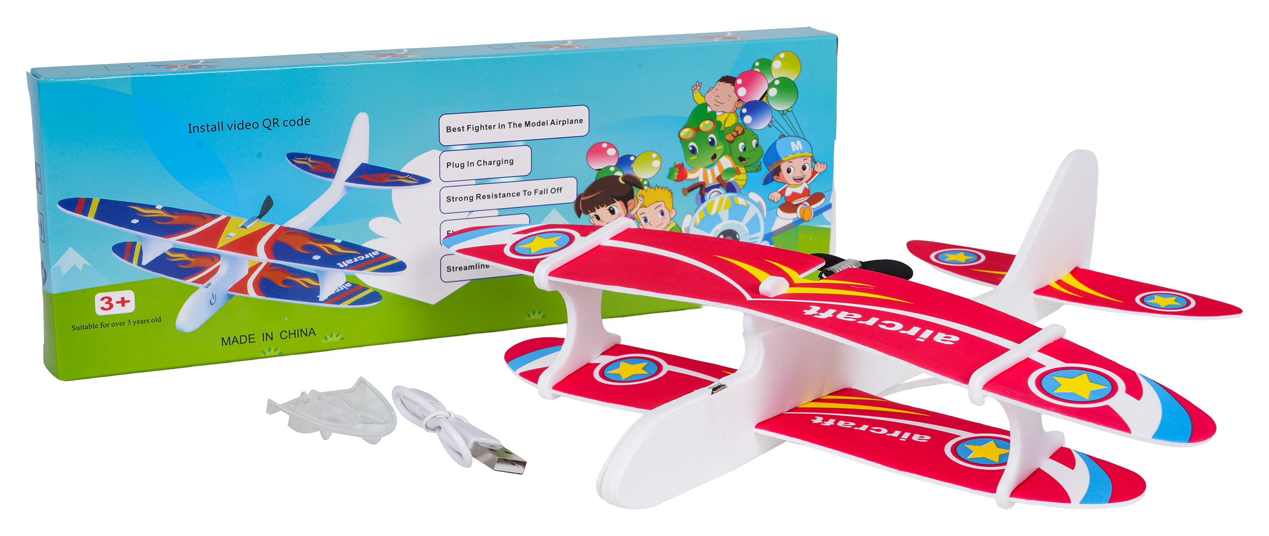 Barevné polystyrenové letadlo vybavené elektrickým motorem pro děti od tří let. Materiál, ze kterého je letadlo vyrobeno, je odolný a lehký, což umožňuje letadlu plynulé a stabilní lety a poskytuje ochranu před poškozením. Lze si s ním hrát jak uvnitř, tak venku. Instrukce k použití letadla je velmi jednoduchá, stačí vypustit letadlo z rukou a ono začne stabilně létat dokola. Po 15 sekundách se motor automaticky vypne. Letadlo je napájeno akumulátorem typu 3,7 V (v balení) a nabíjeno kabelem USB.