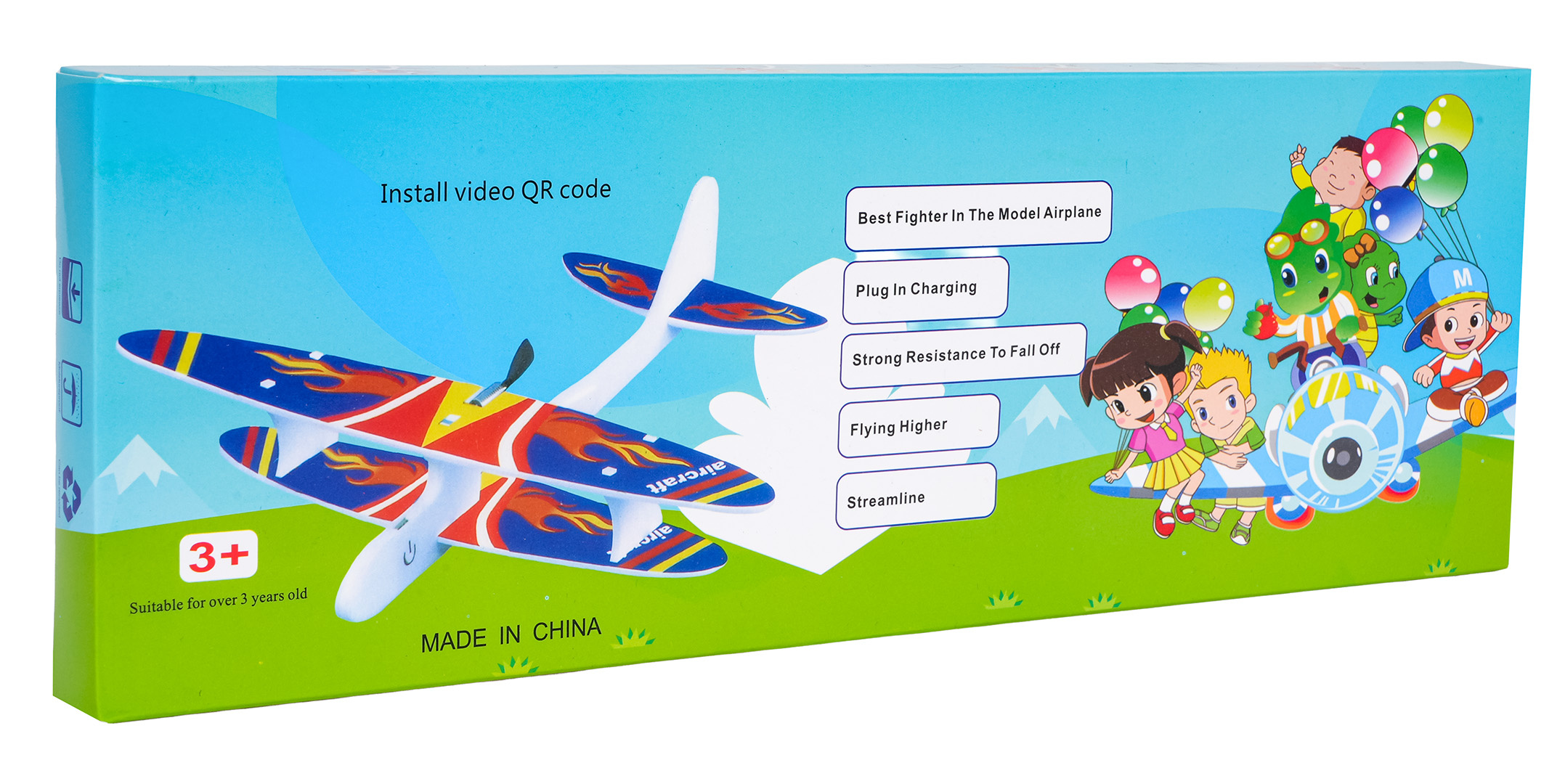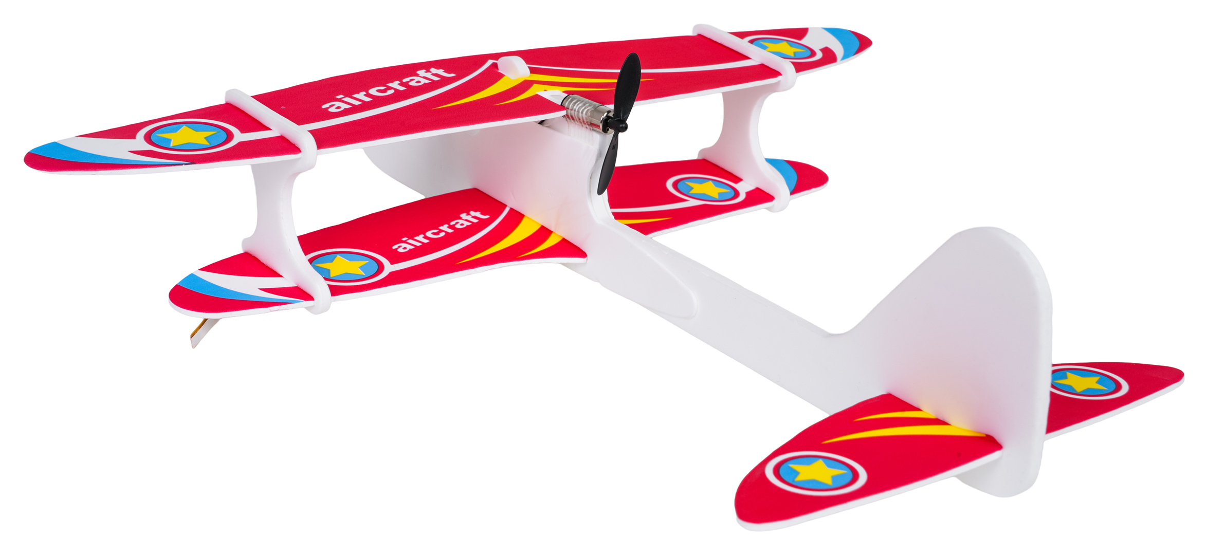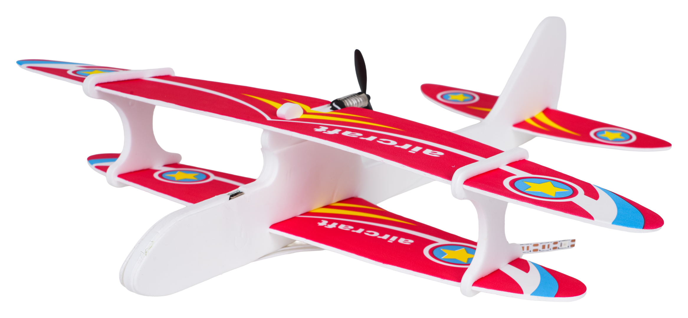 Barevné polystyrenové letadlo vybavené elektrickým motorem pro děti od tří let. Materiál, ze kterého je letadlo vyrobeno, je odolný a lehký, což umožňuje letadlu plynulé a stabilní lety a poskytuje ochranu před poškozením. Lze si s ním hrát jak uvnitř, tak venku. Instrukce k použití letadla je velmi jednoduchá, stačí vypustit letadlo z rukou a ono začne stabilně létat dokola. Po 15 sekundách se motor automaticky vypne. Letadlo je napájeno akumulátorem typu 3,7 V (v balení) a nabíjeno kabelem USB.