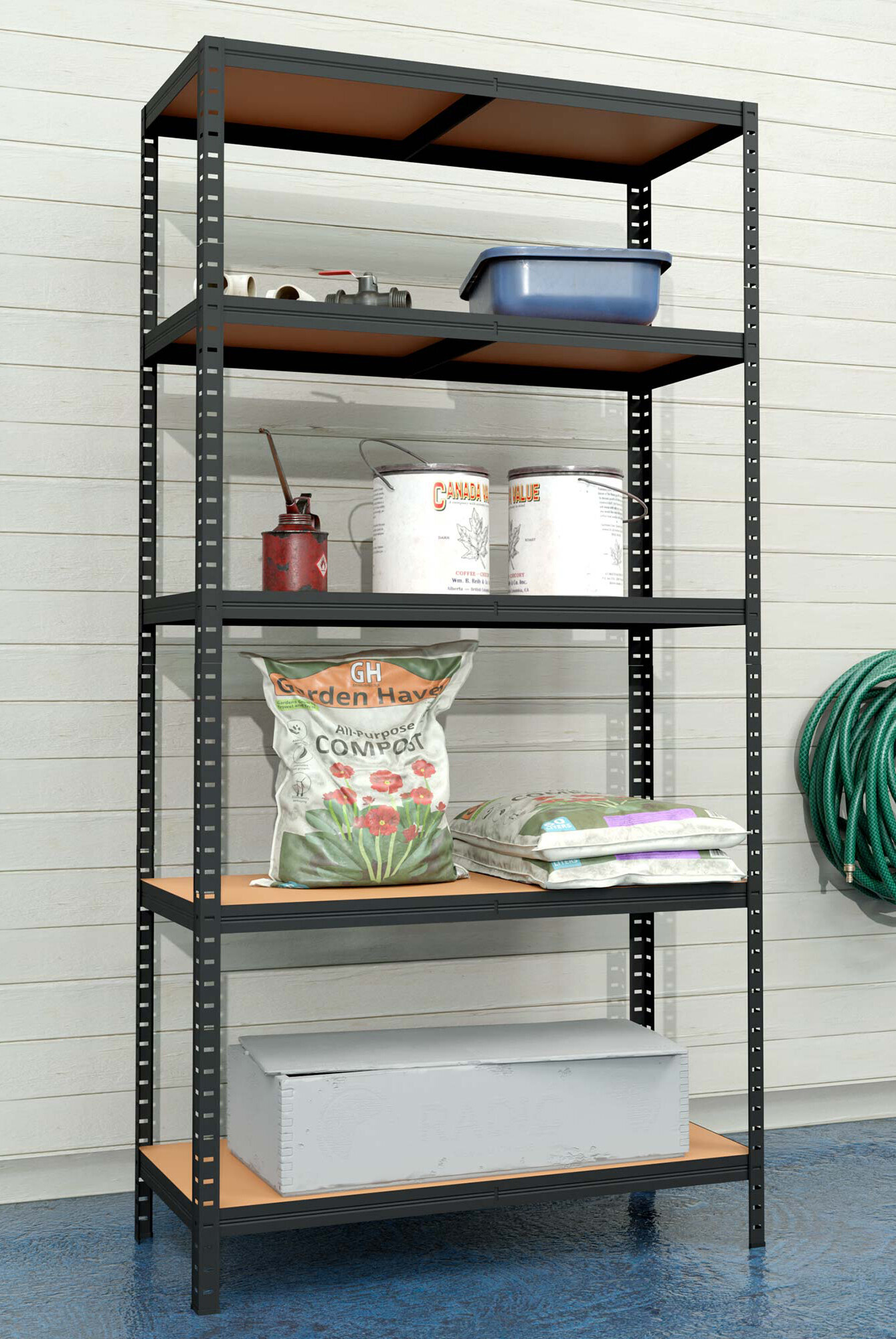 Na výšce cca 180 cm máte k dispozici 5 polic z mdf, které lze výškově vložit dle potřeby. Rám z galvanizované oceli ve stříbrné barvě zaručuje stabilitu a velkou nosnost cca 875 kg (na každou polici připadá cca 175 kg).