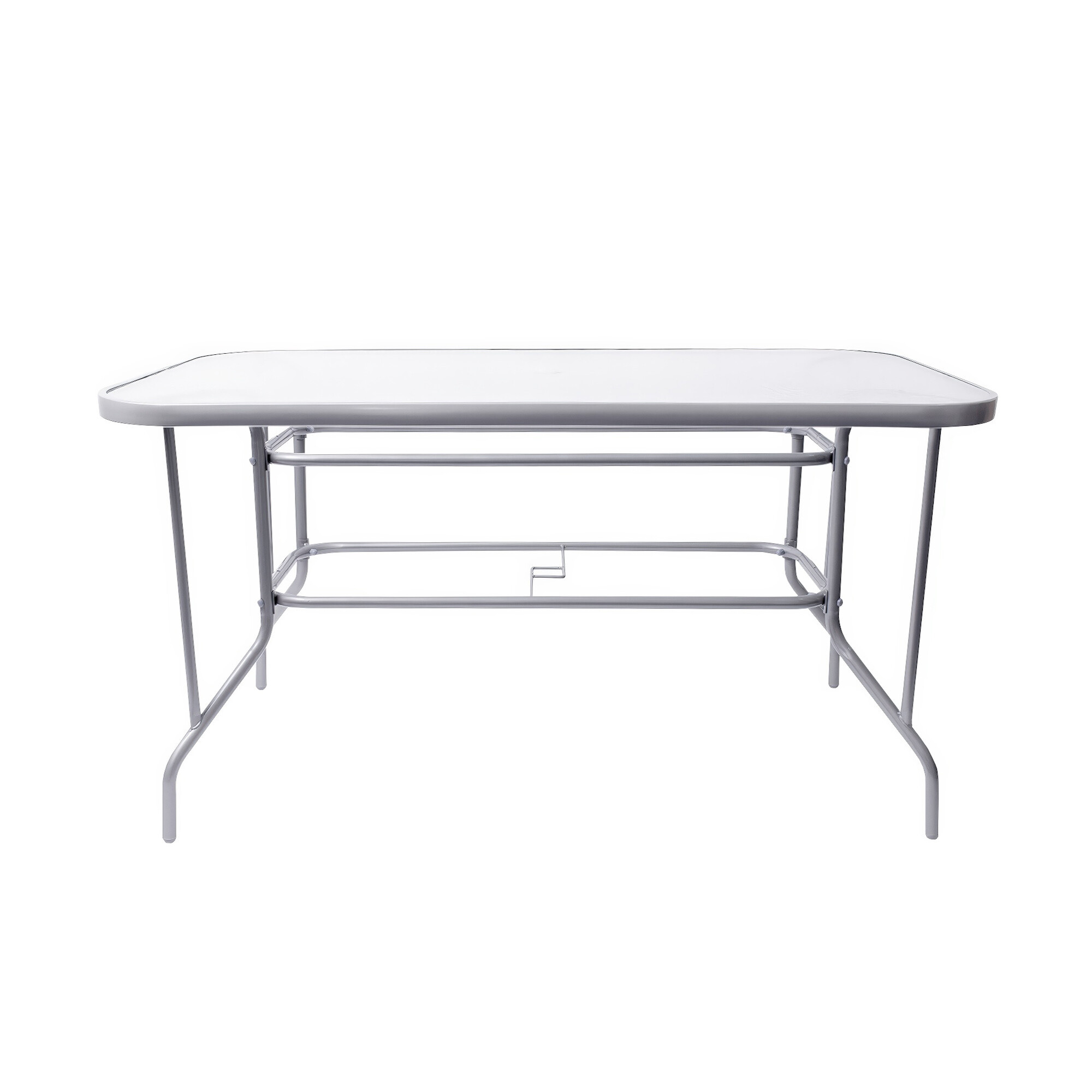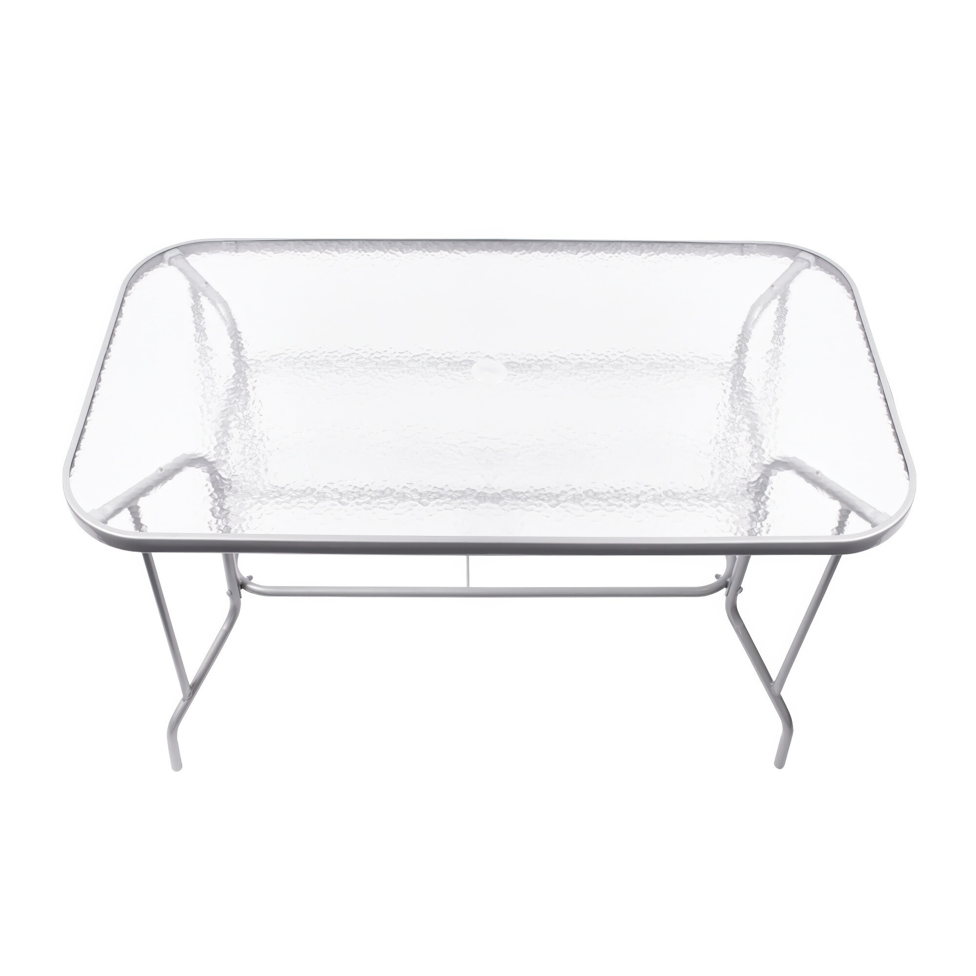 Zahradní stůl MILANO s pevným kovovým rámem a texturovanou skleněnou deskou v moderním designu, vhodný pro zahrady, terasy, kavárny, altánky, balkóny či pláže.