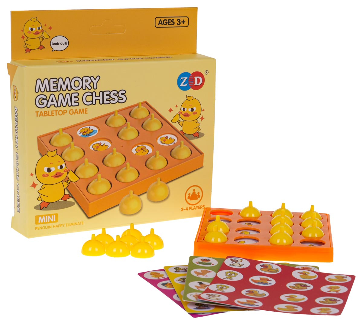 Logická rodinná hra Memory, pro děti od 3 let a dospělé. Sada se skládá z dvouúrovňové desky s otvory ve tvaru koleček a karet s obrázky kachen v různých pozicích. Vkládáme kartu s kresbami mezi desky a zakrýváme otvory kužely. Hráči si musí zapamatovat, na kterém poli je ukryta daná kachna. Zvedneme daný kužel a pokusíme se najít identický obrázek. Vyhrává hráč, který najde nejvíce párů. Hra učí trpělivosti, cvičí paměť a koncentraci.