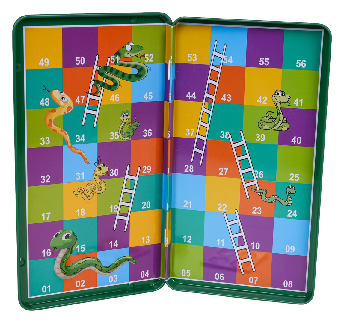 Magnetická hra Žebříky a Hadi pro děti od tří let. Hra je malých rozměrů, takže ji můžete vzít všude s sebou, figurky jsou magnetické a dobře drží na desce. V této sadě nám kovová krabička hry slouží jako herní deska, díky čemuž jsou rozměry hry omezeny na minimum.