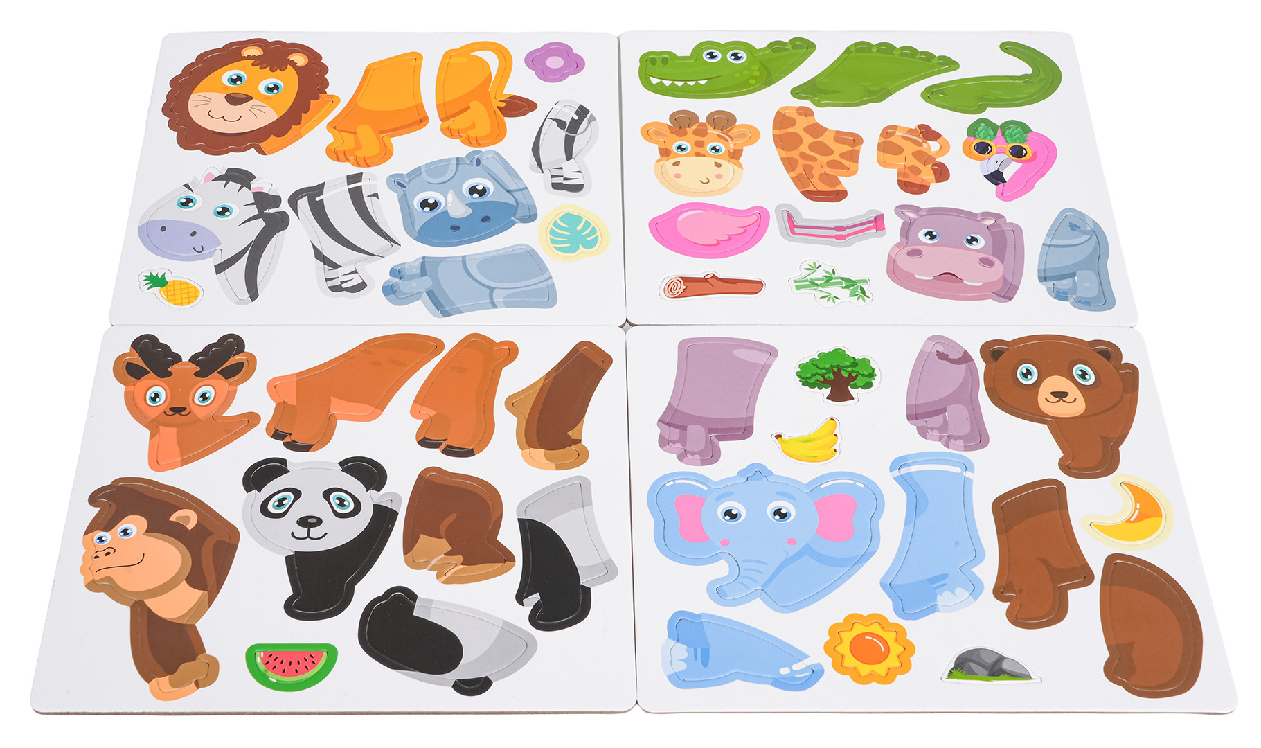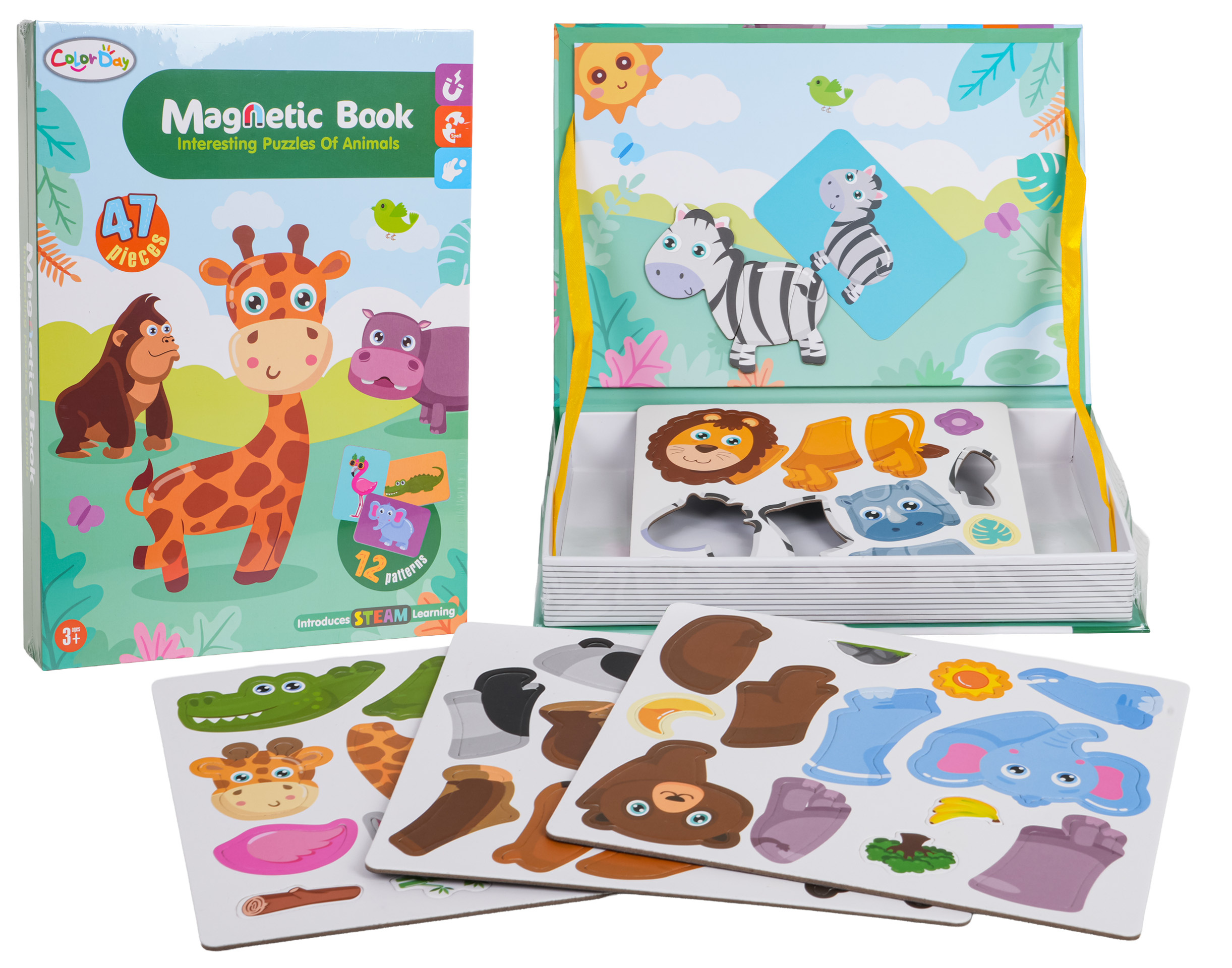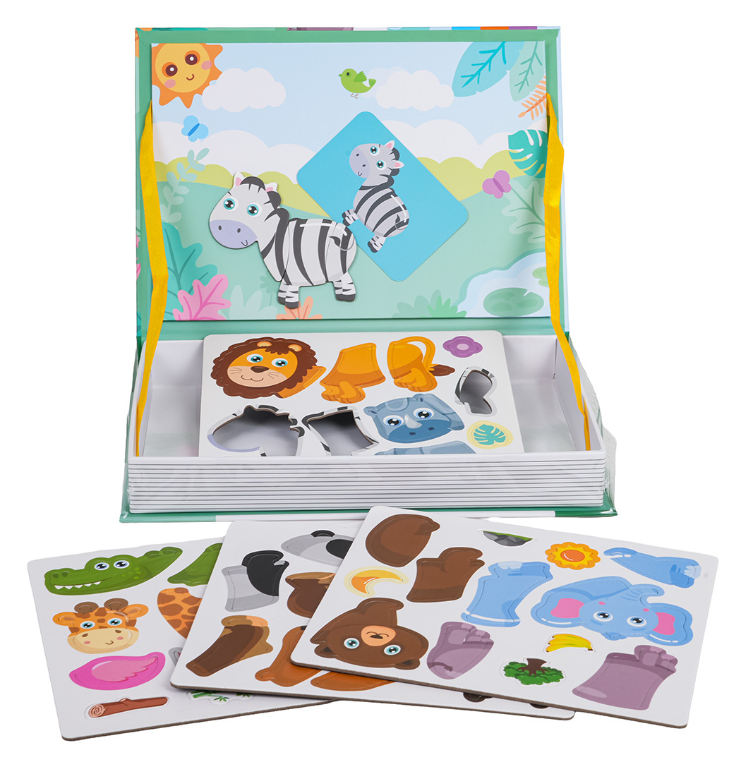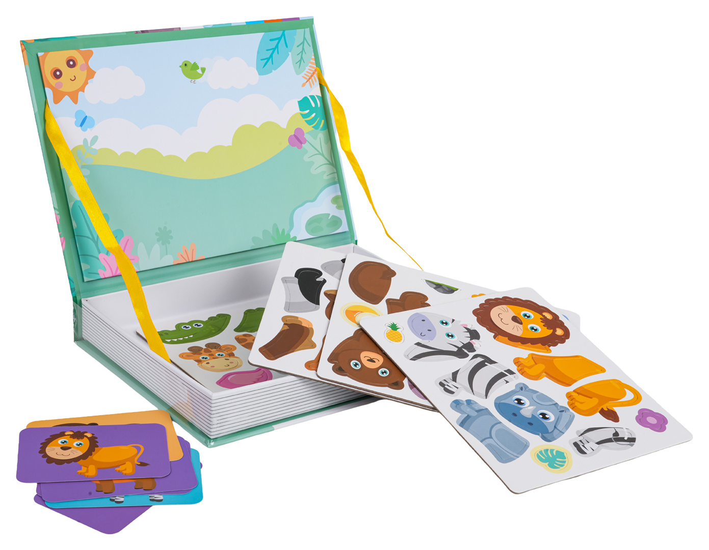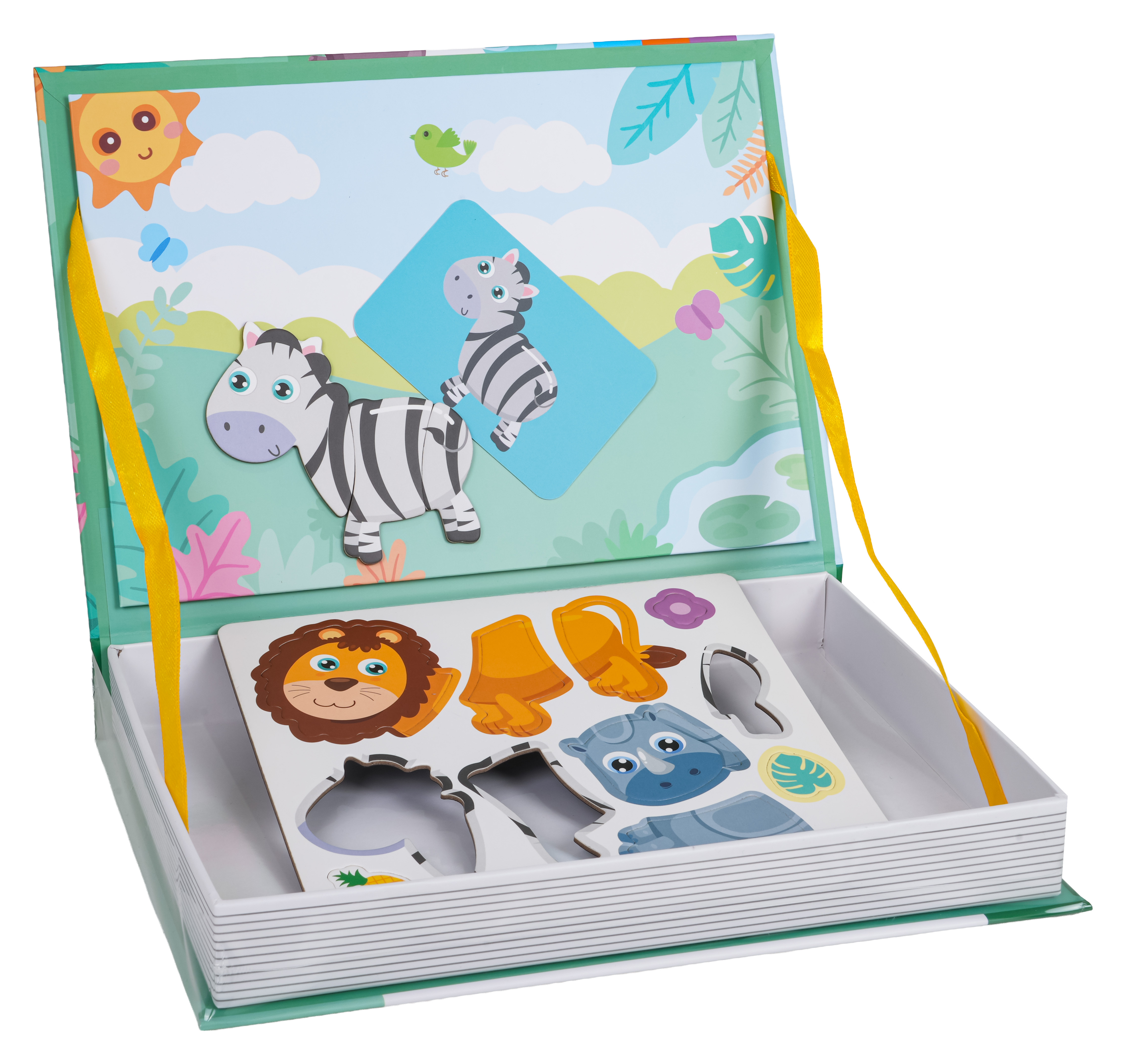 Magnetická kniha, vzdělávací skládačka pro děti starší tří let. Knížka bude ideální jako dárek. Hrou se dítě seznámí se zvířátky a procvičí si ručičky. Po otevření knížky může dítě v horní části připínat puzzle se zvířátky. Tvoří tak svým způsobem vlastní příběh, pokaždé jiný. Sada se skládá z magnetických prvků a 6 oboustranných karet.
