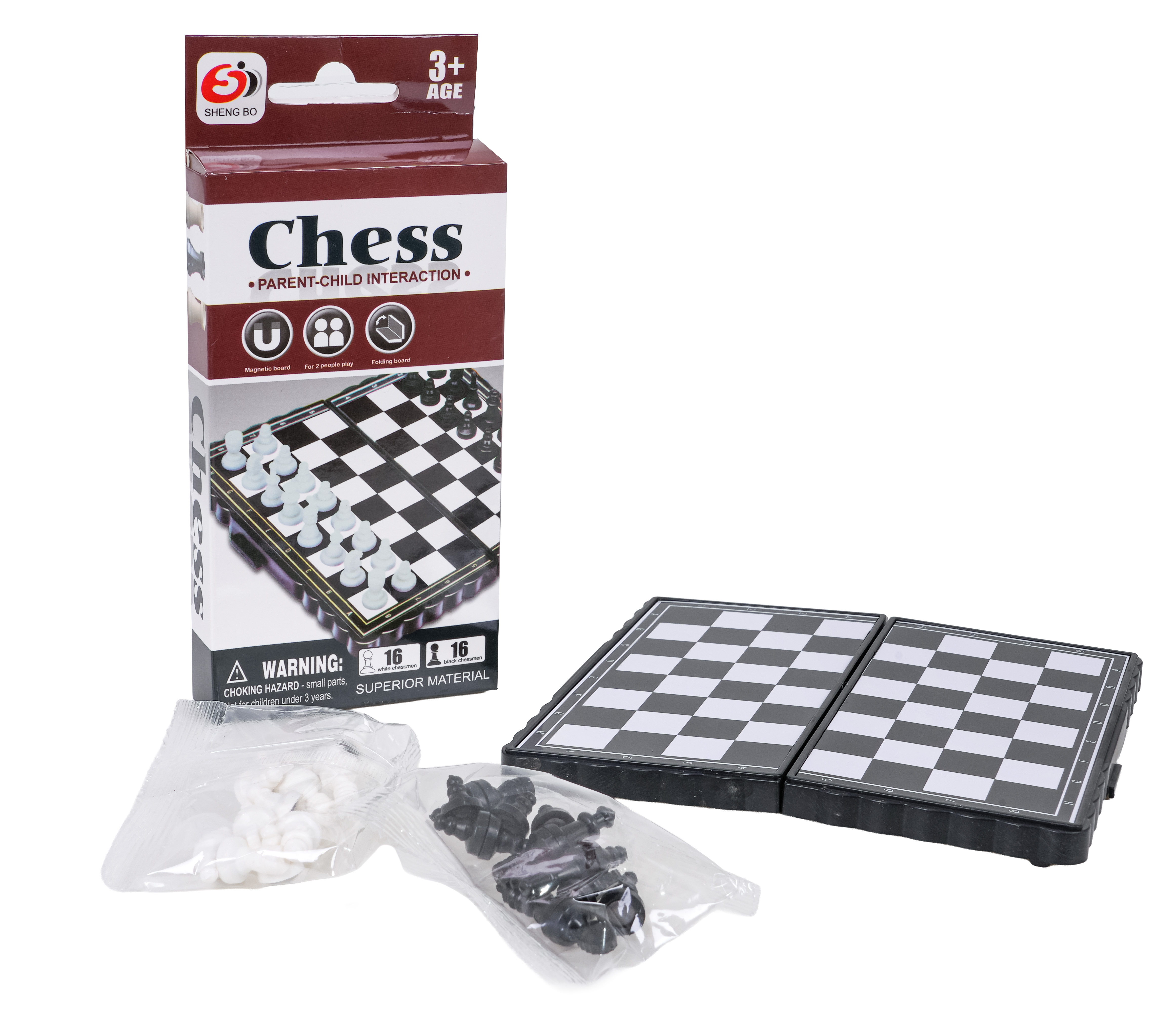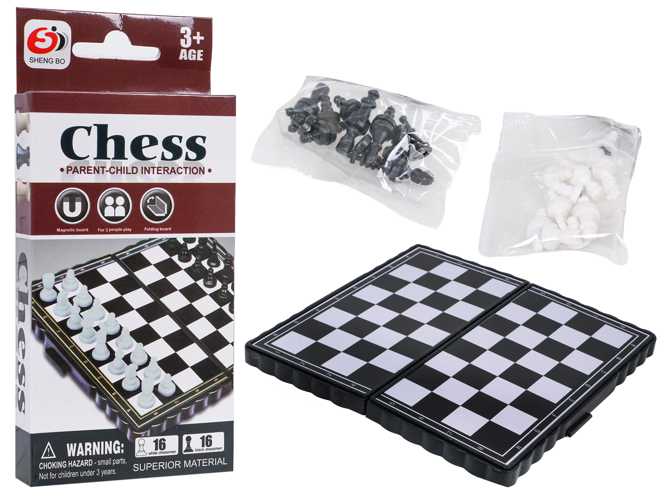 Magnetická desková hra šachy pro děti od tří let. Hra se skládá z rozkládací desky a magnetických figurek. Díky magnetickým figurkám lze hru hrát kdekoli bez obav ze ztráty figurek. Skládací deska nezabírá mnoho místa. Kompaktní velikost praktická pro přenášení. Hra v šachy bude ideální pro osobu v každém věku. Zlepšuje myšlení, strategické plánování, schopnost posouzení situace.
