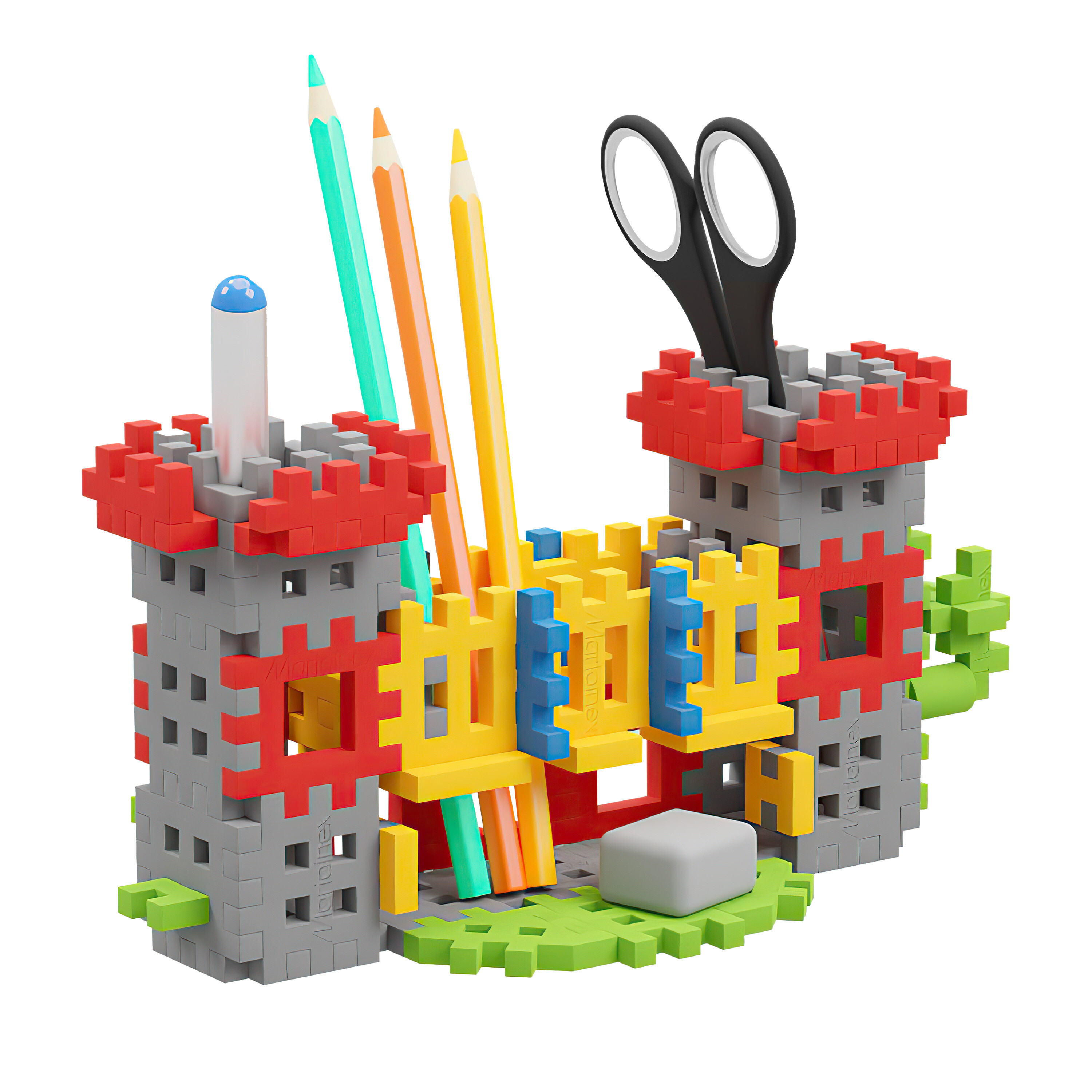 Sestavte si vlastní organizéry na psací a výtvarné potřeby. Získáte tak kreativní a velmi praktickou dekoraci pracovního stolu. Sada se skládá ze 140 prvků vytvoříte z nich organizér ve tvaru draka a hradu, které pojmou všechny potřebné školní potřeby.