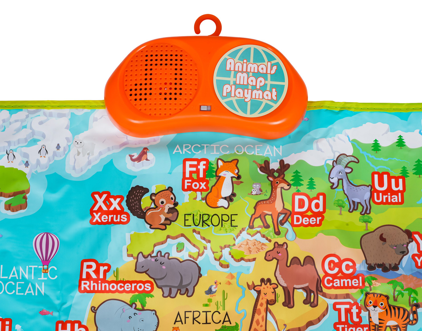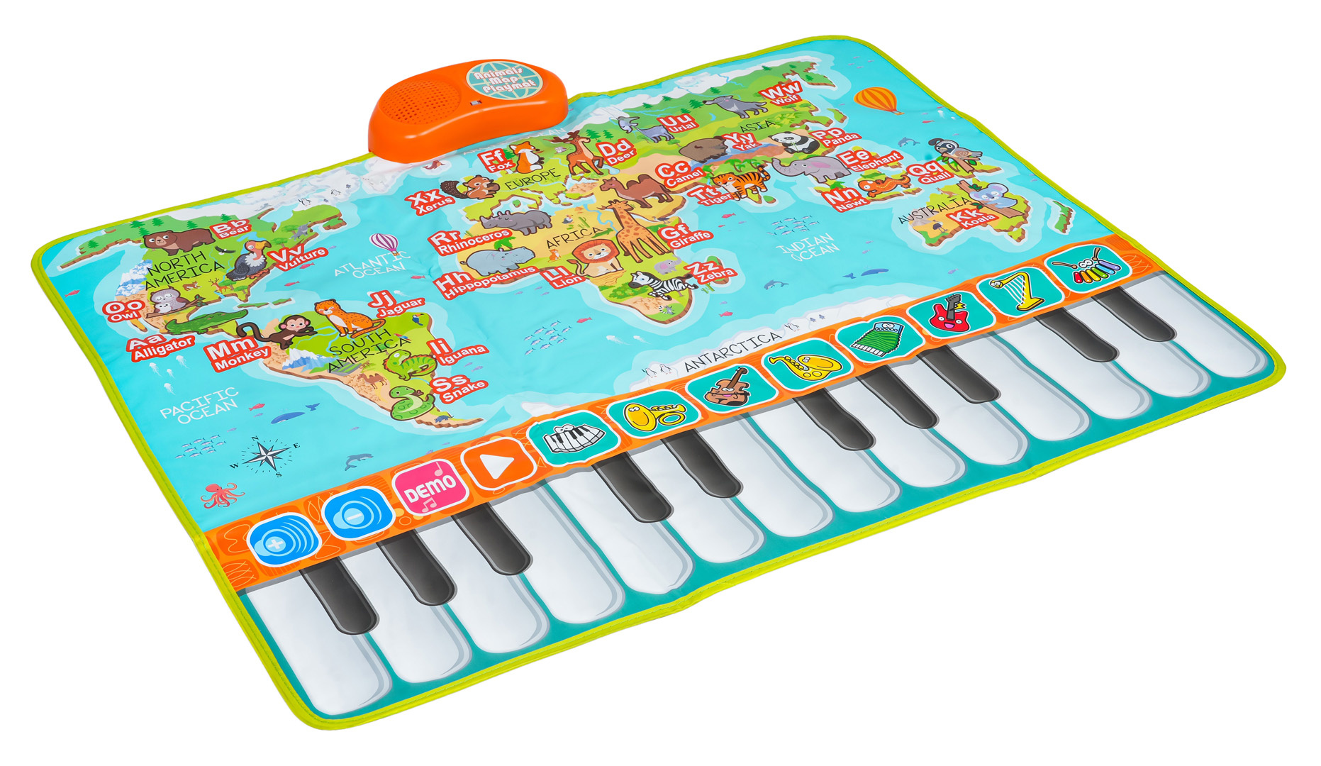 Interaktivní vzdělávací podložka s piánkem a zvířátky pro děti od tří let. Vyrobena z vysoce kvalitních materiálů, s protiskluzovým spodkem, horní vrstva barevná, příjemná na dotek. Na vrchu podložky se nachází reproduktor s vypínačem On/Off. Níže mapa s barevnými kontinenty, zvířátky a písmenky, dotykové klávesy s režimy činnosti a piánko. Malý pozná 26 zvířátek, po stisknutí každého zvířátka uslyší jeho název v angličtině, a po stisknutí písmenka, jeho výslovnost. Na dotykovém panelu s režimy provozu máme regulaci hlasitosti, režim Demo s deseti připravenými písněmi, režim přehrávání a 8 nástrojů na výběr: piáno, trubka, kytara, saxofon, harmonika, housle, harfa a cimbálky. Dotykové pianko má 24 kláves, v bílé a černé barvě pro samostatnou hru. Mata může fungovat ve dvou režimech: herní režim a demo režim. Podložka spojuje zábavu s učením, rozvíjí kognitivní schopnosti, učí písmena, zvířata a uvádí do světa hudby. Mata je napájena bateriemi typu 3 x AA 1,5V (nejsou součástí balení).