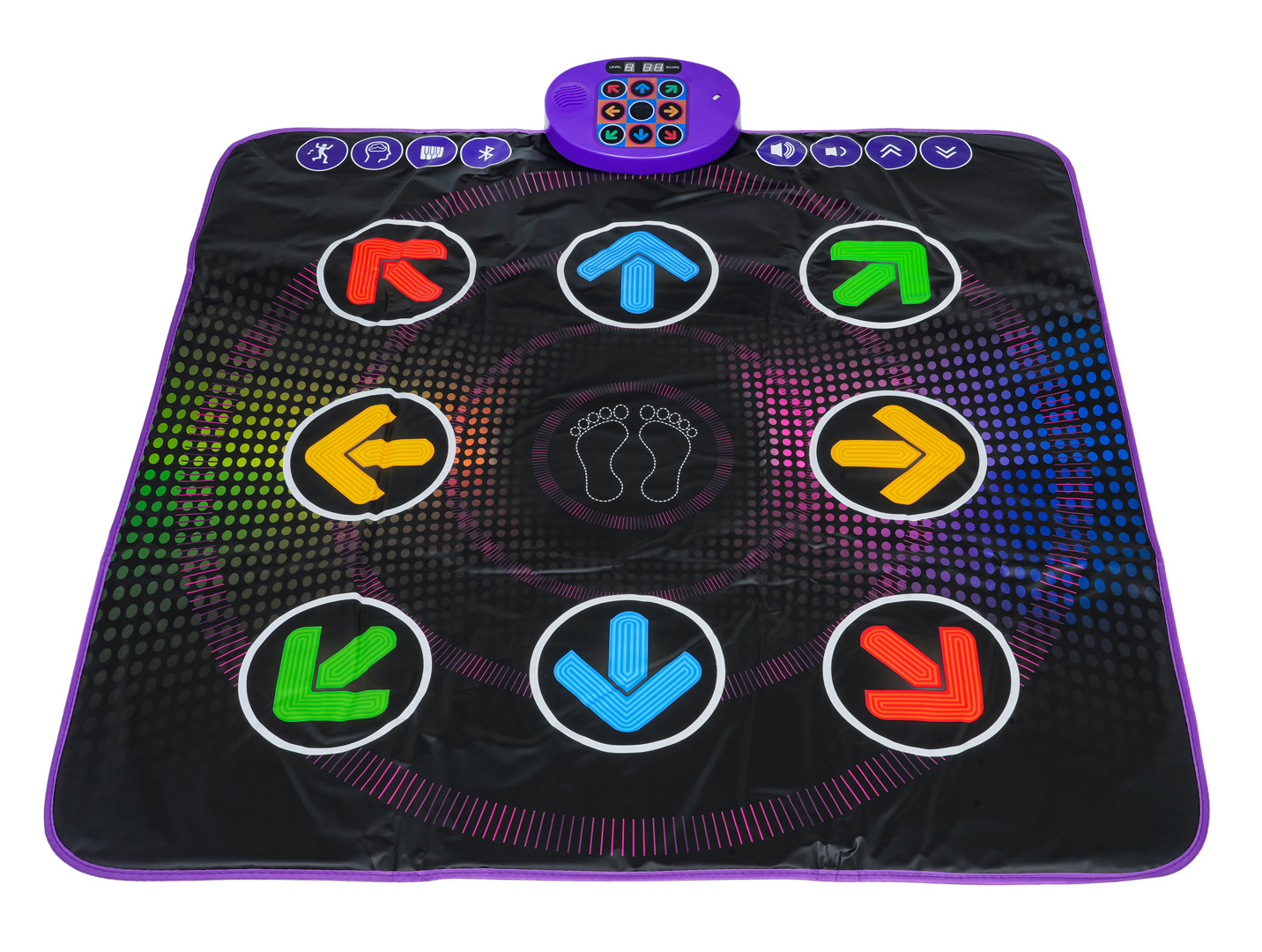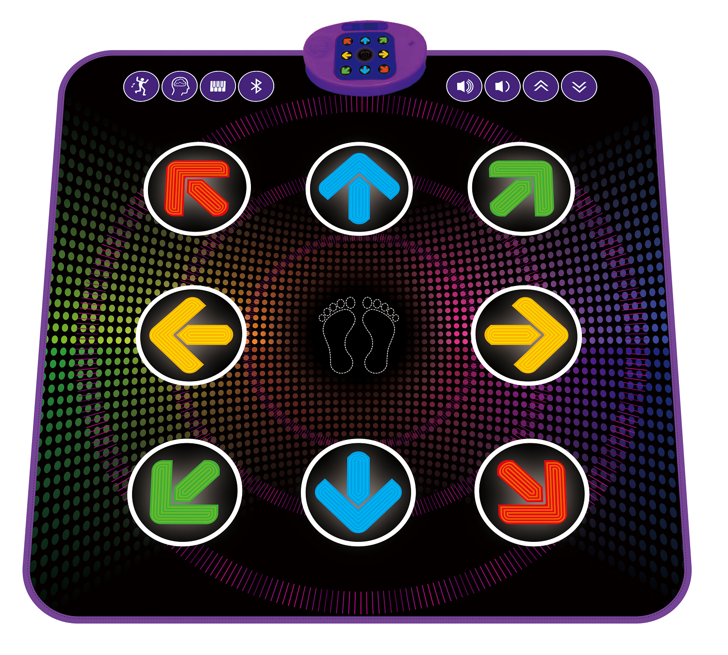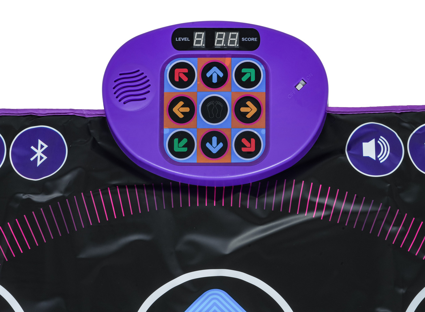 Tanečně-hudební podložka pro děti od tří let. Vyrobena z vysoce kvalitních materiálů, s protiskluzovým spodkem, horní vrstva barevná, příjemná na dotek. Na horní části podložky se nachází displej s podsvícenými šipkami, které ukazují, jakou pozici zaujmout na podložce. Displej je napájen bateriemi typu 3 x AA 1,5V (nejsou součástí balení). Pod displejem jsou umístěna dotyková tlačítka pro výběr režimů, zapnutí Bluetooth, nastavení hlasitosti a úrovně obtížnosti. Plocha na tančení se skládá z centrálního místa s kresbou nohou a osmi šipek. Tancovat můžeme různými způsoby, následováním displeje ukazujícího pozici na podložce, použitím paměťového režimu, ve kterém displej nejprve ukazuje, jaké pohyby je třeba provést, a jejich opakováním, nebo tancovat libovolně a vydávat zvuky jako na klavíru. Máme také možnost připojit Bluetooth podložku a přehrávat na ní svou oblíbenou hudbu. Můžeme regulovat úroveň hlasitosti a obtížnosti. Ideální podložka pro děti, které rády tráví čas aktivně. Podložka zlepšuje pohybovou koordinaci, zdokonaluje hudební sluch a je skvělým způsobem, jak společně aktivně trávit čas.