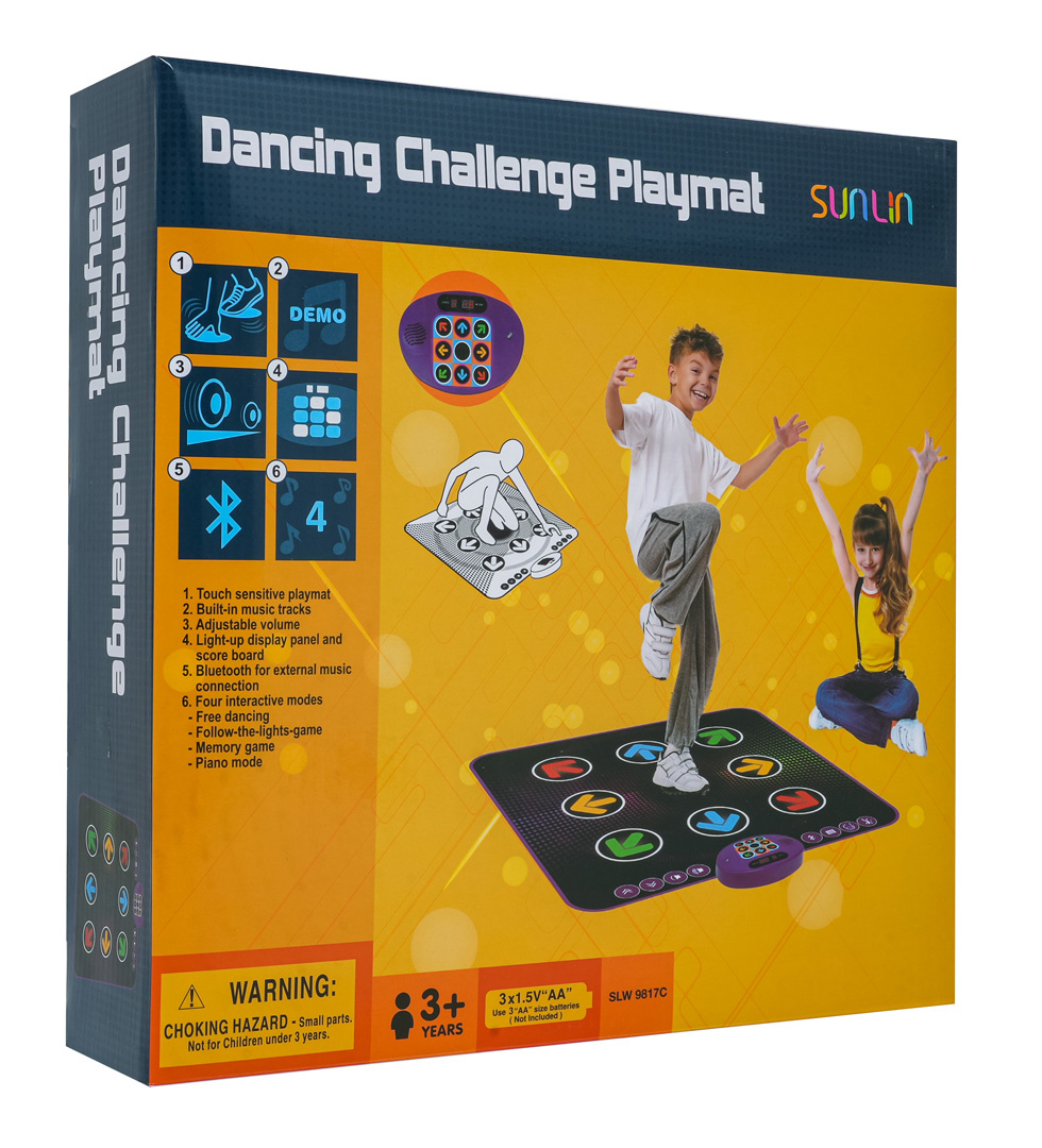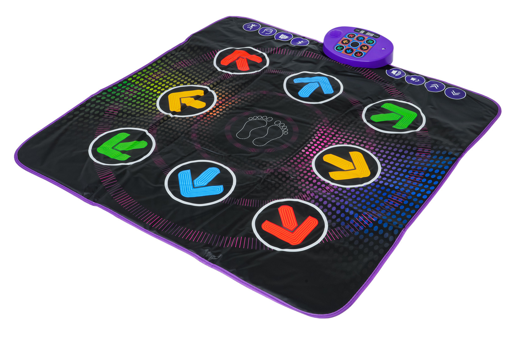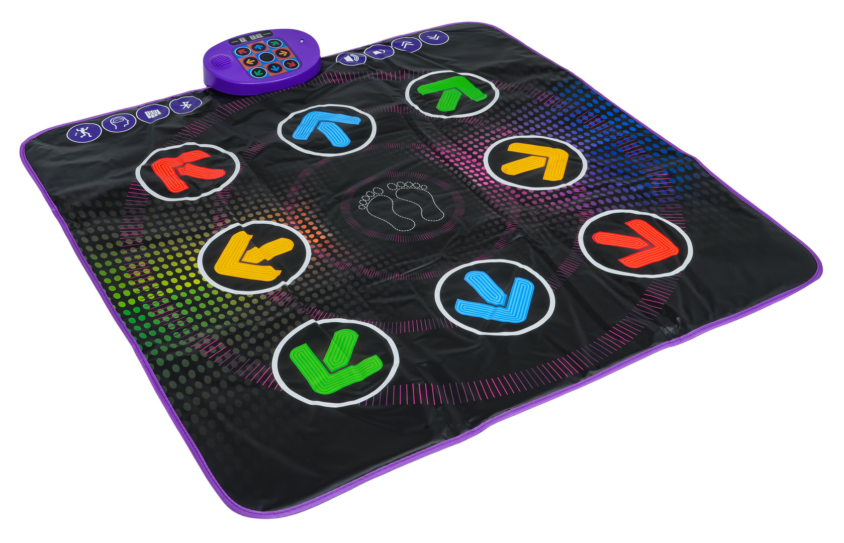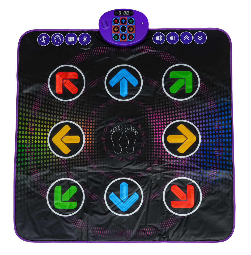 Tanečně-hudební podložka pro děti od tří let. Vyrobena z vysoce kvalitních materiálů, s protiskluzovým spodkem, horní vrstva barevná, příjemná na dotek. Na horní části podložky se nachází displej s podsvícenými šipkami, které ukazují, jakou pozici zaujmout na podložce. Displej je napájen bateriemi typu 3 x AA 1,5V (nejsou součástí balení). Pod displejem jsou umístěna dotyková tlačítka pro výběr režimů, zapnutí Bluetooth, nastavení hlasitosti a úrovně obtížnosti. Plocha na tančení se skládá z centrálního místa s kresbou nohou a osmi šipek. Tancovat můžeme různými způsoby, následováním displeje ukazujícího pozici na podložce, použitím paměťového režimu, ve kterém displej nejprve ukazuje, jaké pohyby je třeba provést, a jejich opakováním, nebo tancovat libovolně a vydávat zvuky jako na klavíru. Máme také možnost připojit Bluetooth podložku a přehrávat na ní svou oblíbenou hudbu. Můžeme regulovat úroveň hlasitosti a obtížnosti. Ideální podložka pro děti, které rády tráví čas aktivně. Podložka zlepšuje pohybovou koordinaci, zdokonaluje hudební sluch a je skvělým způsobem, jak společně aktivně trávit čas.