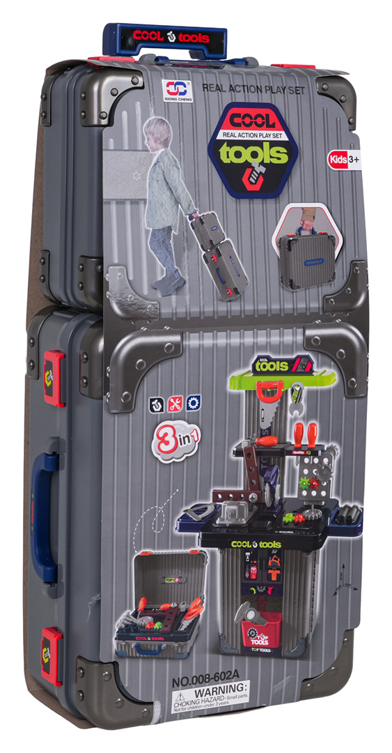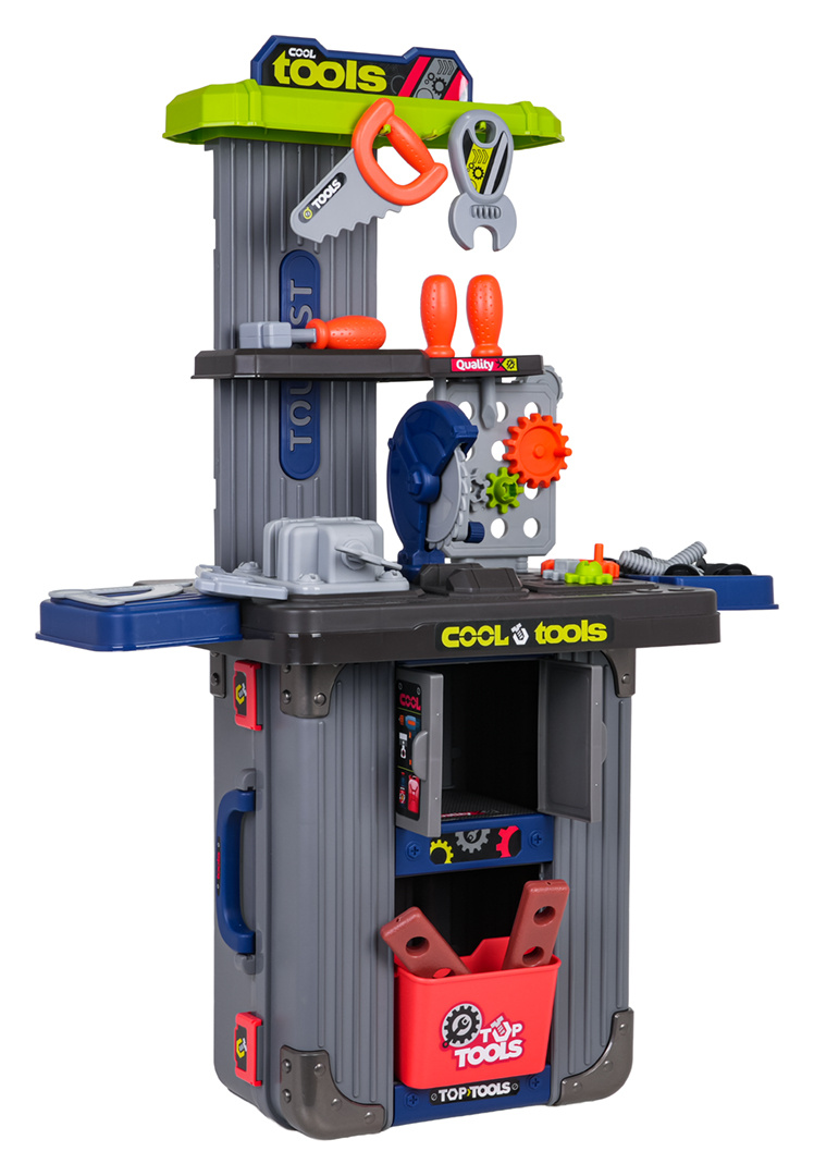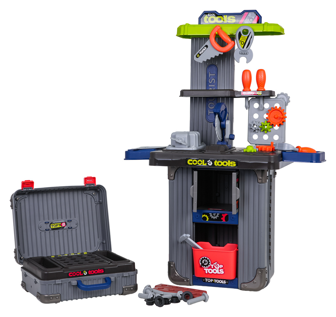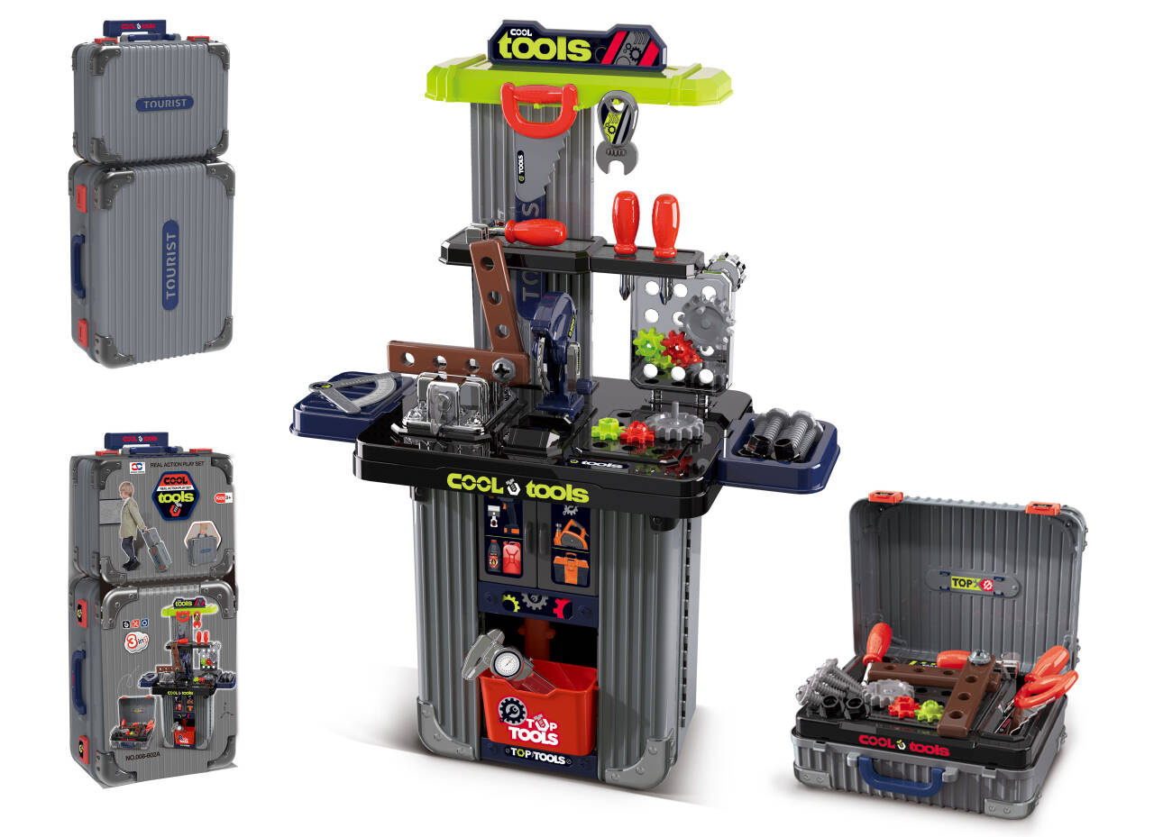 Bohatě vybavená sada 3v1, dva kufříky, které lze přeměnit na dílnu pro děti od tří let. Sada je vyrobena z nejkvalitnějšího plastu, odolného vůči intenzivnímu používání. V kufrech se nacházejí konstrukční části dílny a příslušenství jako ozubená kola, svěrák, pila, prvky k šroubování, šroubky, šroubováky a mnoho dalších.