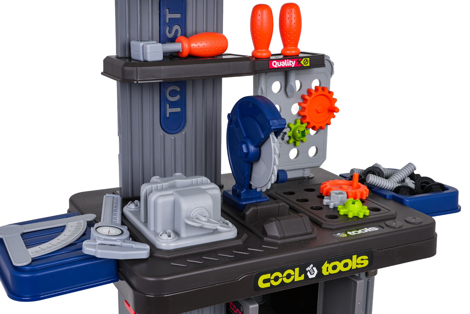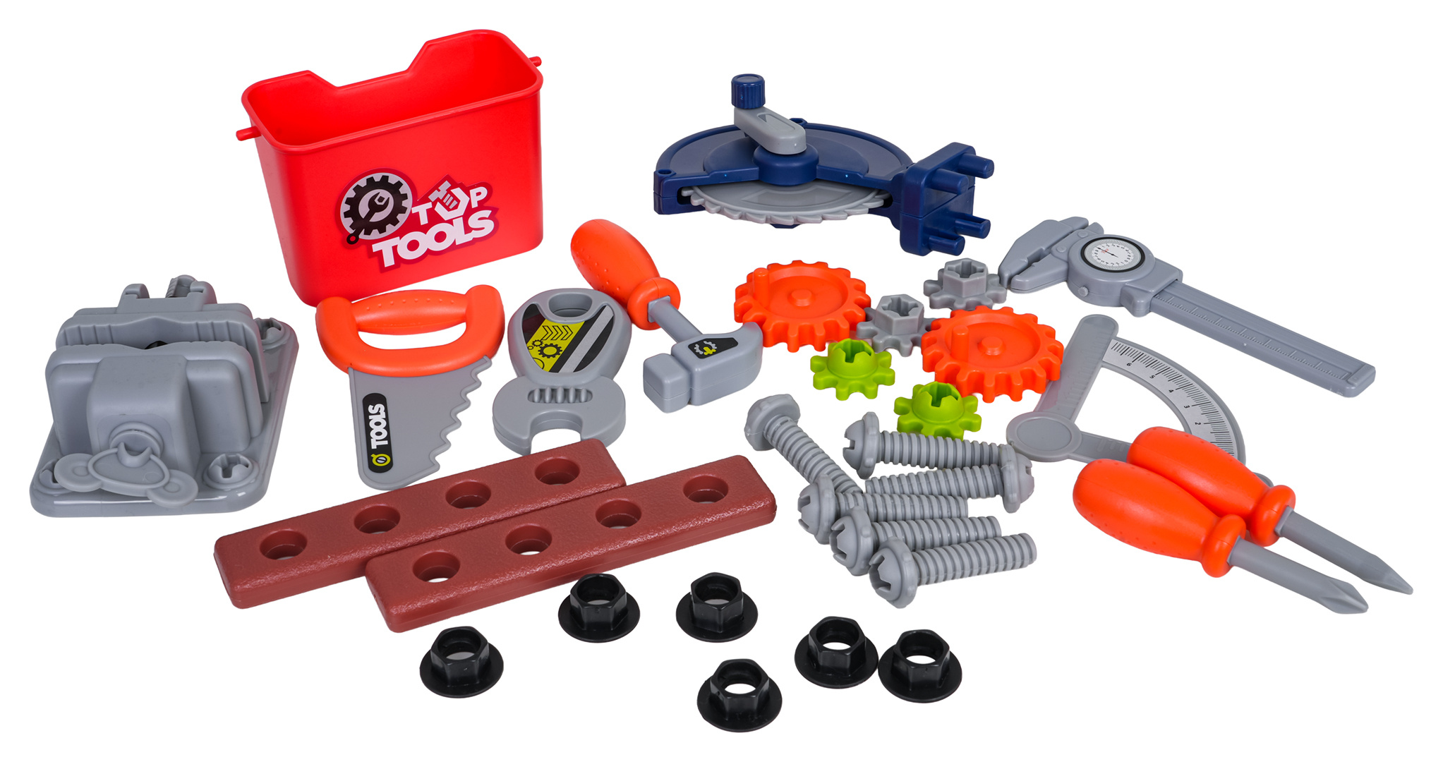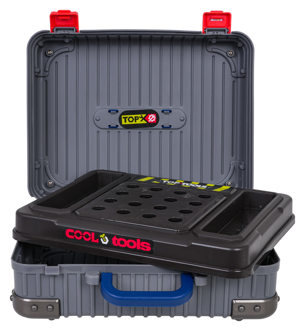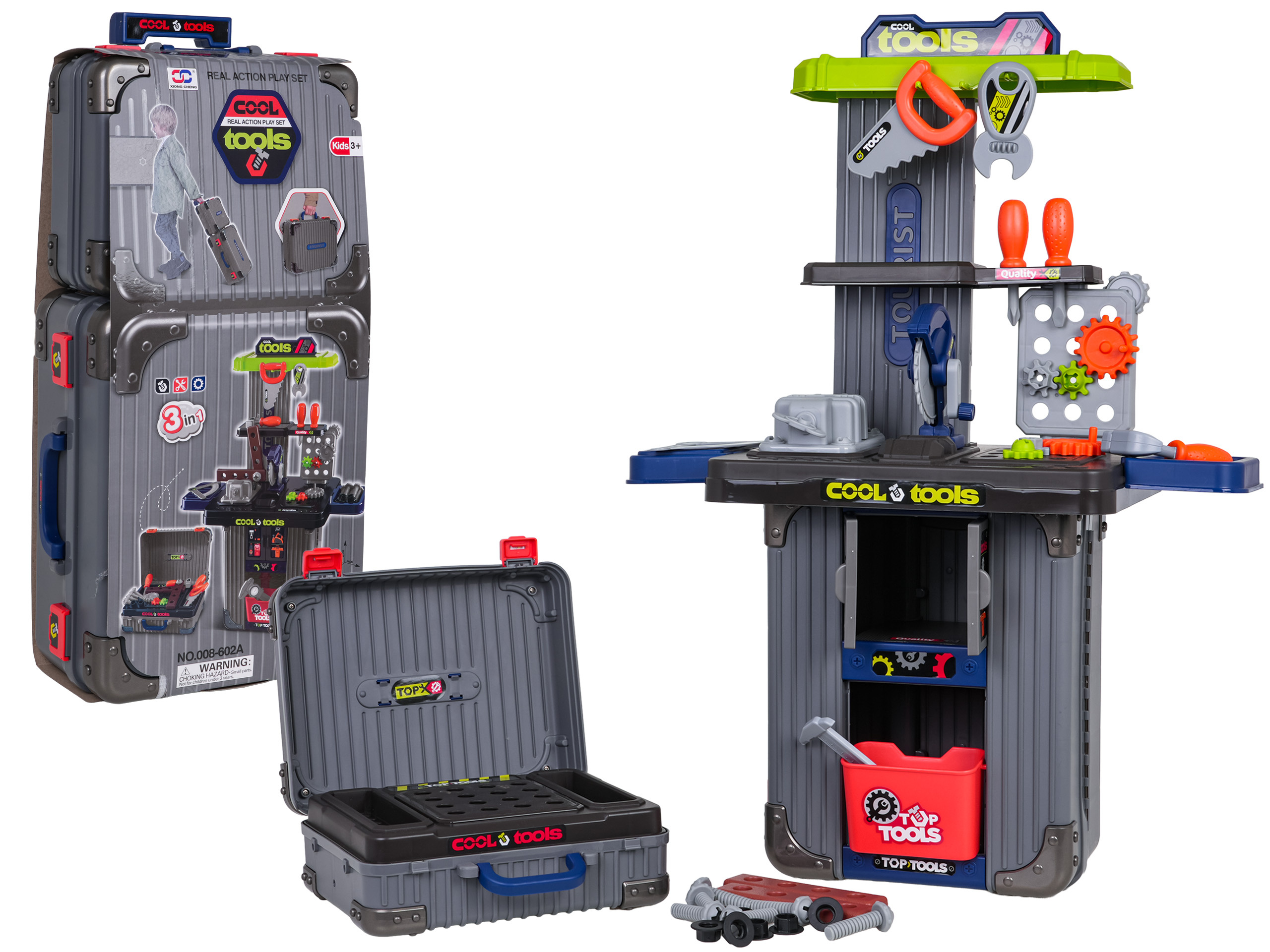 Bohatě vybavená sada 3v1, dva kufříky, které lze přeměnit na dílnu pro děti od tří let. Sada je vyrobena z nejkvalitnějšího plastu, odolného vůči intenzivnímu používání. V kufrech se nacházejí konstrukční části dílny a příslušenství jako ozubená kola, svěrák, pila, prvky k šroubování, šroubky, šroubováky a mnoho dalších.