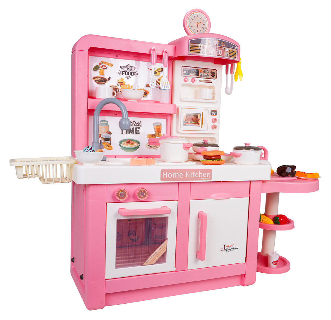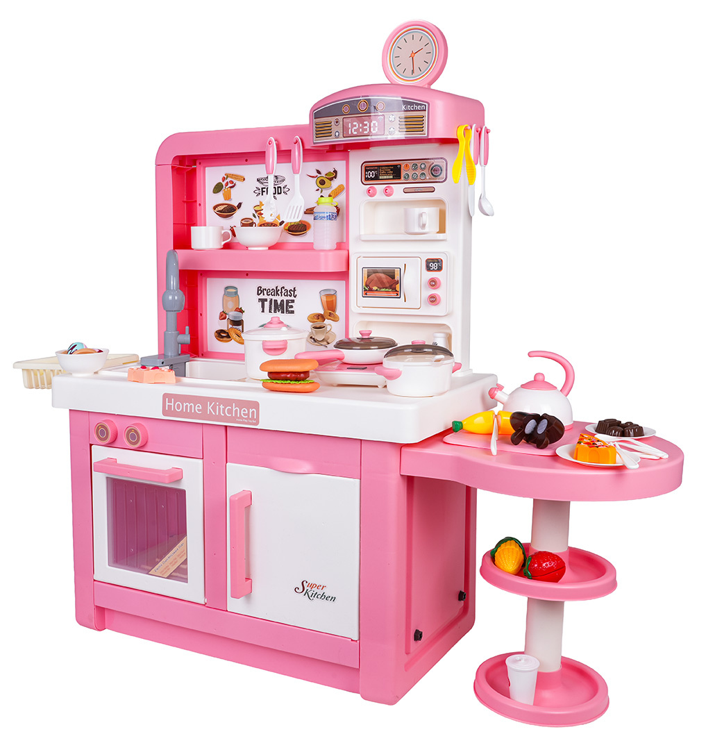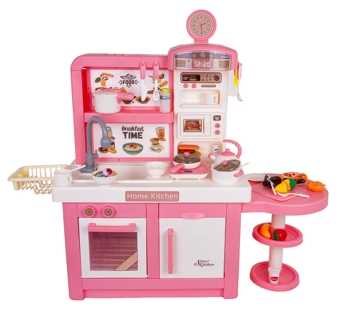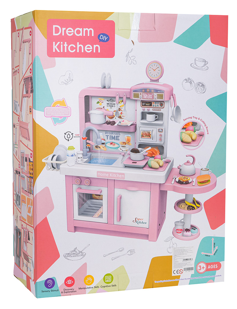 Interaktivní, bohatě vybavená kuchyně se zvukovými, světelnými a parními efekty pro děti od tří let. Všechny prvky sady jsou vyrobeny z nejkvalitnějších materiálů bezpečných pro děti. Kuchyně je laděna v růžovo-bílé tónině, bude se hodit do každého dětského pokoje. Hračka kuchyně obsahuje mikrovlnnou troubu, dřez s kohoutkem, indukční varnou desku, troubu, kávovar, lednici, stojan na dezerty a spoustu kuchyňských doplňků, jako jsou hrnce, příbory, talíře, konvice, hrnečky a atrapy potravin. Z kohoutku opravdu teče voda, indukční vařič je podsvícený, má displej teploty a vydává realistické zvuky vaření a smažení. Další atrakcí kuchyně je bezpečná (chladná) pára vycházející z jednoho z hrnců. Kohoutek je napájen bateriemi typu 2 x 1,5V AA (nejsou součástí balení), indukční deska bateriemi 3 x 1,5V AAA (baterie nejsou součástí balení).