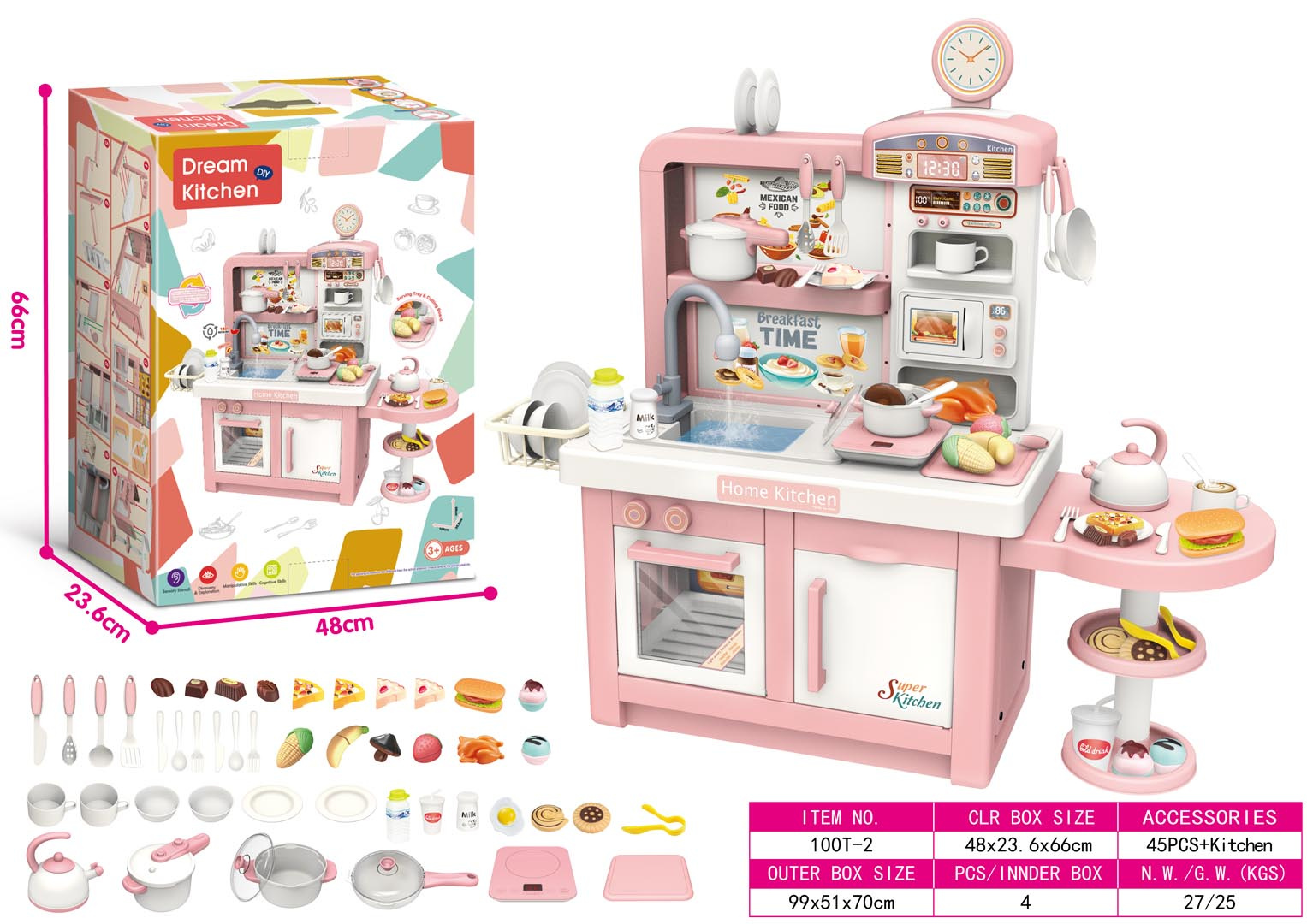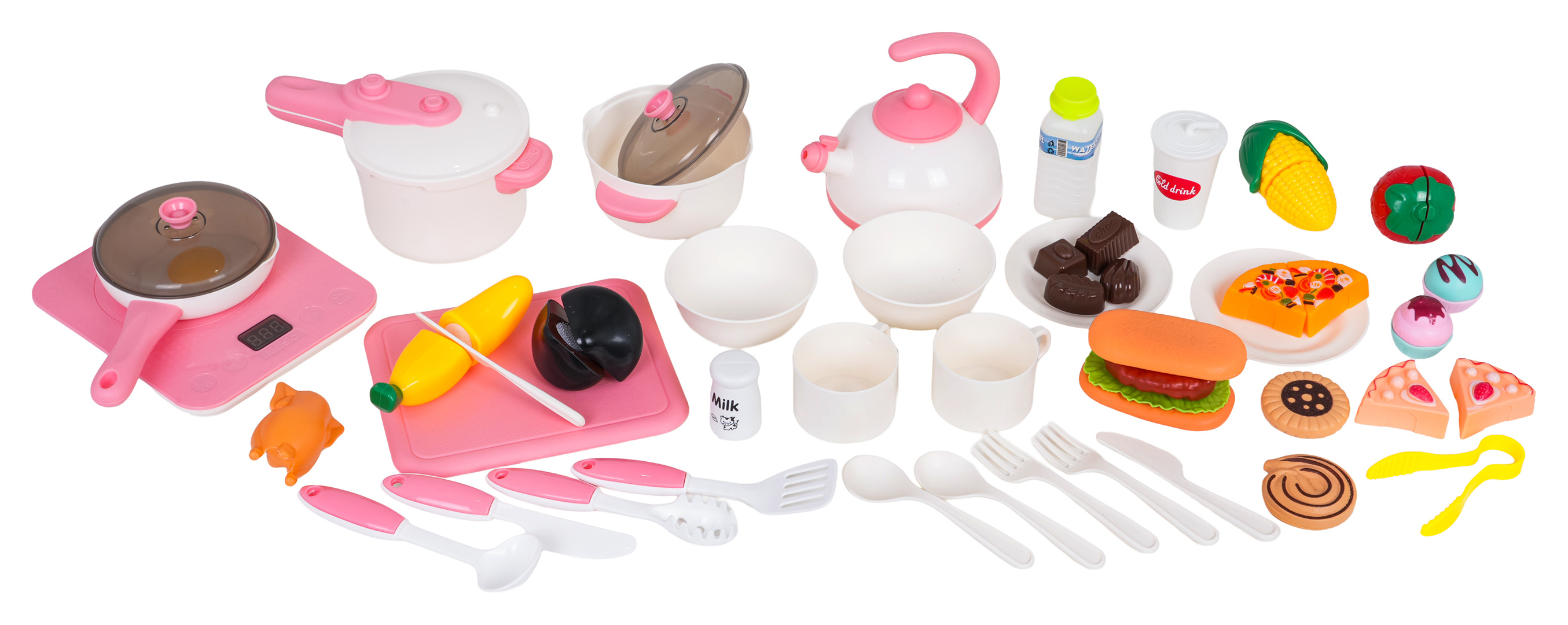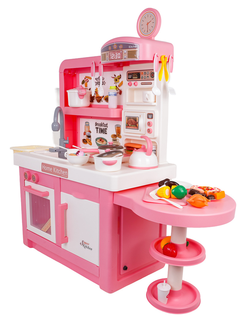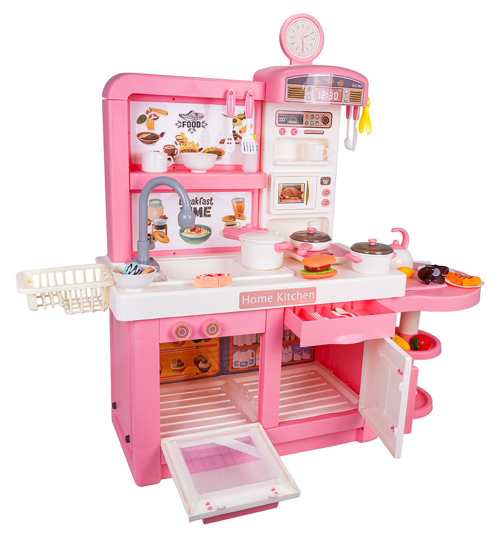 Interaktivní, bohatě vybavená kuchyně se zvukovými, světelnými a parními efekty pro děti od tří let. Všechny prvky sady jsou vyrobeny z nejkvalitnějších materiálů bezpečných pro děti. Kuchyně je laděna v růžovo-bílé tónině, bude se hodit do každého dětského pokoje. Hračka kuchyně obsahuje mikrovlnnou troubu, dřez s kohoutkem, indukční varnou desku, troubu, kávovar, lednici, stojan na dezerty a spoustu kuchyňských doplňků, jako jsou hrnce, příbory, talíře, konvice, hrnečky a atrapy potravin. Z kohoutku opravdu teče voda, indukční vařič je podsvícený, má displej teploty a vydává realistické zvuky vaření a smažení. Další atrakcí kuchyně je bezpečná (chladná) pára vycházející z jednoho z hrnců. Kohoutek je napájen bateriemi typu 2 x 1,5V AA (nejsou součástí balení), indukční deska bateriemi 3 x 1,5V AAA (baterie nejsou součástí balení).