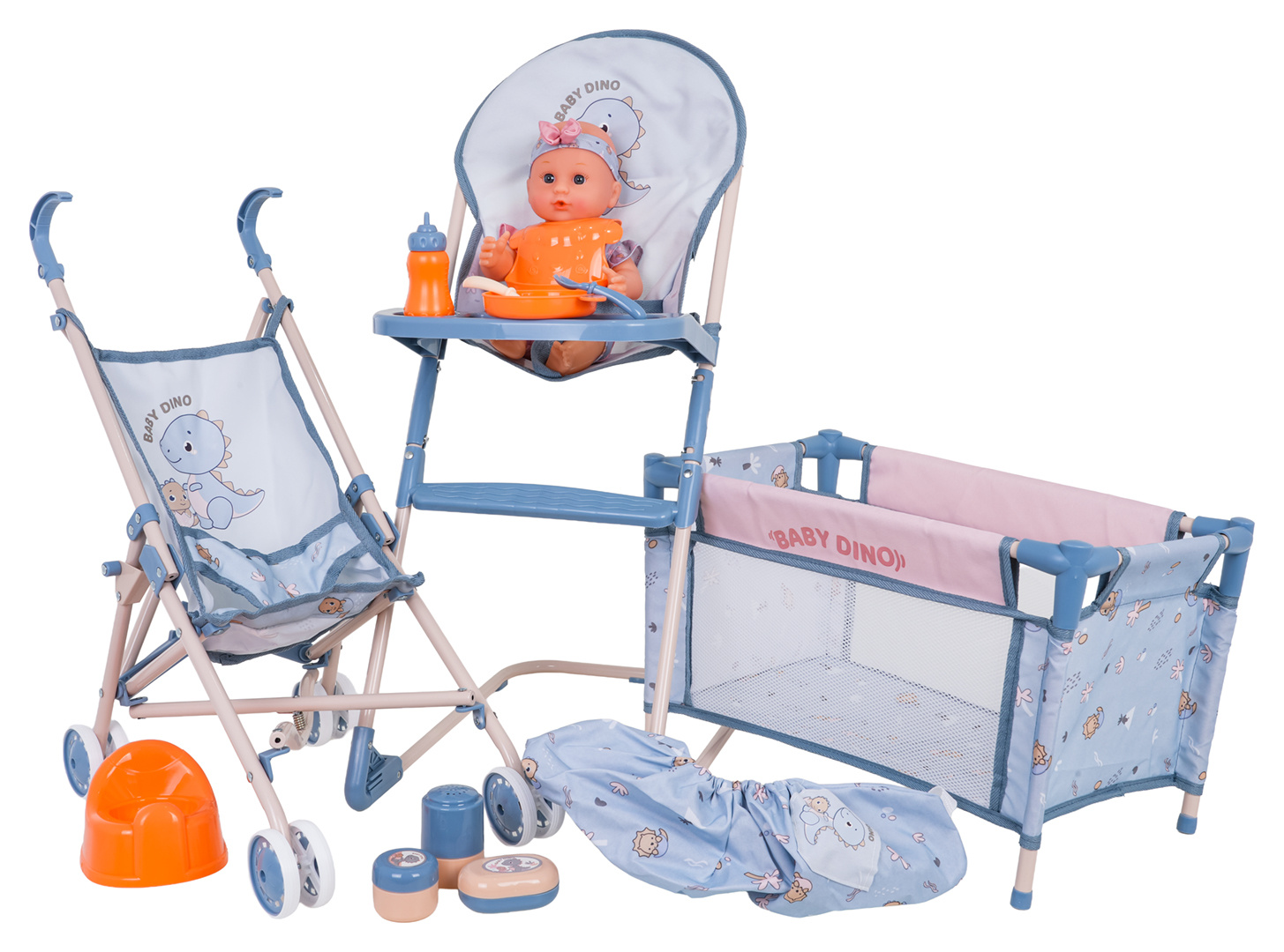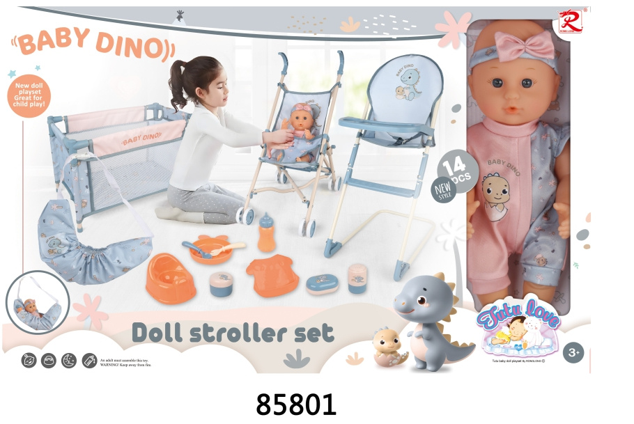 Bohatě vybavená sada panenka a doplňky pro děti od tří let. Sada se skládá ze 14 prvků vyrobených z nejkvalitnějších materiálů v živých barvách. Roztomilá panenka je oblečená v barevných dupačkách a na hlavičce má čelenku s mašličkou. Lala má pohyblivé ručičky a nožičky. V sadě s panenkou je také cestovní postýlka, sportovní kočárek, jídelní židlička, nočník, láhev a příslušenství pro krmení a péči.
