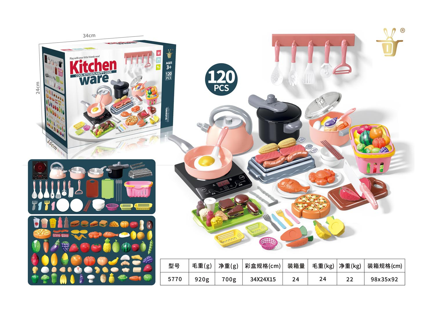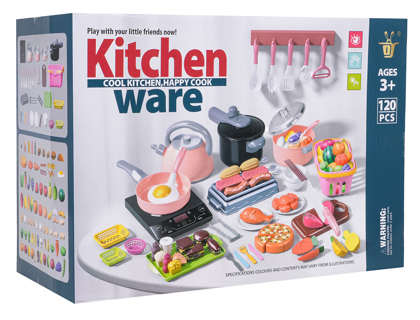Bohatě vybavená sada kuchyňských doplňků pro děti starší tří let. Sada se skládá ze 120 prvků vyrobených z nejkvalitnějších materiálů v živých barvách, které povzbuzují děti ke hře. V sadě můžeme najít hrnce, sporák, nákupní košík, atrapy zeleniny a ovoce a mnoho dalších prvků. Sporák je napájen bateriemi typu 3 x AA 1,5V (baterie nejsou součástí balení).