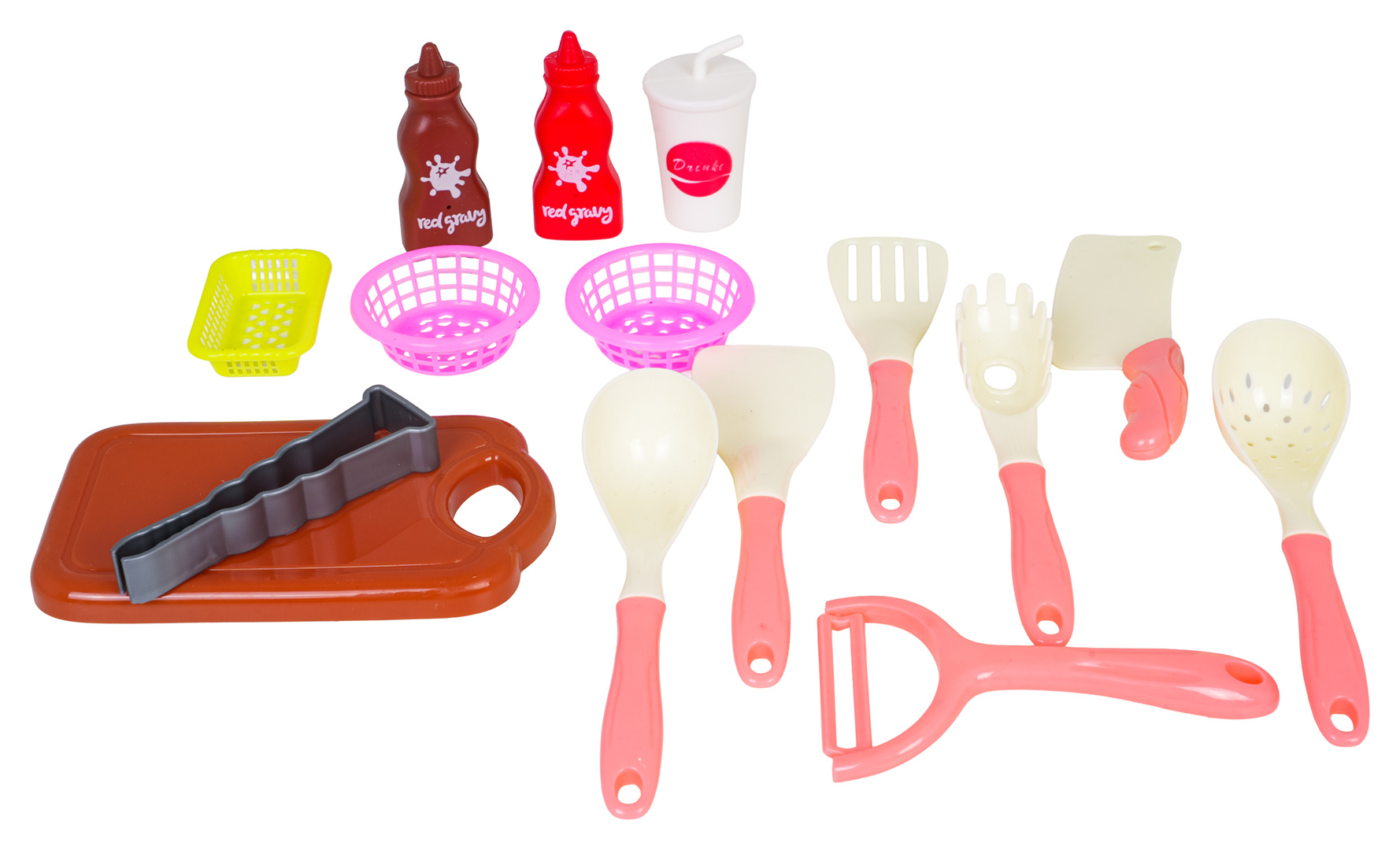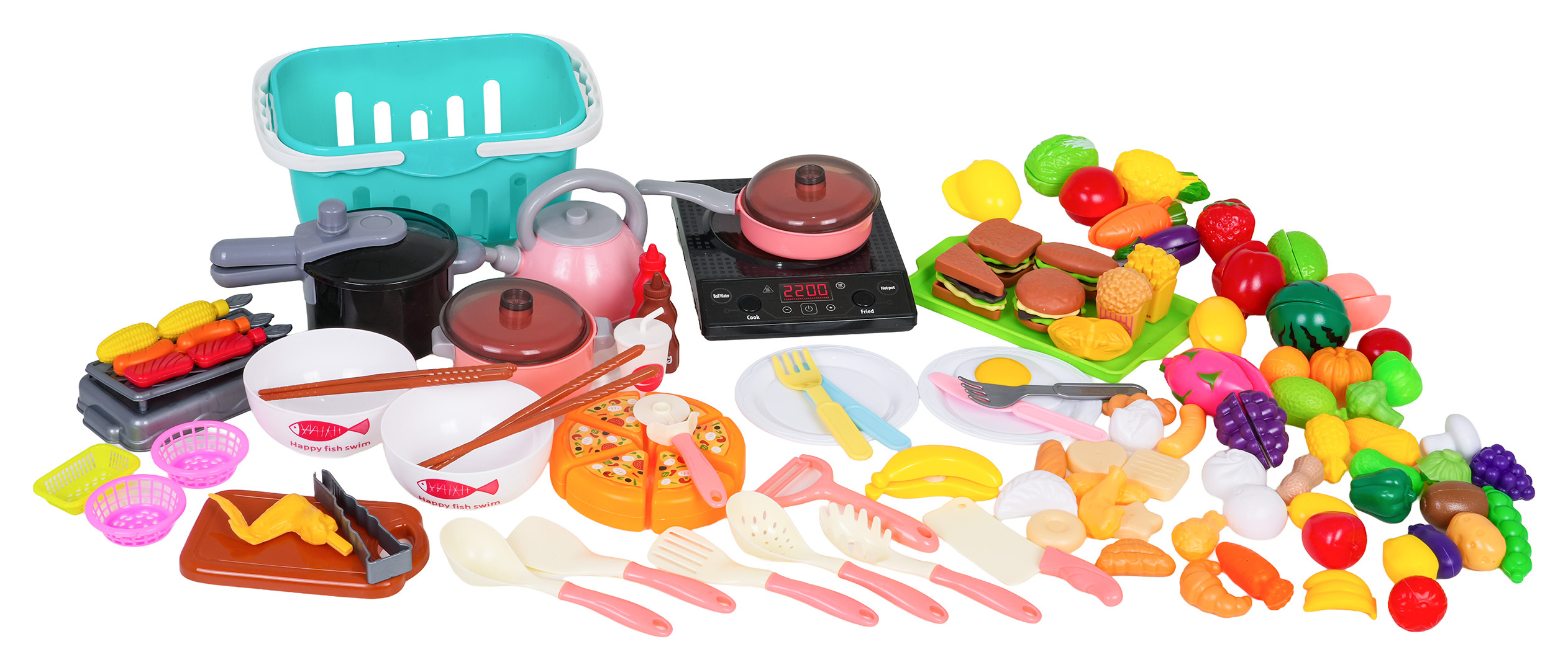- atrapy potravin: nápoj v kelímku, pizza na suchý zip, sendvič, volské oko, popcorn, hranolky, kečup, omáčka, hot dog, hamburger, toast, ananas na suchý zip, jahoda na suchý zip, salát na suchý zip, broskev na suchý zip, citron na suchý zip, rajče na suchý zip, meloun na suchý zip, červená paprika na suchý zip, hroznové víno na suchý zip, mrkev na suchý zip, banán na suchý zip, 3x špíz na špejli, lilek na suchý zip, 2x pusinka, 2x knedlíček, dýně, lilek, hroznové víno, zelený hrášek, brokolice, kukuřice, brambor, 3x salát, rajče, červená a zelená paprika, kiwi, žampion, jahoda, pomeranč, ananas, mrkev, banány, lískový ořech, citron, kuřecí stehýnko, kuřecí křidélko, kotleta, 3x sušenka, chléb, vánočka, rohlík.