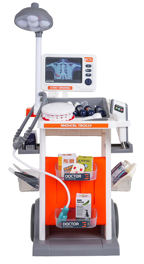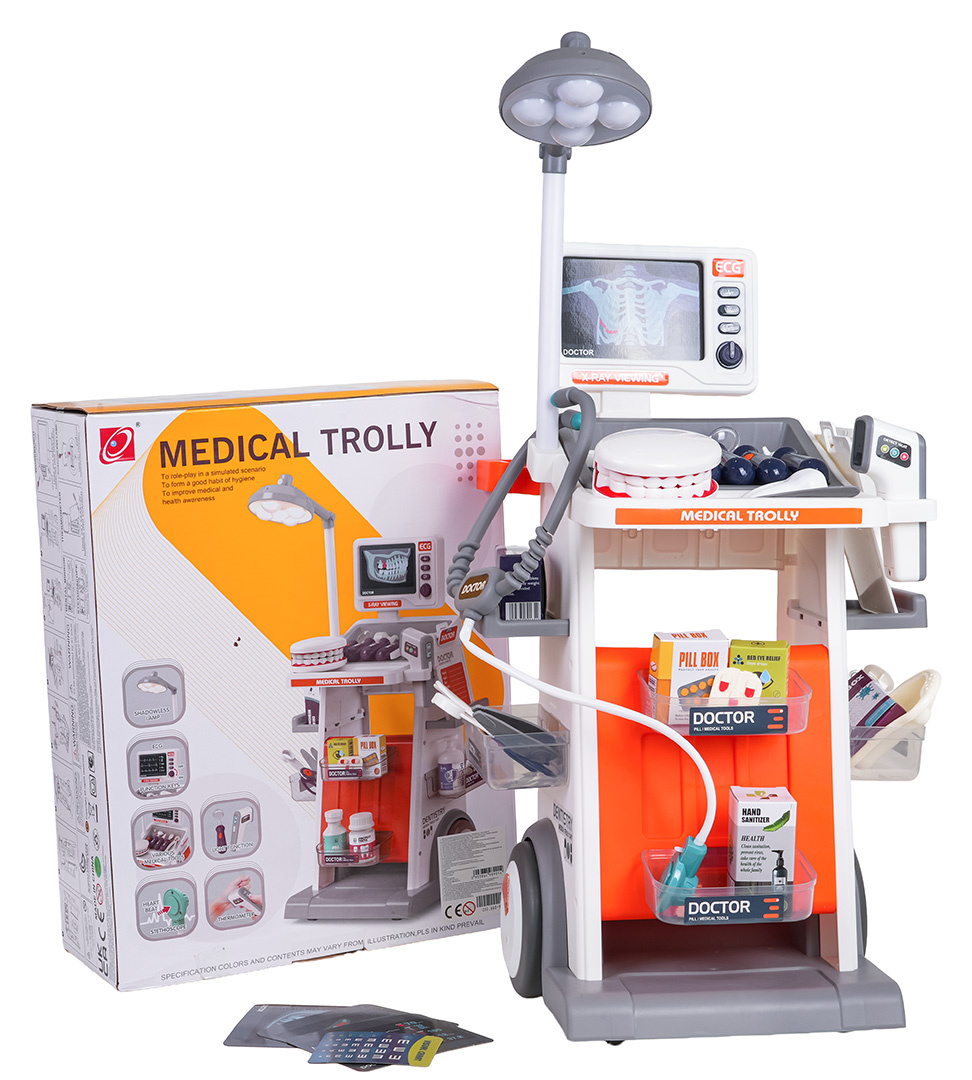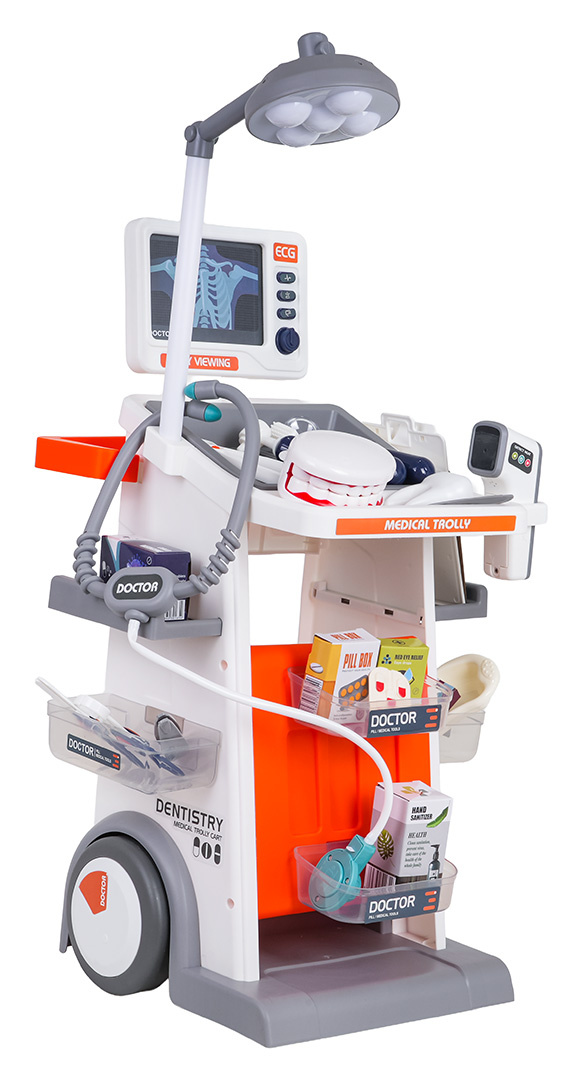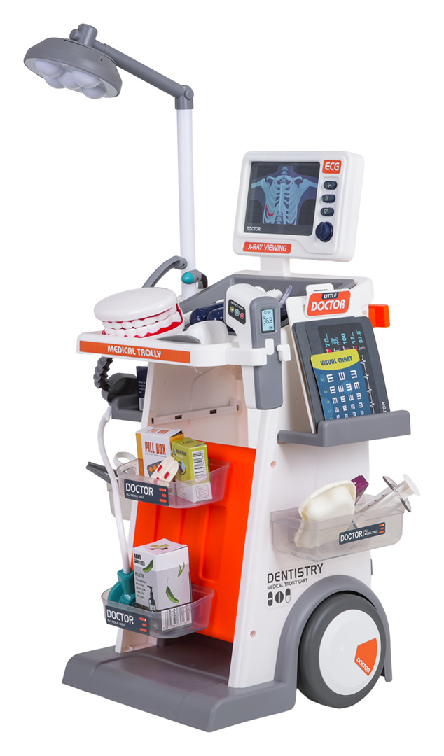 Bohatě vybavená lékařsko-zubní sada s vozíkem, zvukovými a světelnými efekty pro děti od tří let. Všechny prvky sady jsou vyrobeny z plastu nejvyšší kvality. Lékařský vozík má velká kola, je snadno ovladatelný. Umístí na poličky všechny lékařské a zubní doplňky. Na vrchu vozíku je umístěn panel se zvukovými a světelnými efekty a vyměnitelnými nástavci pro fotografie s prosvětlením. Zubní zrcátko a teploměr mají podsvícení, a stetoskop zvuky tlukotu srdce. Lampička umístěná na vozíku je také podsvícená. Sada se skvěle prezentuje, vaše ratolest se může vžít do role lékaře. Lampa je napájena bateriemi typu 2 x AA 1,5V (nejsou součástí balení), teploměr bateriemi typu 2 x AAA 1,5 V (nejsou součástí balení), zubní zrcátko bateriemi typu 2 x AG10 (v balení), stetoskop bateriemi typu 2 x AG13 (v balení), panel ECG bateriemi typu 2 x AAA 1,5V (nejsou součástí balení).