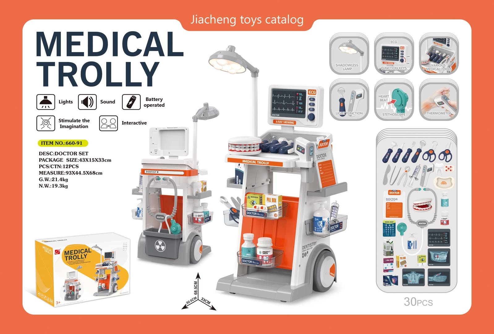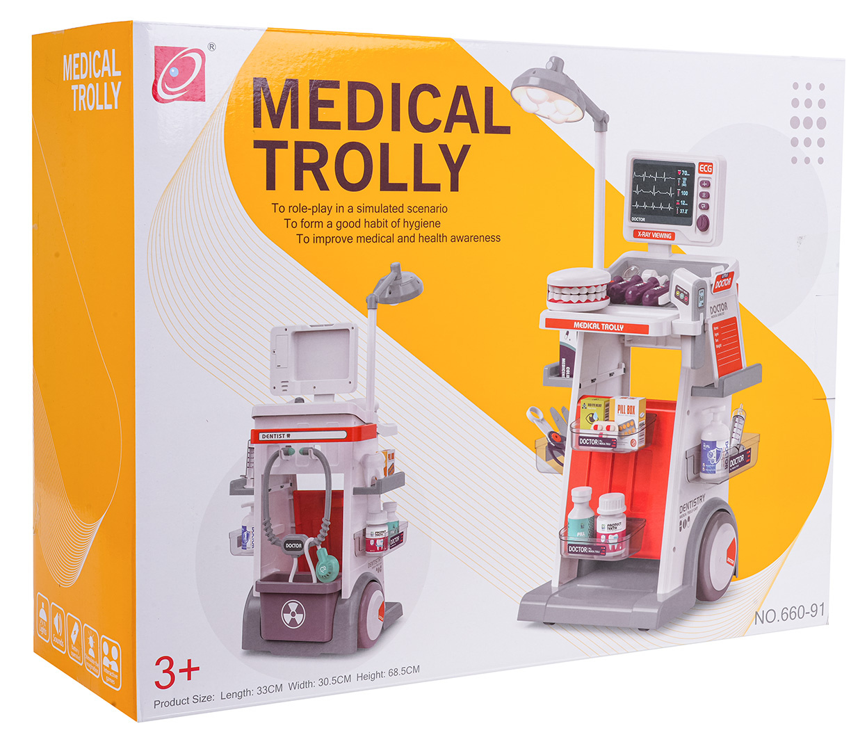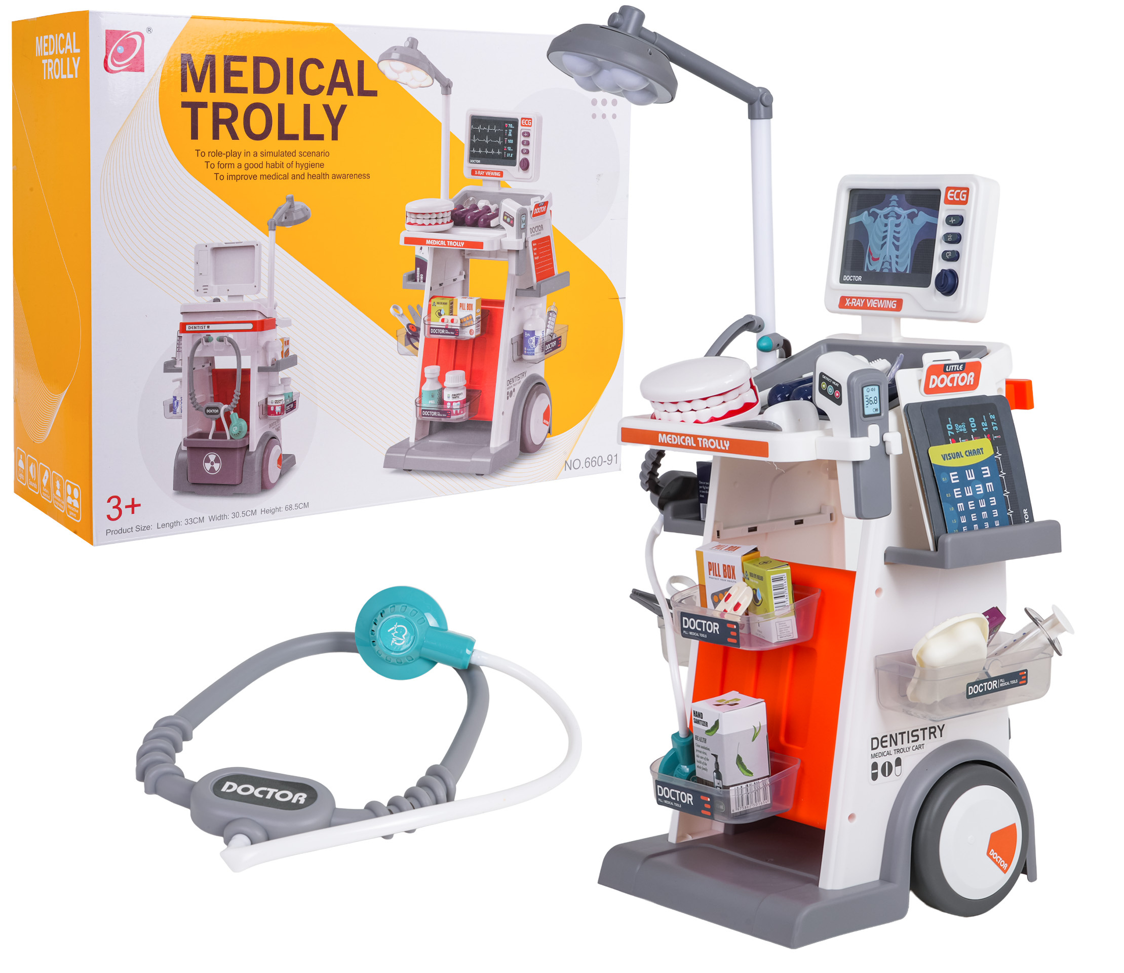 Bohatě vybavená lékařsko-zubní sada s vozíkem, zvukovými a světelnými efekty pro děti od tří let. Všechny prvky sady jsou vyrobeny z plastu nejvyšší kvality. Lékařský vozík má velká kola, je snadno ovladatelný. Umístí na poličky všechny lékařské a zubní doplňky. Na vrchu vozíku je umístěn panel se zvukovými a světelnými efekty a vyměnitelnými nástavci pro fotografie s prosvětlením. Zubní zrcátko a teploměr mají podsvícení, a stetoskop zvuky tlukotu srdce. Lampička umístěná na vozíku je také podsvícená. Sada se skvěle prezentuje, vaše ratolest se může vžít do role lékaře. Lampa je napájena bateriemi typu 2 x AA 1,5V (nejsou součástí balení), teploměr bateriemi typu 2 x AAA 1,5 V (nejsou součástí balení), zubní zrcátko bateriemi typu 2 x AG10 (v balení), stetoskop bateriemi typu 2 x AG13 (v balení), panel ECG bateriemi typu 2 x AAA 1,5V (nejsou součástí balení).