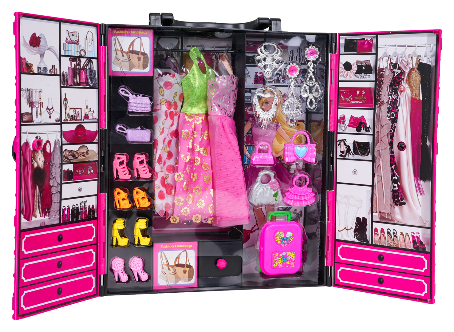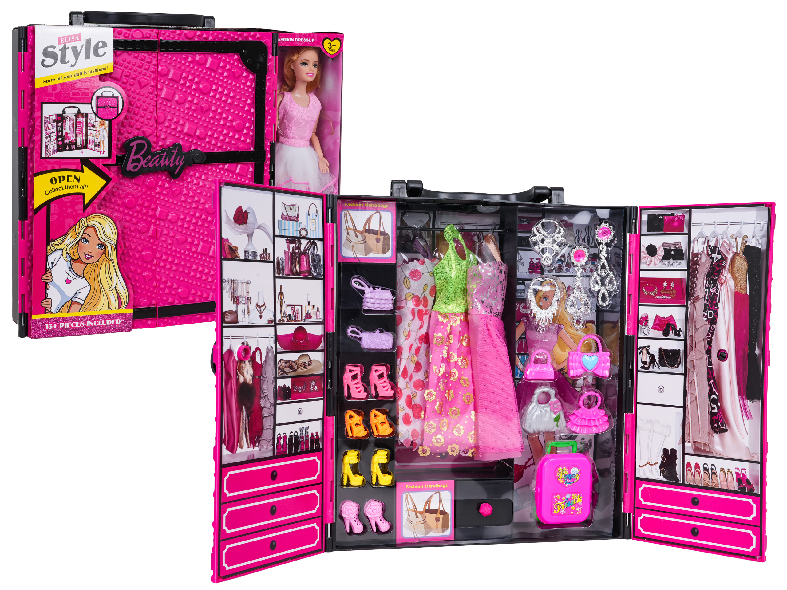 Úžasná, velká, barevná sada šatníku + panenka pro děti od tří let. Sada se skládá z 24 prvků vyrobených z nejkvalitnějších materiálů bezpečných pro dítě v živých barvách. Skříň má rukojeť pro přenášení, aby si ji vaše ratolest mohla vzít kamkoli s sebou. Zábava s touto sadou naučí dítě udržovat pořádek ve svém pokoji a dobře hospodařit s prostorem v šatníku.
