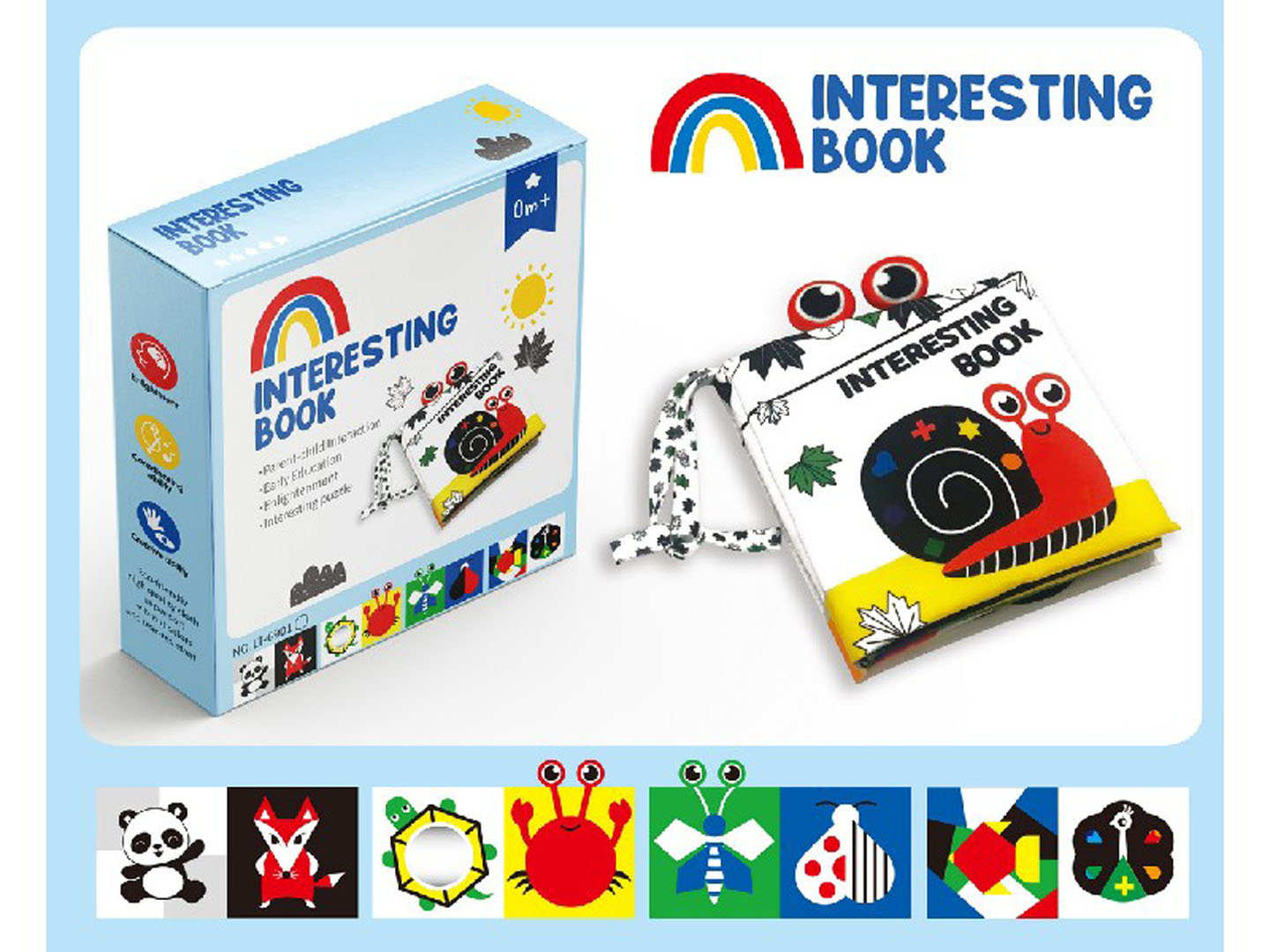 Senzorická knížka pro miminka od prvních dnů života. Knížka byla vyrobena z materiálů bezpečných pro kojence. Na vrchu knížky jsou všité 2 stužky a očko. První a poslední stránka je šustivá, uvnitř najdeme také zrcátko a pískátko. Knížka pomůže rozvinout schopnosti soustředění, koordinaci oko-ruka, bude podporou při učení barev a tvarů.