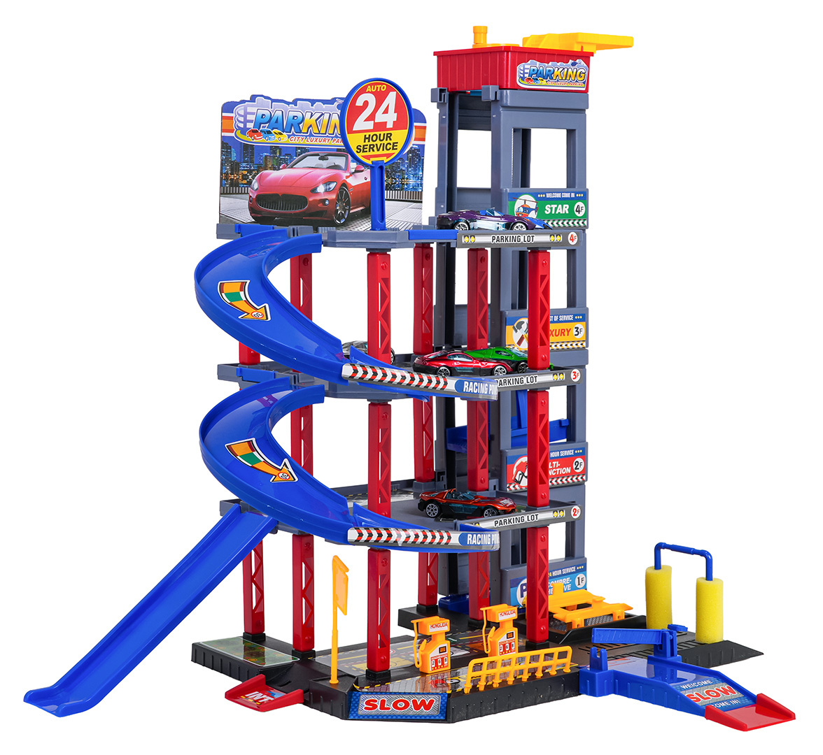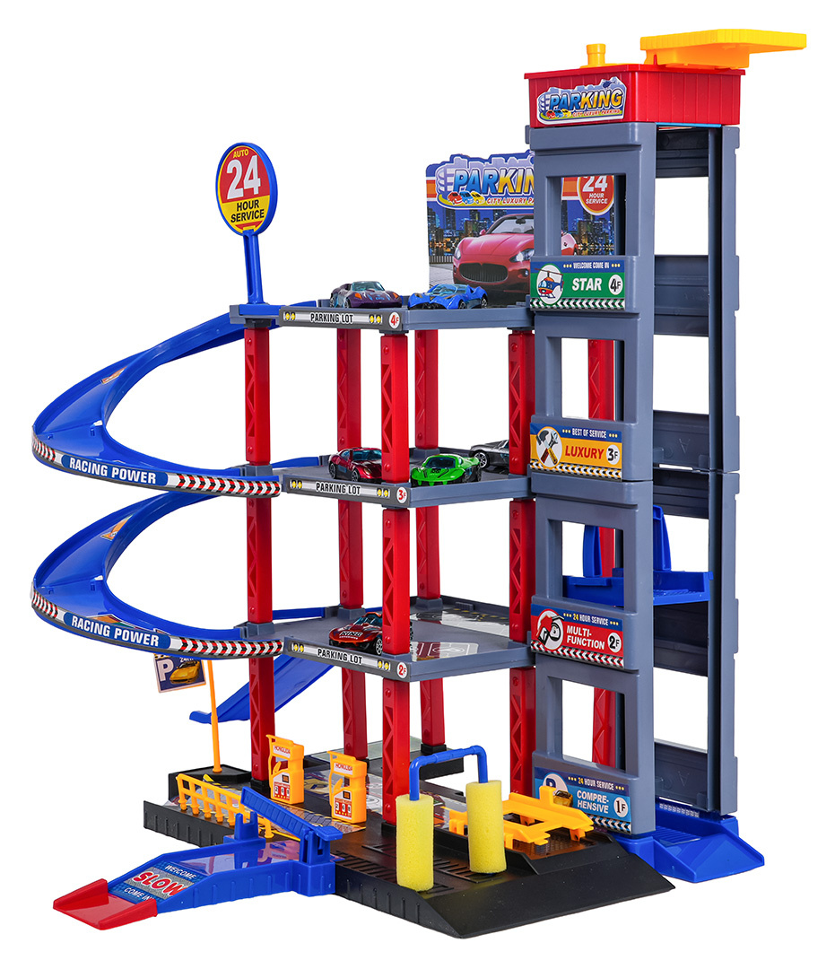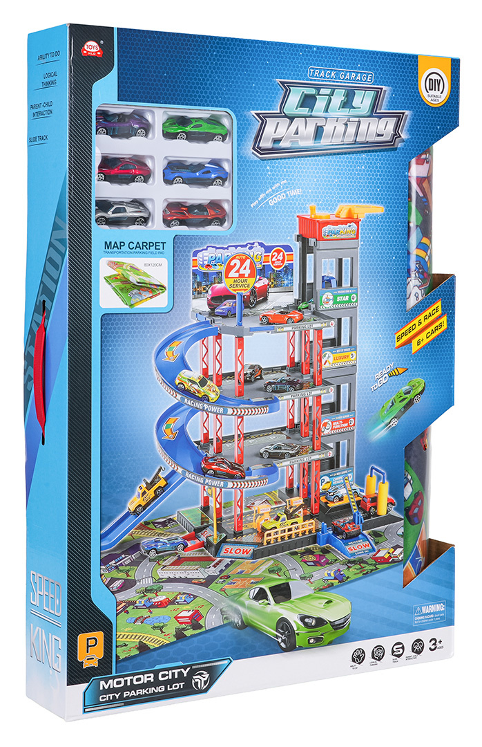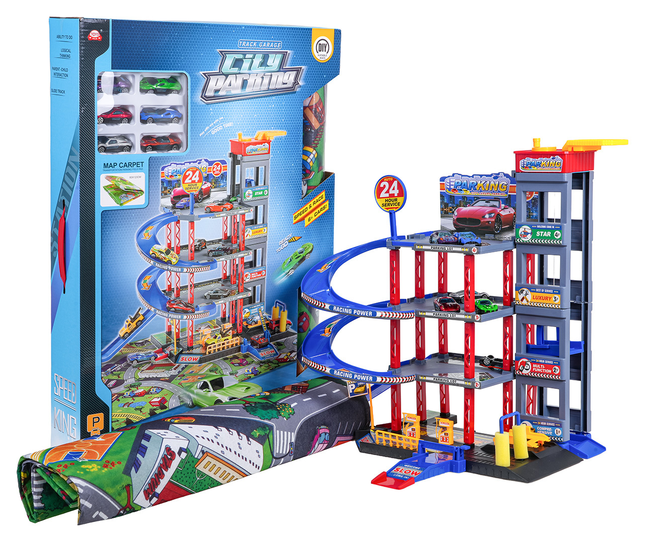 Velké interaktivní parkoviště s výtahem, stanicí, skluzavkami pro autíčka a podložkou s cestami je nabídkou pro děti od tří let. Parkoviště má několik úrovní, na které se lze dostat pomocí výtahu. Každá z úrovní je propojena s jinou skluzavkou pro autíčka. Víceúrovňové parkoviště má parkovací místa, čerpací stanici, zvedák pro auta, myčku a přistávací plochu pro vrtulníky. Výtah je ovládán ručně (kličkou). V sadě s parkovištěm se nachází také filcová podložka s ulicemi a až 6 vozidel typu angličáky.