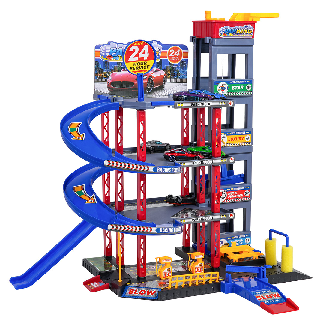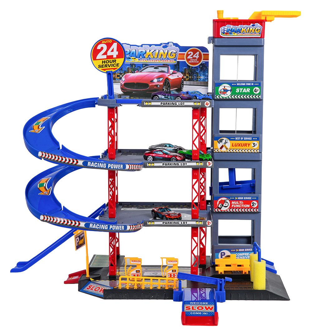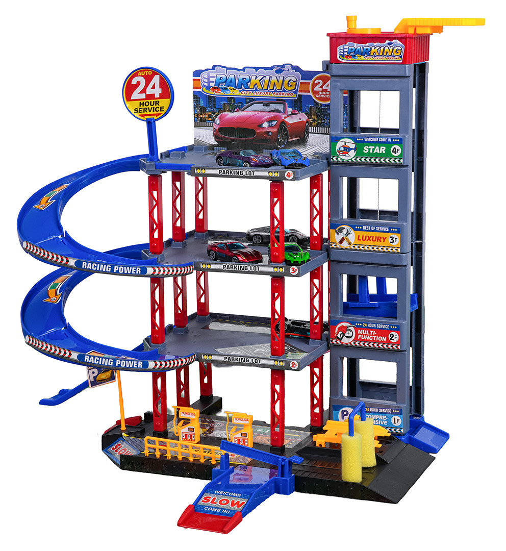 Velké interaktivní parkoviště s výtahem, stanicí, skluzavkami pro autíčka a podložkou s cestami je nabídkou pro děti od tří let. Parkoviště má několik úrovní, na které se lze dostat pomocí výtahu. Každá z úrovní je propojena s jinou skluzavkou pro autíčka. Víceúrovňové parkoviště má parkovací místa, čerpací stanici, zvedák pro auta, myčku a přistávací plochu pro vrtulníky. Výtah je ovládán ručně (kličkou). V sadě s parkovištěm se nachází také filcová podložka s ulicemi a až 6 vozidel typu angličáky.