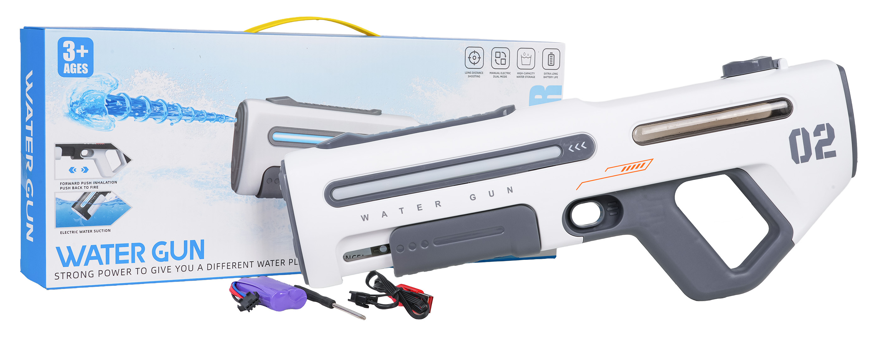 | Elektrická vodní pistole s podsvícením pro děti od tří let. Pistole je vyrobena z nejkvalitnějších materiálů, napájena je akumulátorem typu 7,4 V (včetně). Má podsvícení, což umožňuje zábavu i pozdě večer. Zásada fungování pistole je velmi jednoduchá. Doplníme nádržku umístěnou v horní části pistole vodou a stiskneme spoušť. Pistole může být také používána bez napájení, manuálně.