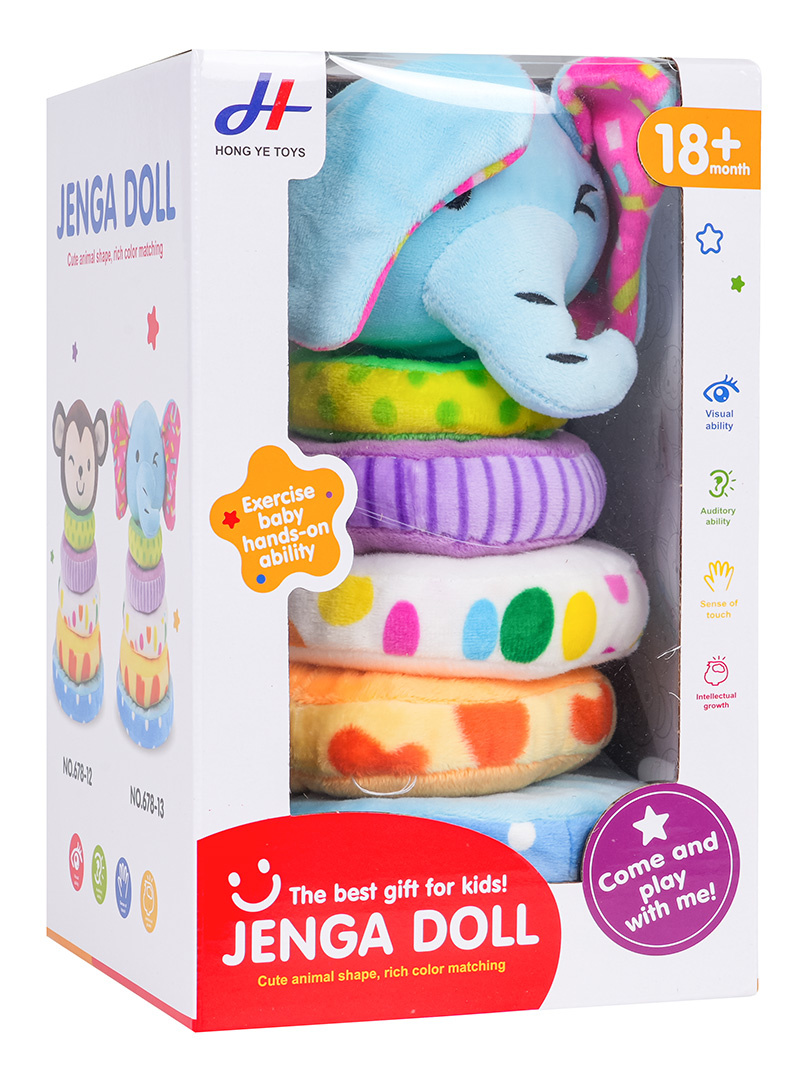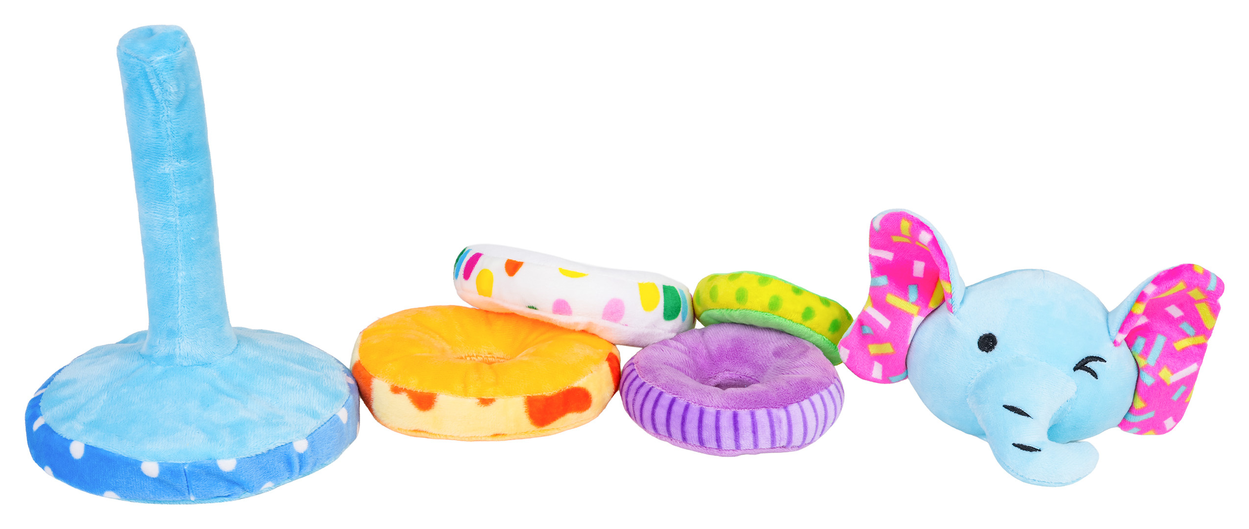 Měkká pyramida ve tvaru slona pro děti od osmnáctého měsíce života. Hračka je vyrobena z plyše, je příjemná na dotek, bohatství barev materiálů přitahuje pozornost dítěte a povzbuzuje ke hře. Sada se skládá ze základny, 4 měkkých kroužků různých velikostí a hlavy slona. Další výhodou hračky je pískátko umístěné v hlavičce, které vydává zvuk při stisknutí. Hračka procvičuje malé ruce, učí přizpůsobovat tvary.