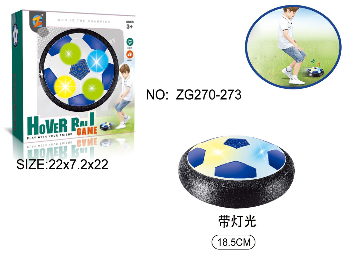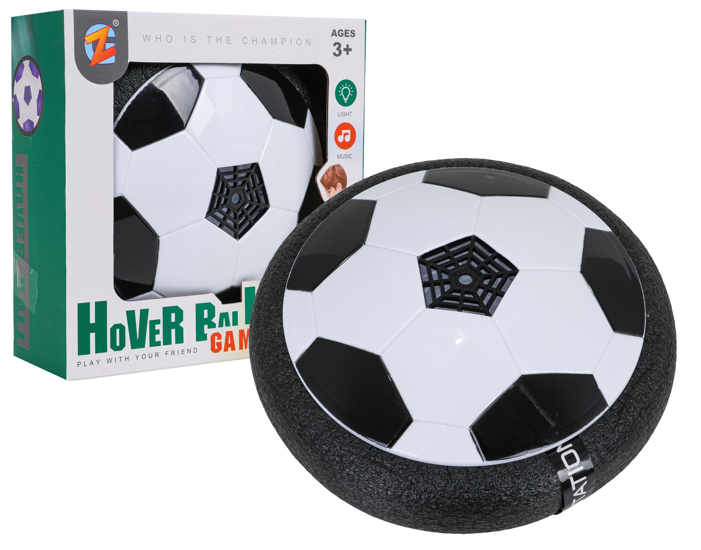 Míč na hraní se světelným efektem pro děti od tří let. Míč je napájen bateriemi typu 4 x AA 1,5 V (nejsou součástí balení). Po zapnutí má lehký proud vzduchu zespodu, který způsobuje, že se míč vznáší nad povrchem. Dodatečně má míč osvětlení.